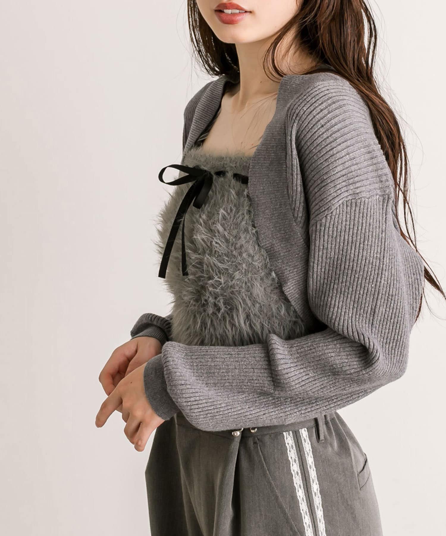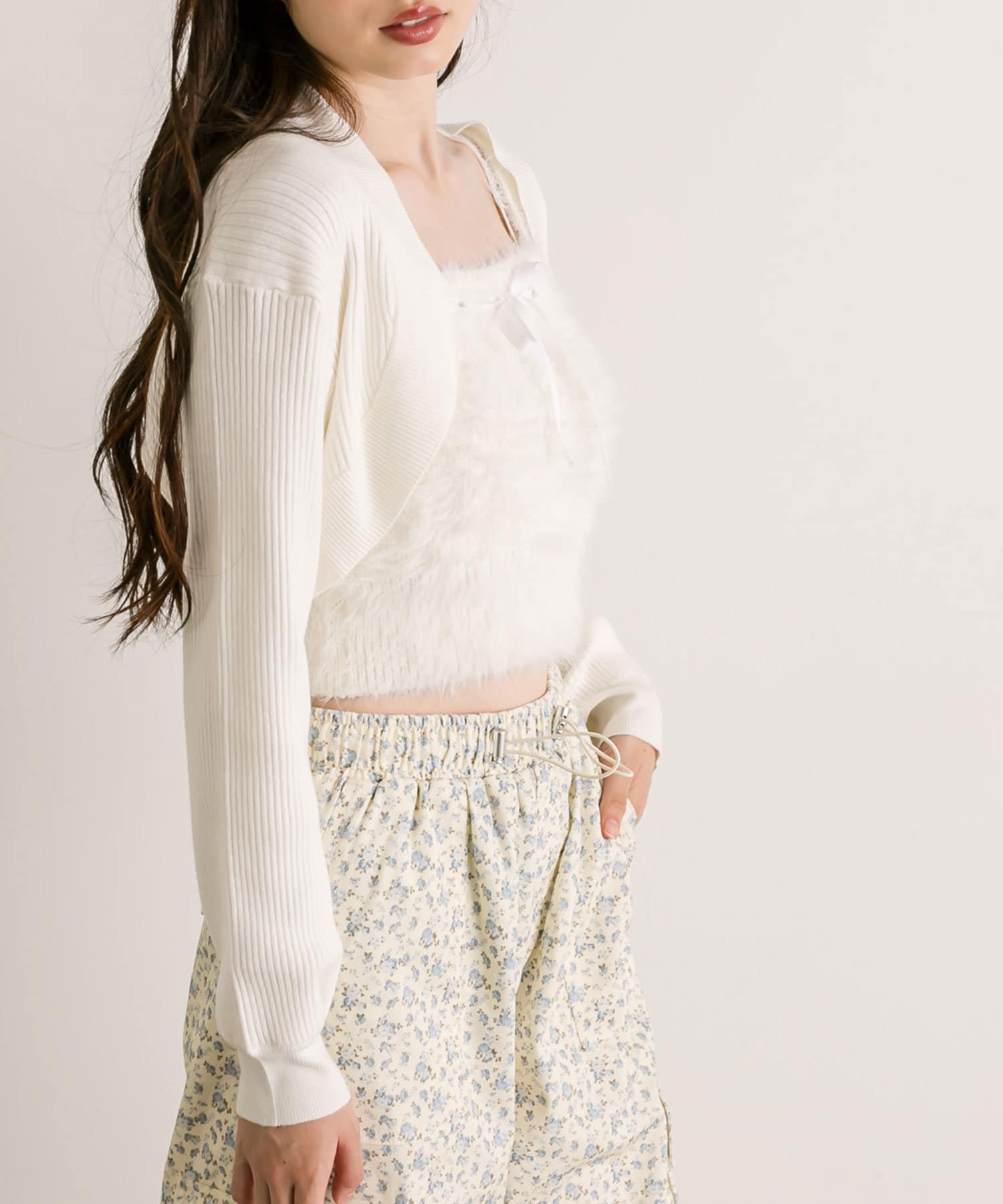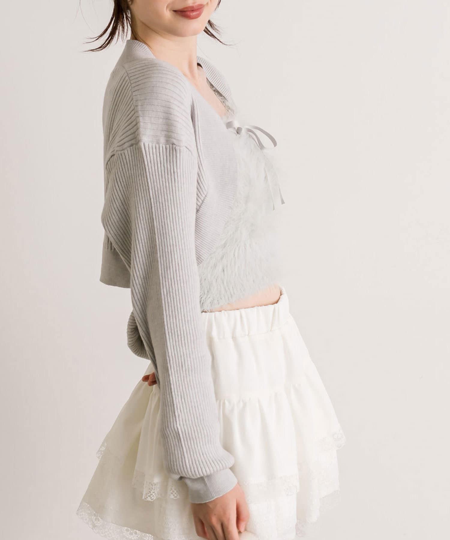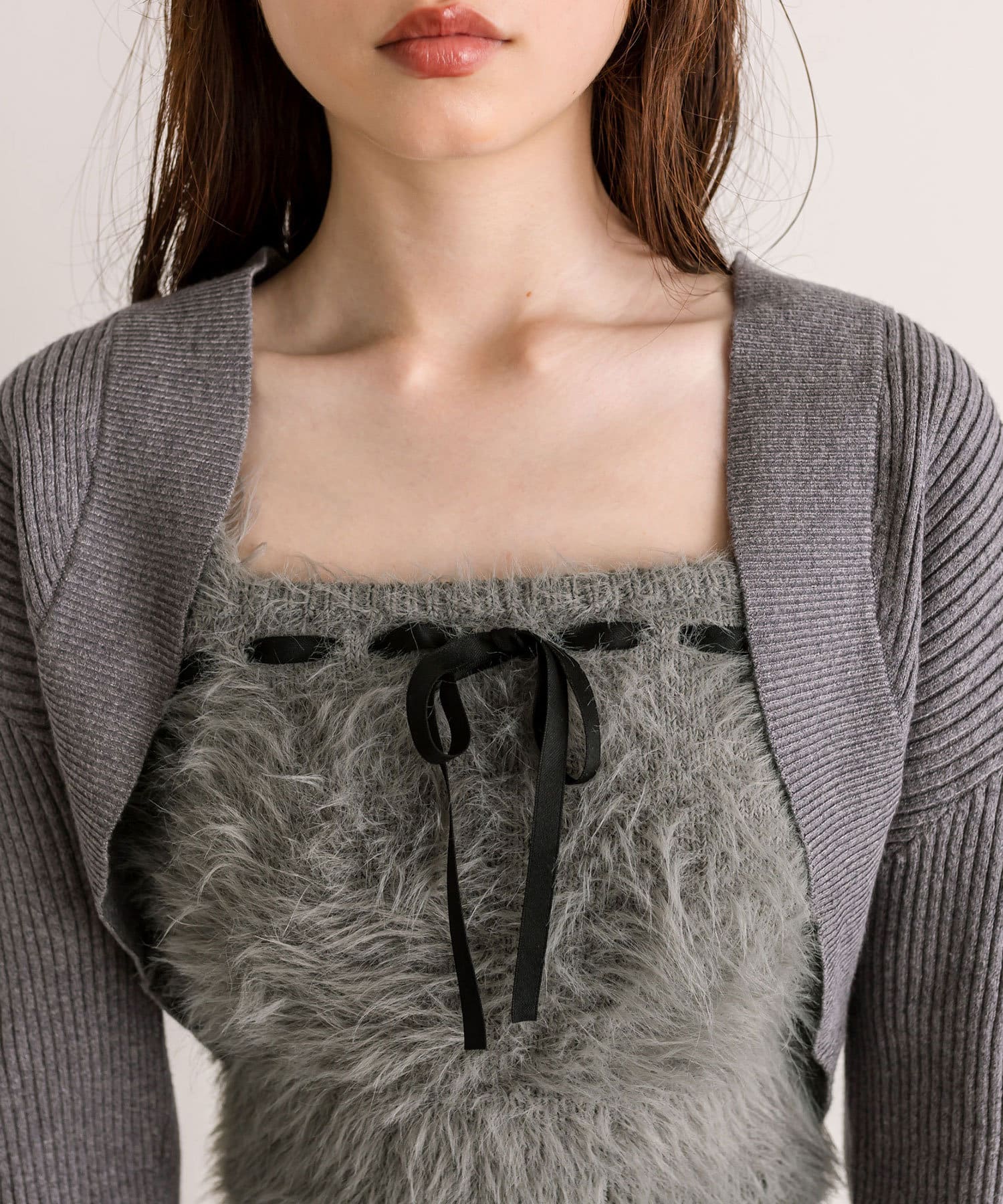 ・リボンがポイントのふわふわビスチェとシンプルで着回ししやすいリブ素材のボレロの異素材セットアイテム。