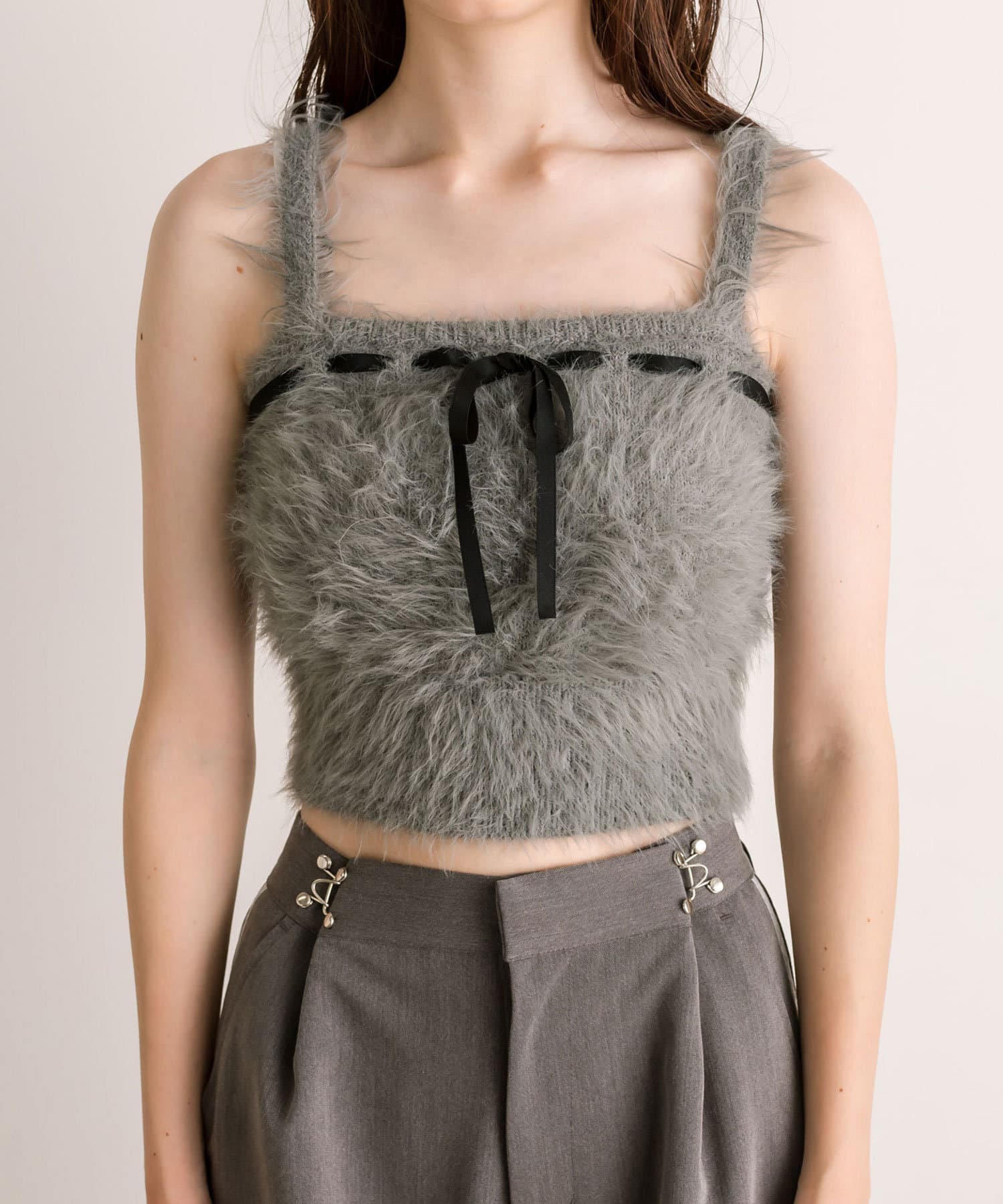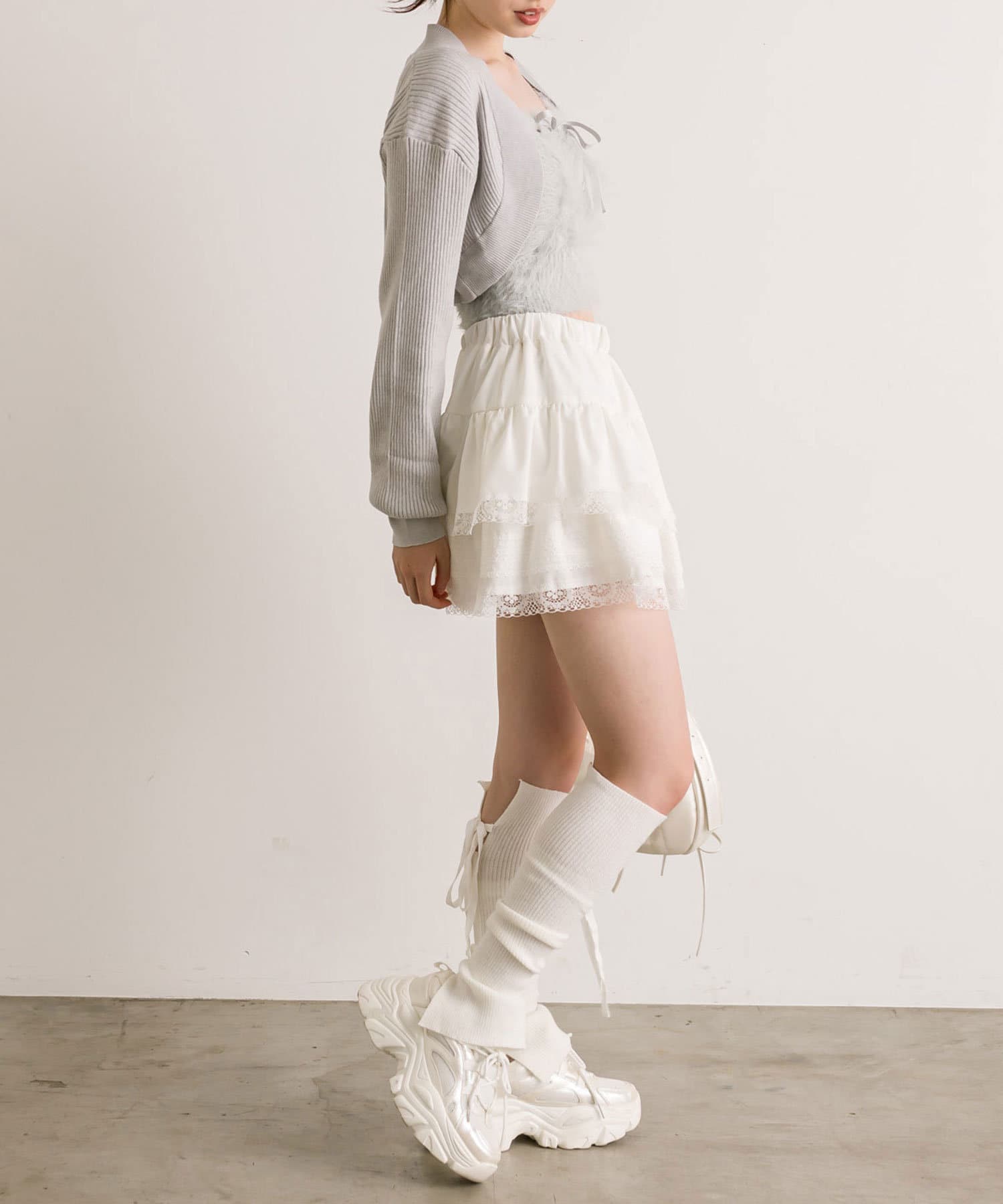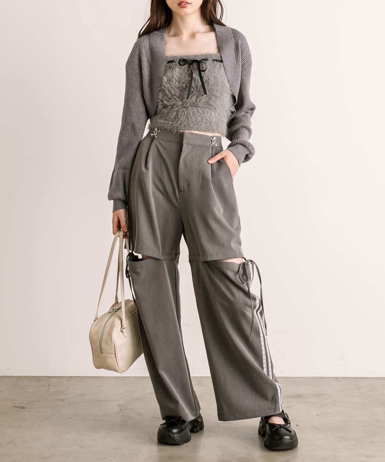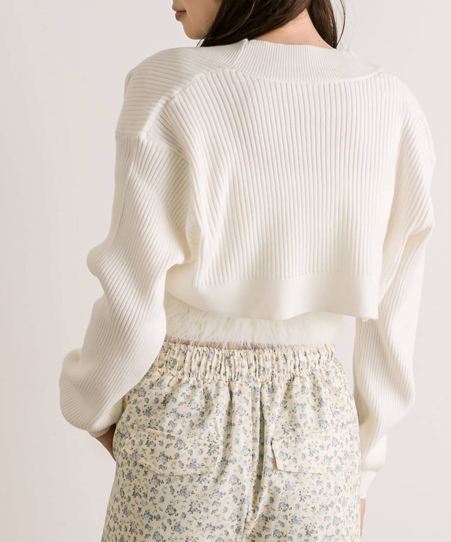 ・リボンがポイントのふわふわビスチェとシンプルで着回ししやすいリブ素材のボレロの異素材セットアイテム。