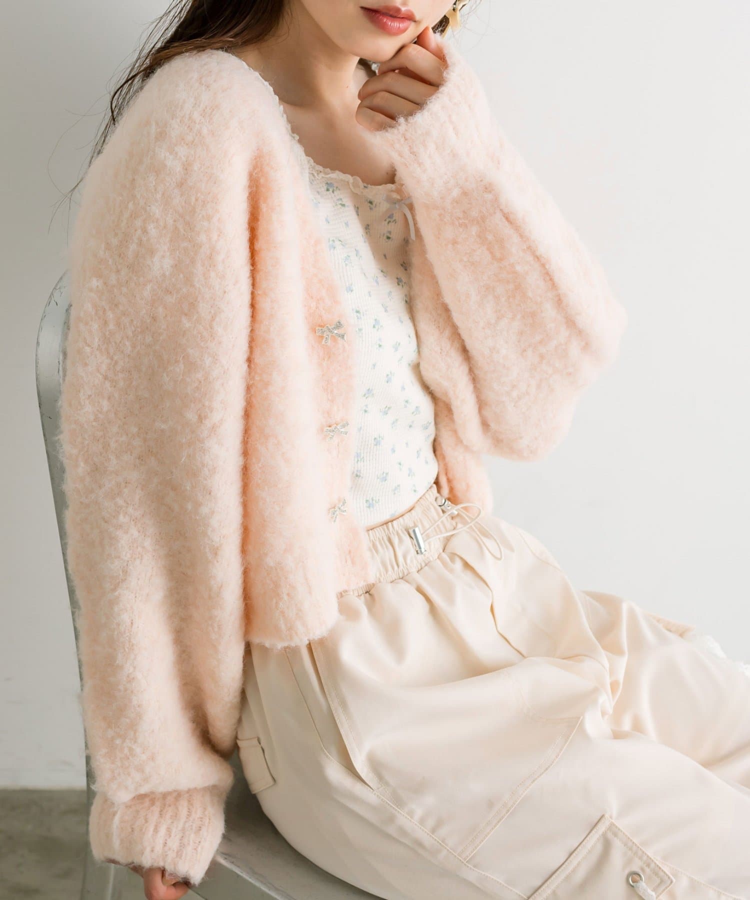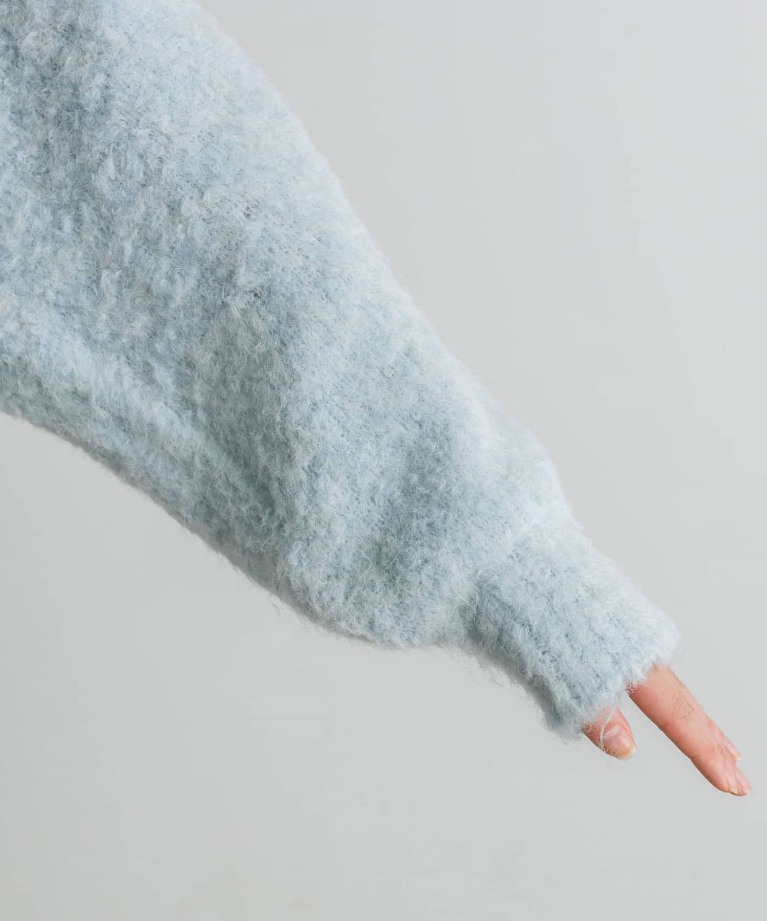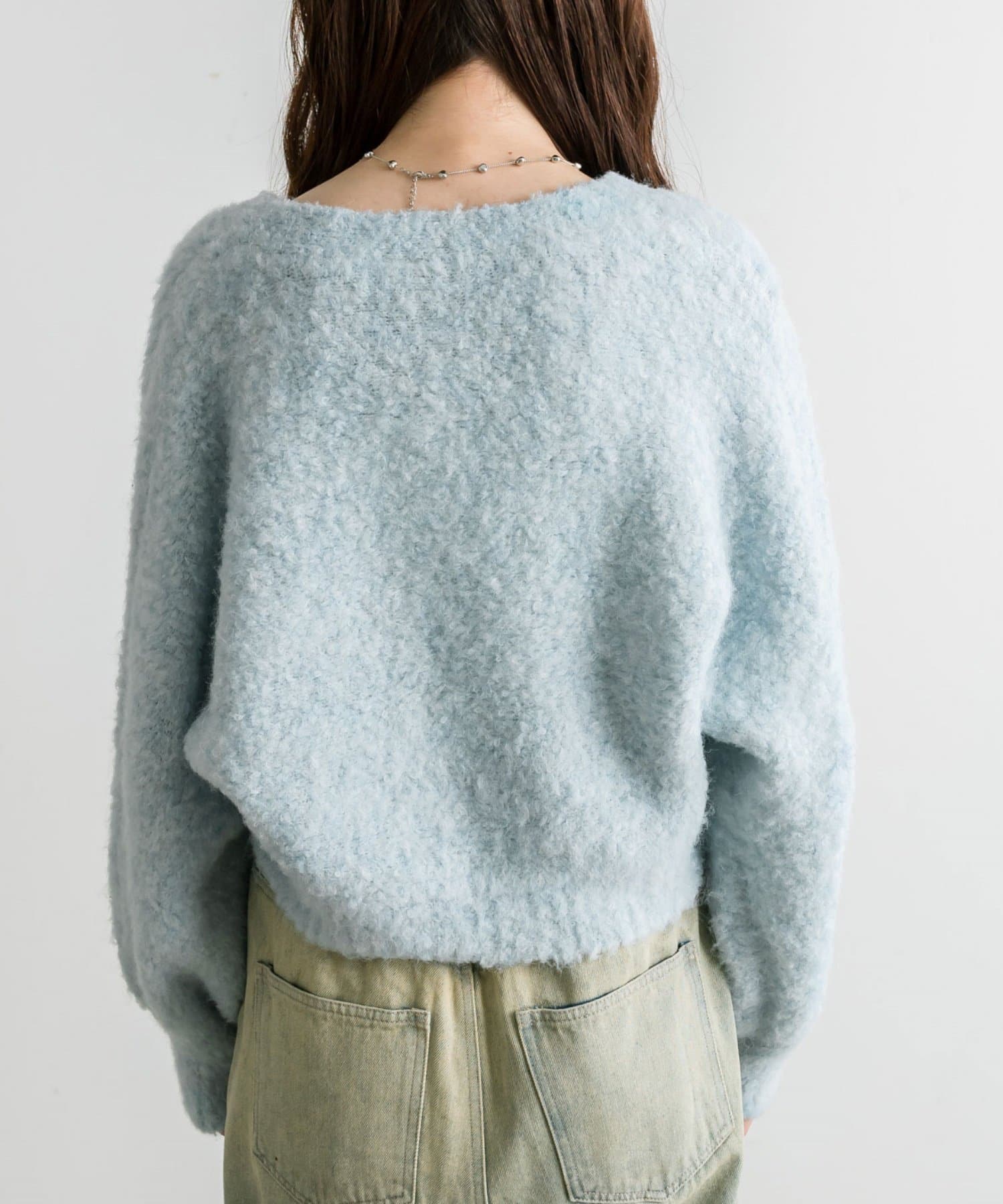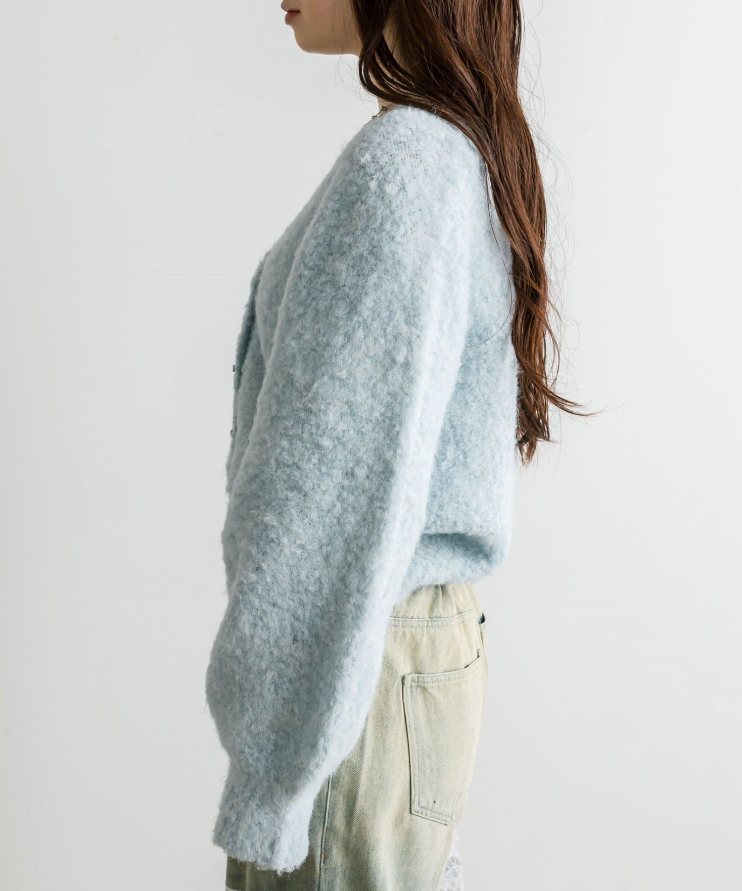 ・柔らかくふわふわの起毛感が特徴的な、ブークレ素材のカーディガン。
