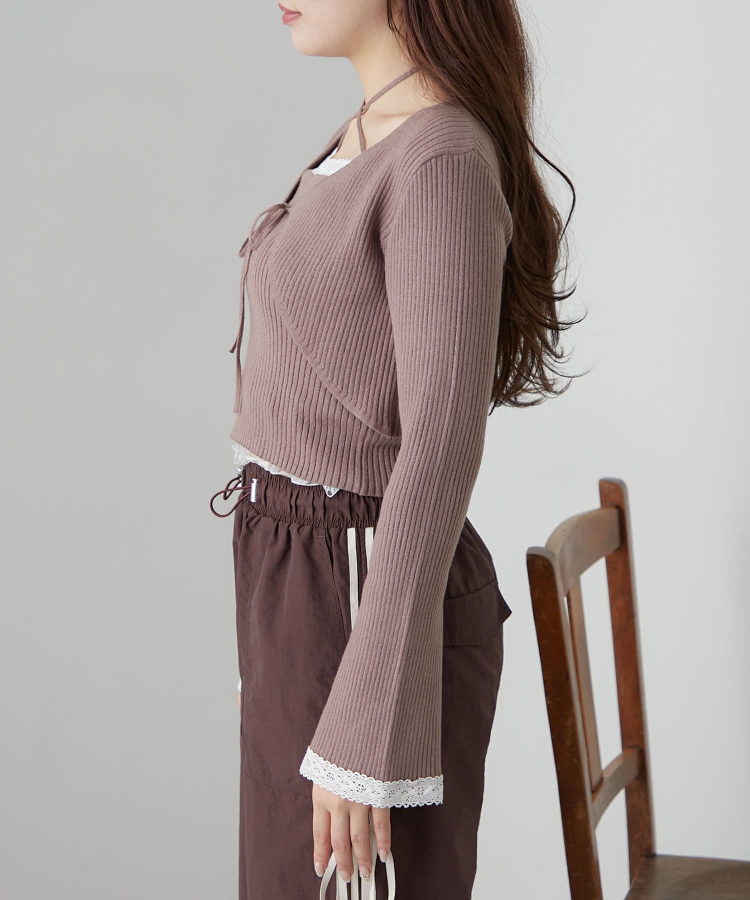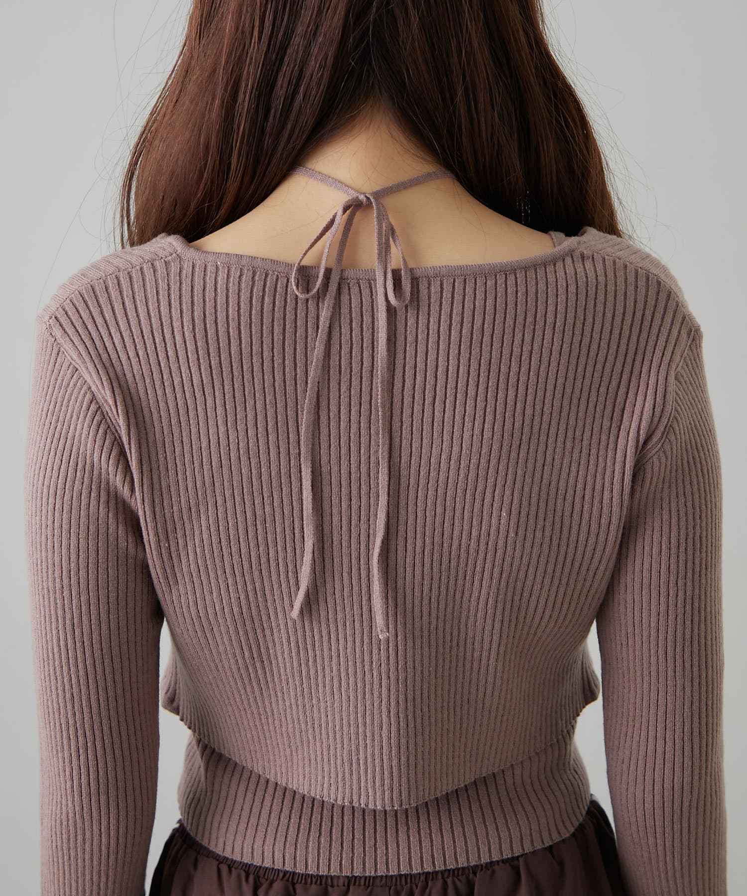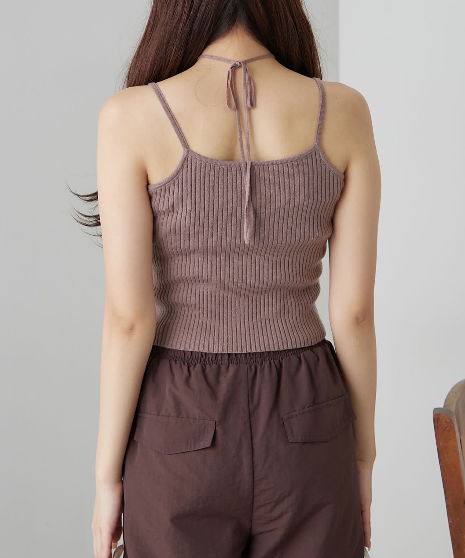 ・インナーは伸縮性のあるリブ素材で着心地よく、ホルターネックデザインなので後ろ姿もかわいく着れます。