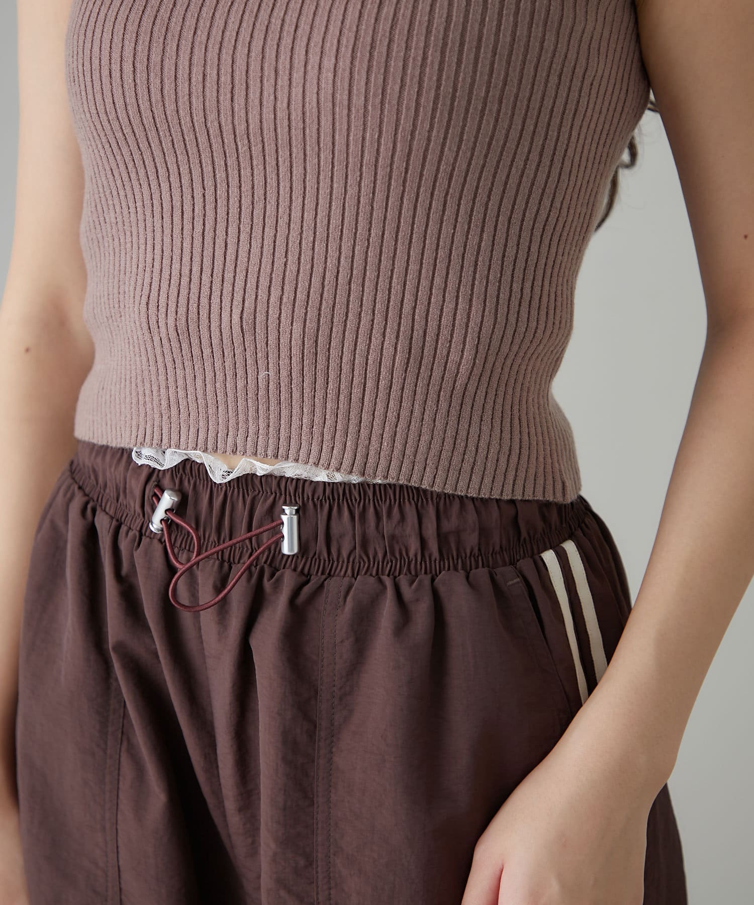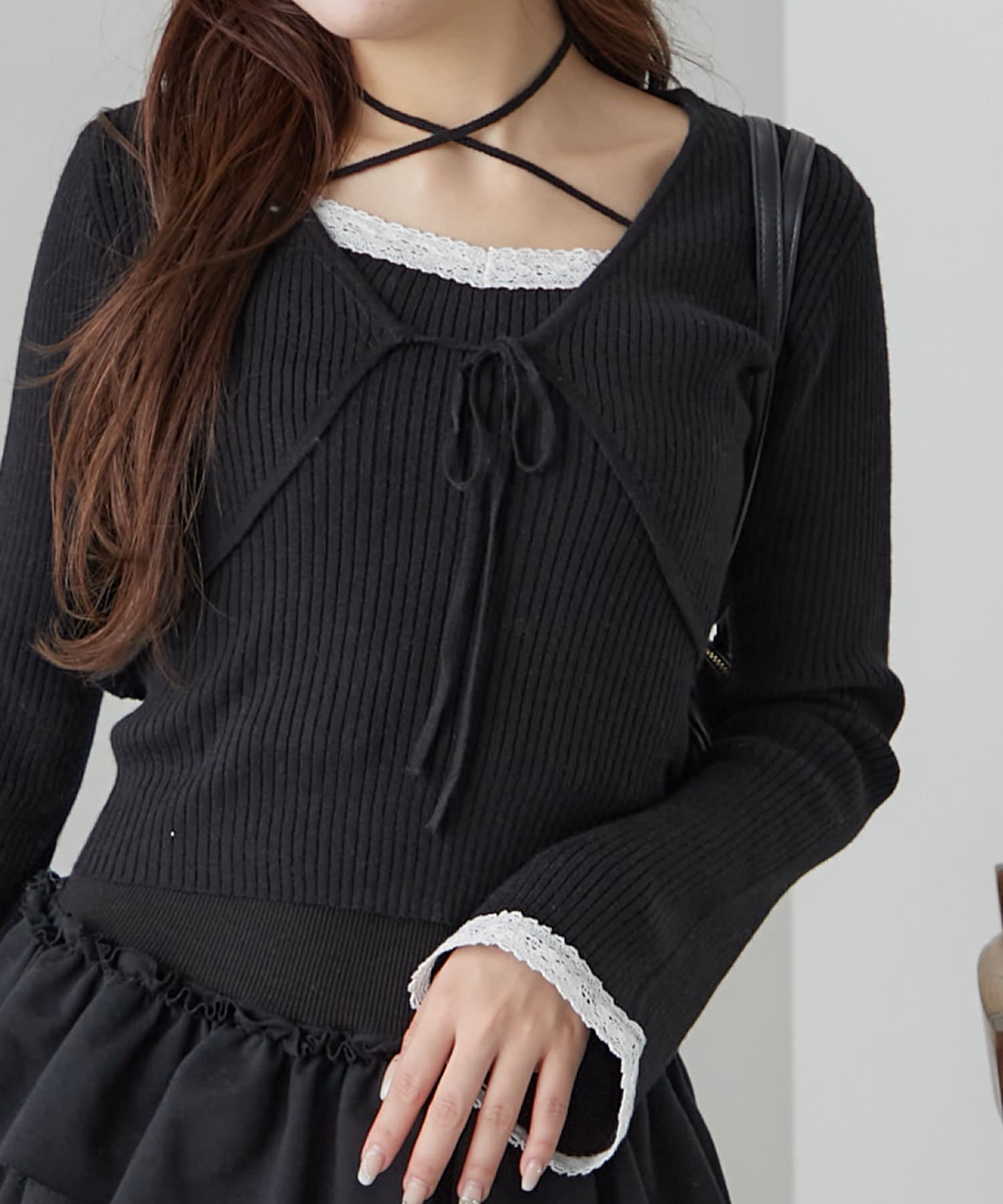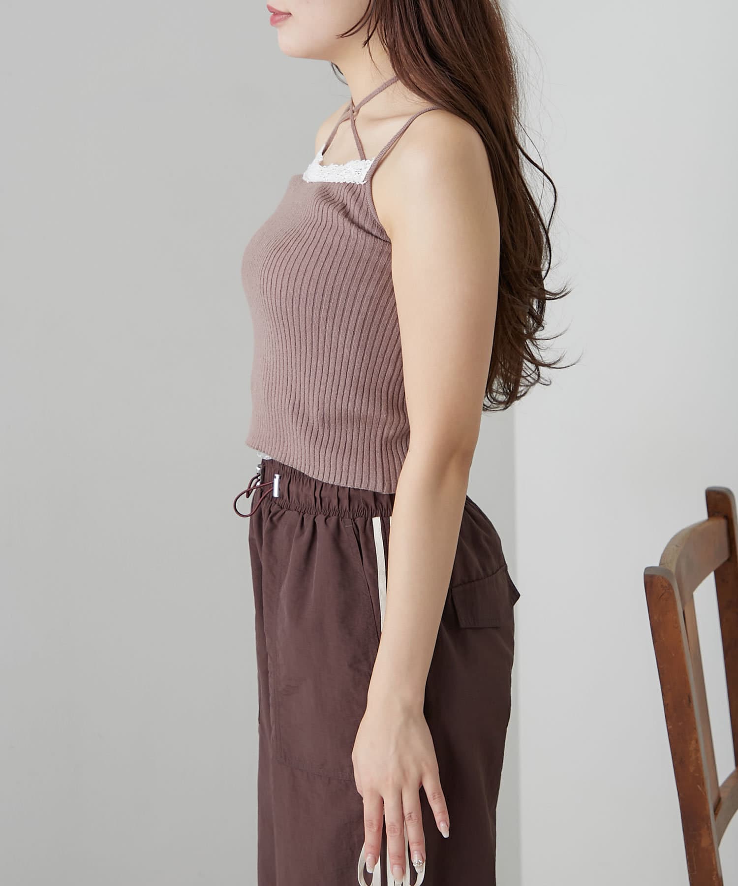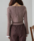 ・インナーは伸縮性のあるリブ素材で着心地よく、ホルターネックデザインなので後ろ姿もかわいく着れます。