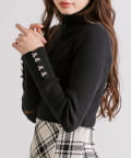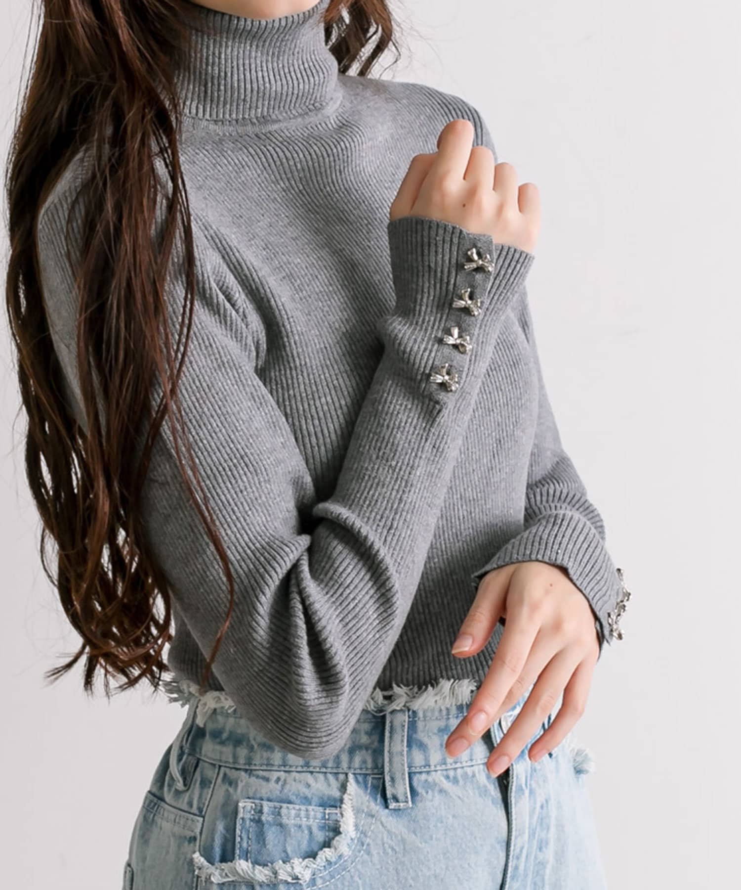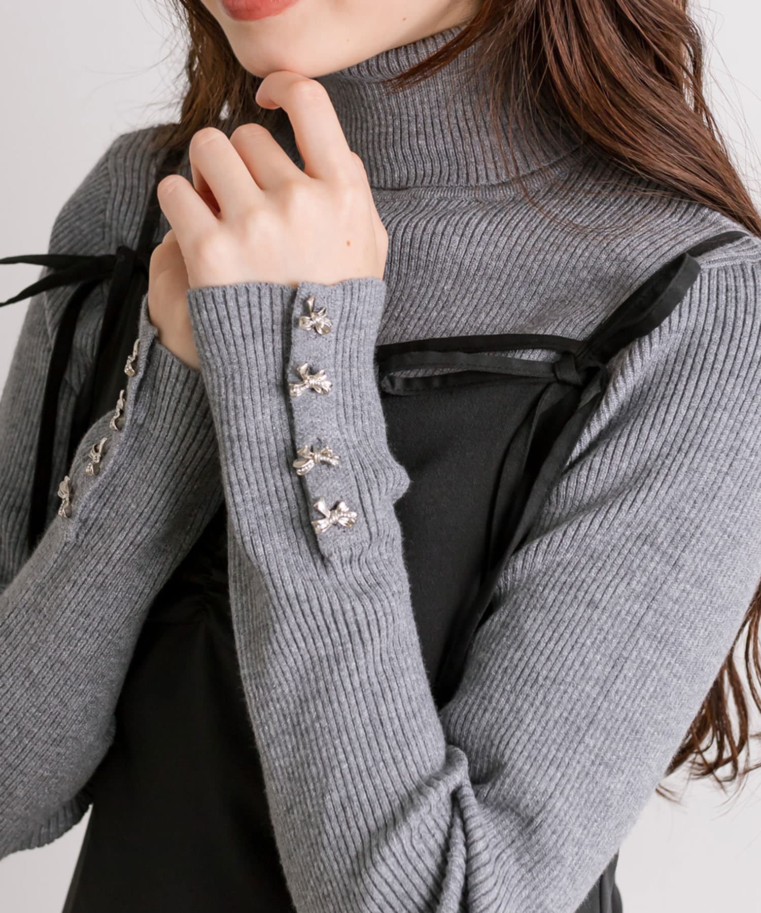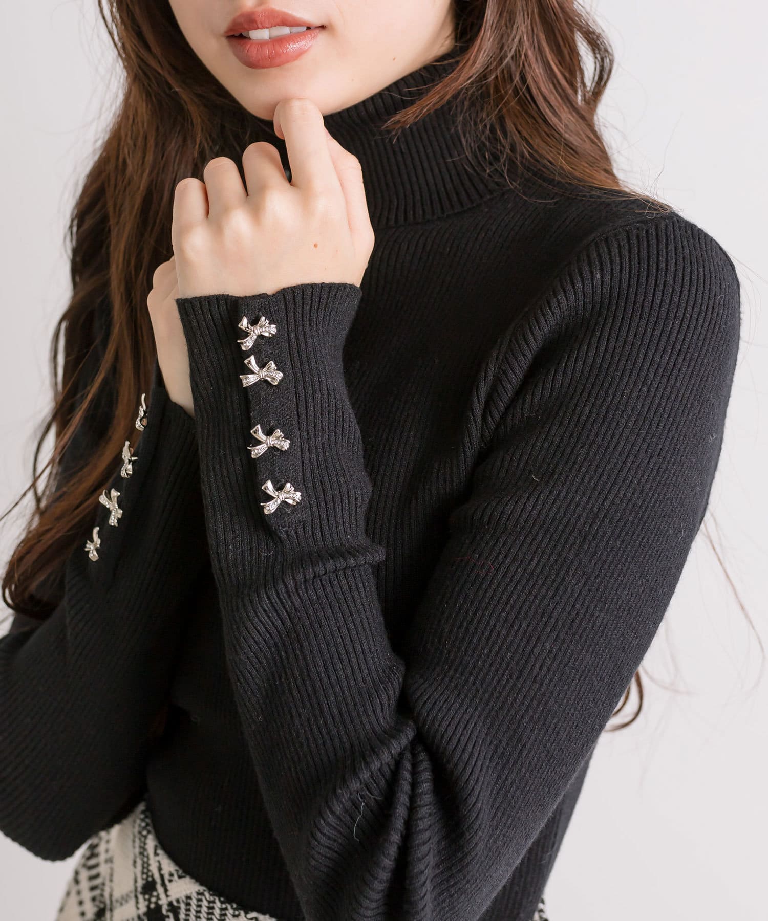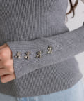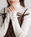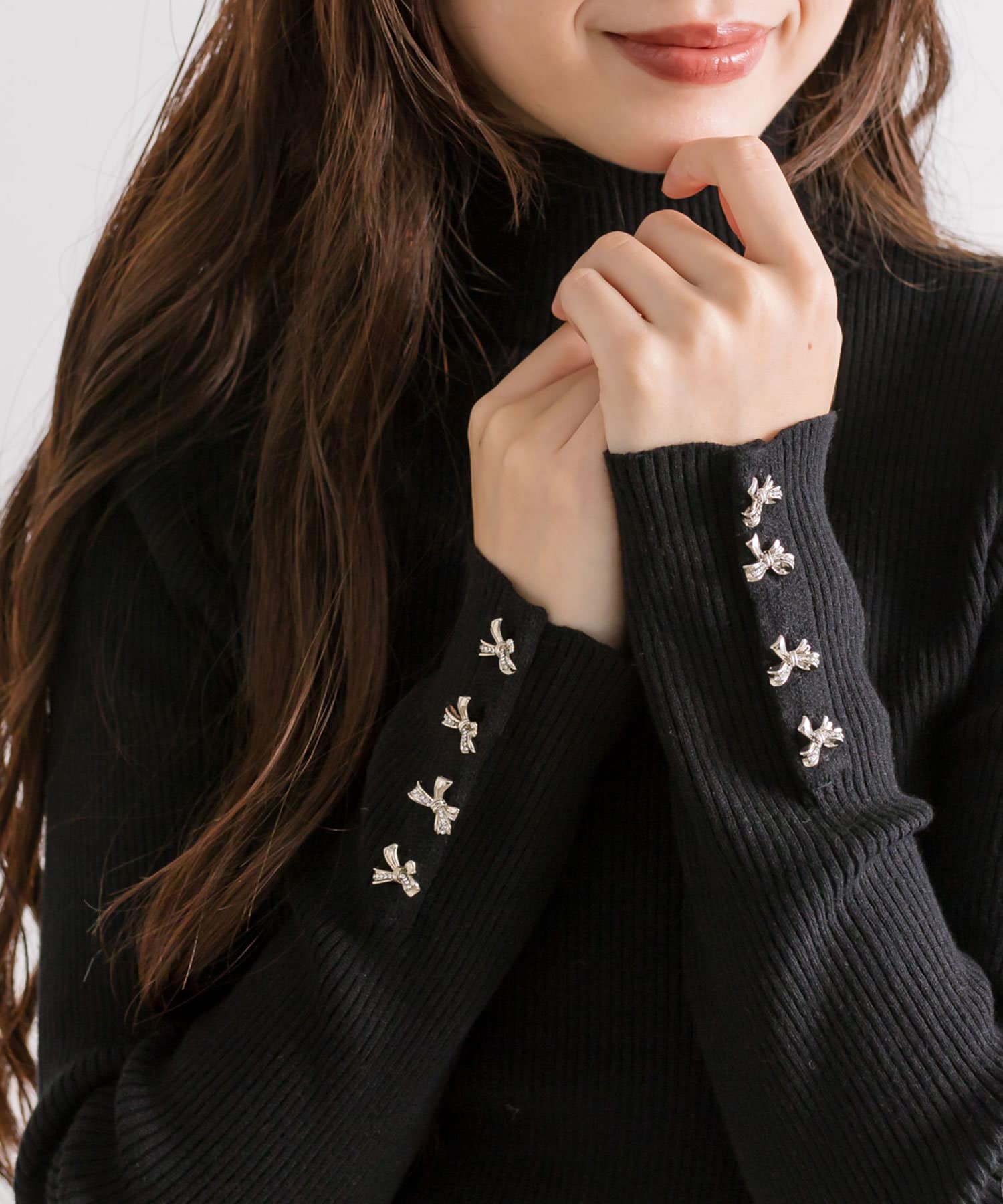 ・シンプルな無地にリボンボタンがワンポイントでかわいいニット。