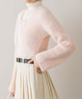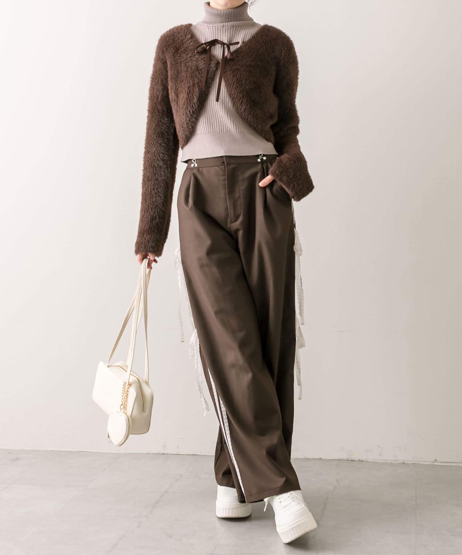 ・カーディガンはホックで開け閉めできて、前を閉めずに肩を落として着て抜け感を出すのもおすすめ。