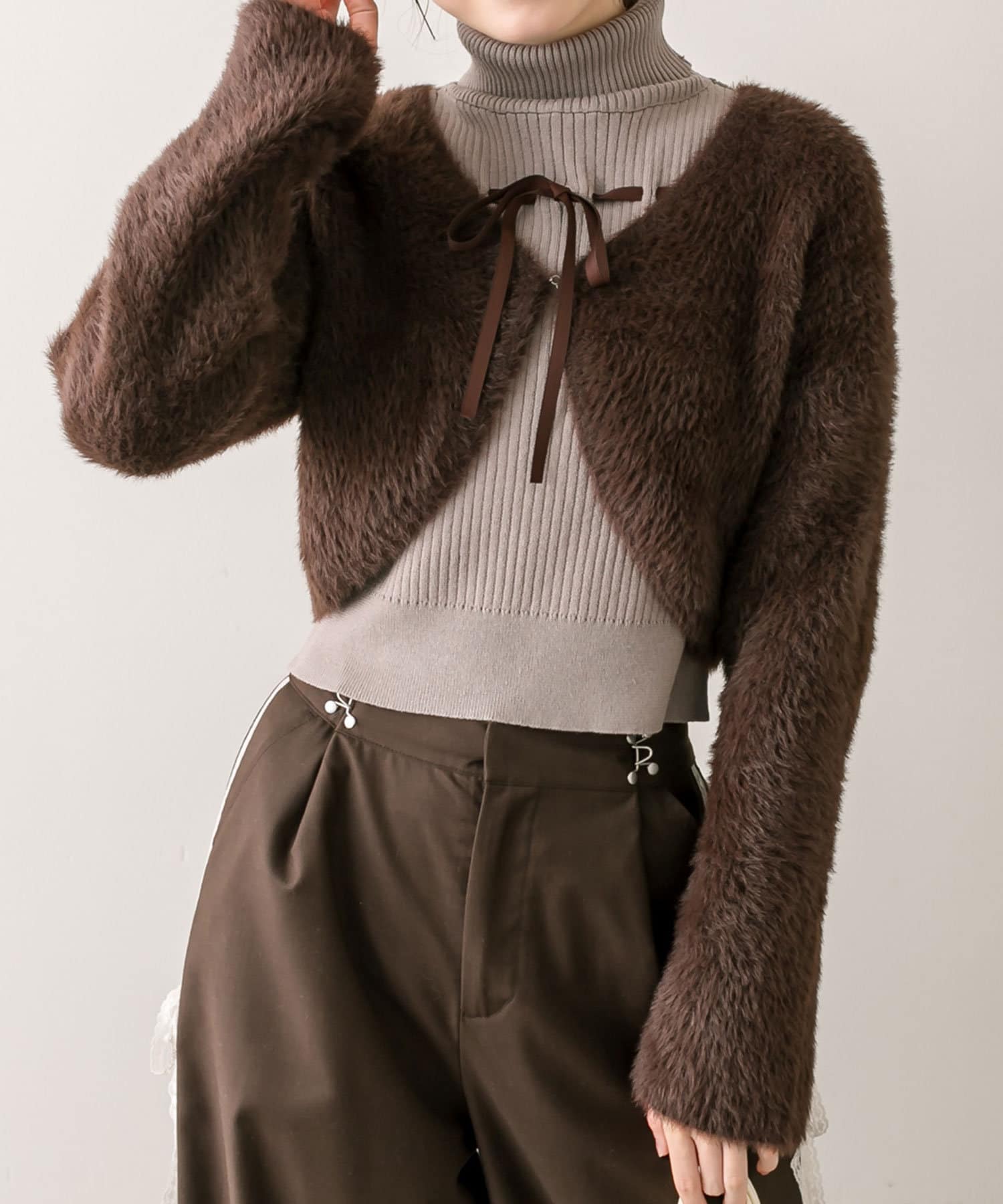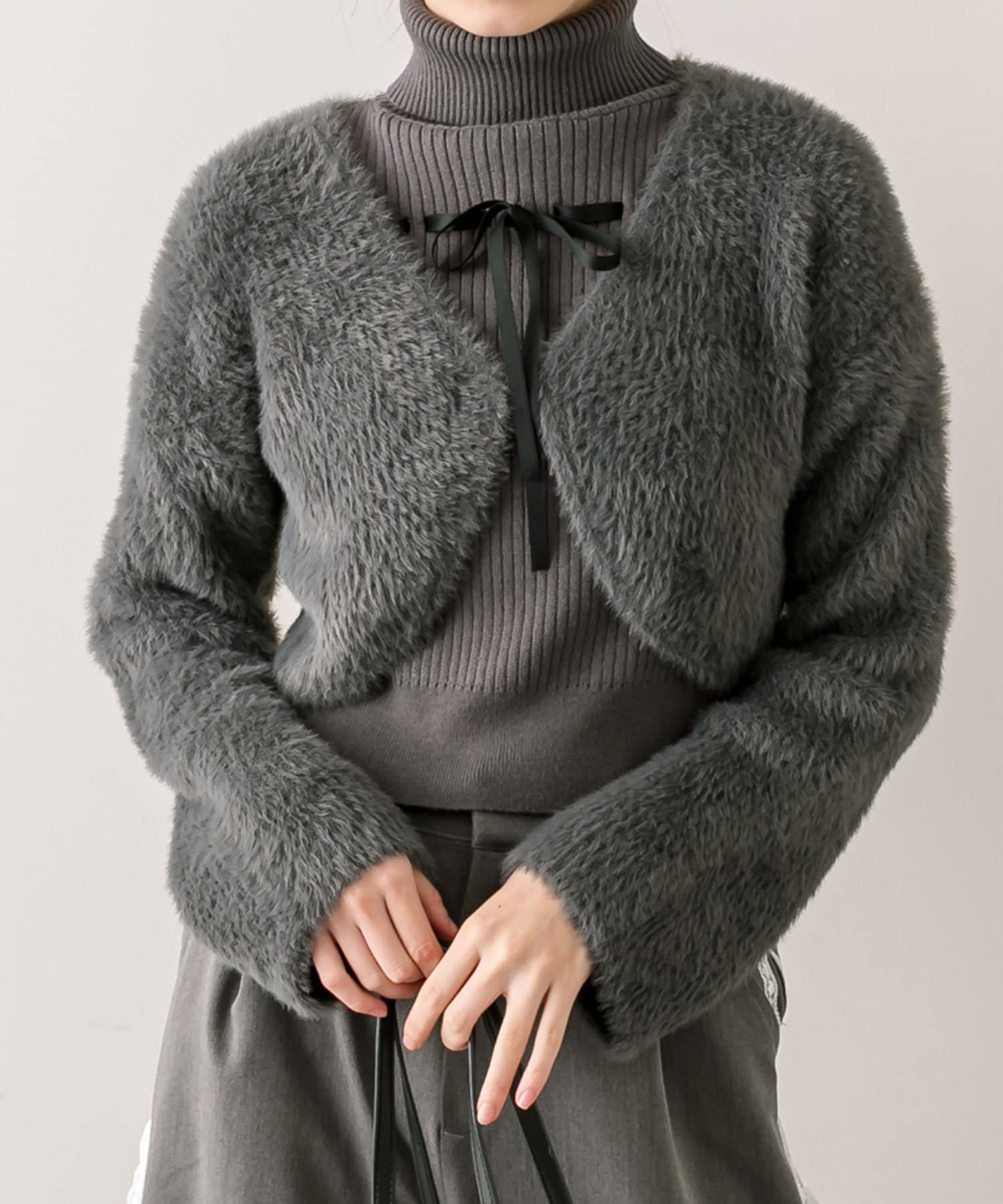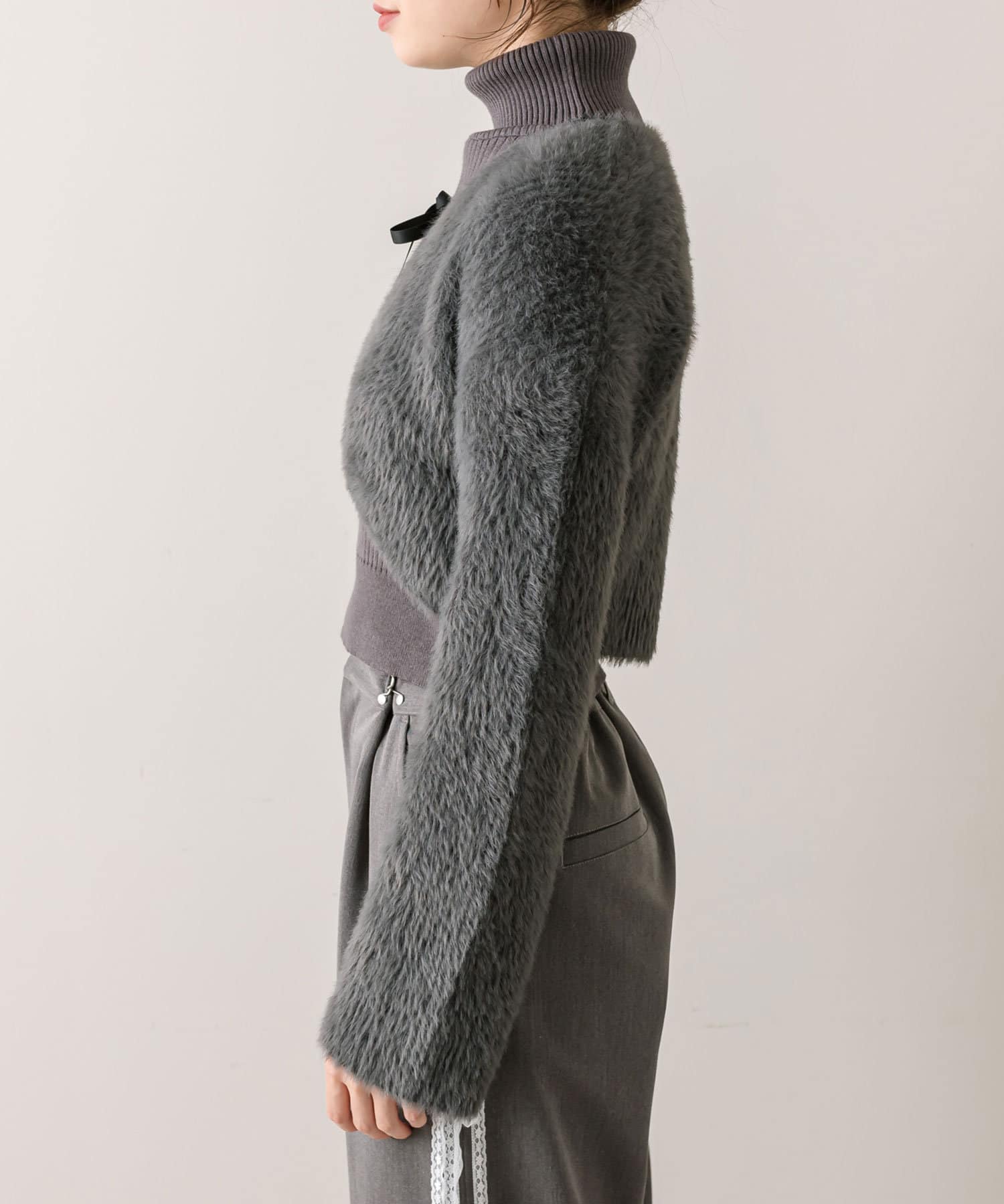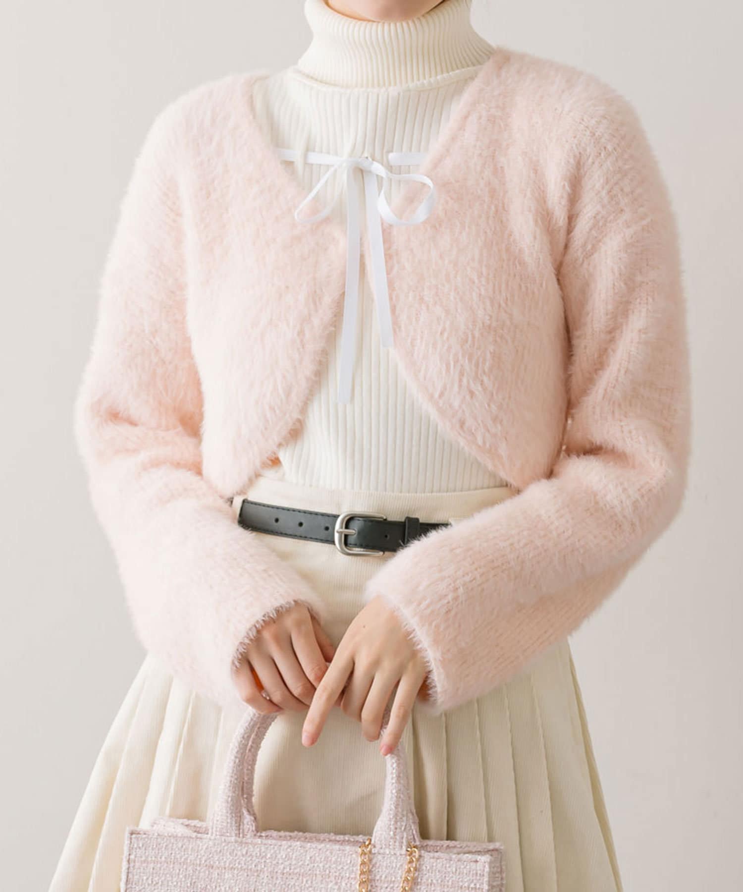 ・カーディガンがふわふわ素材ですが、インナーがリブ素材なので着ぶくれしにくいです。