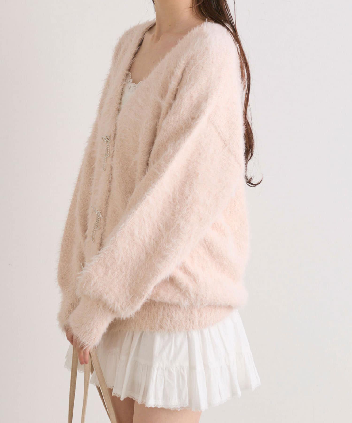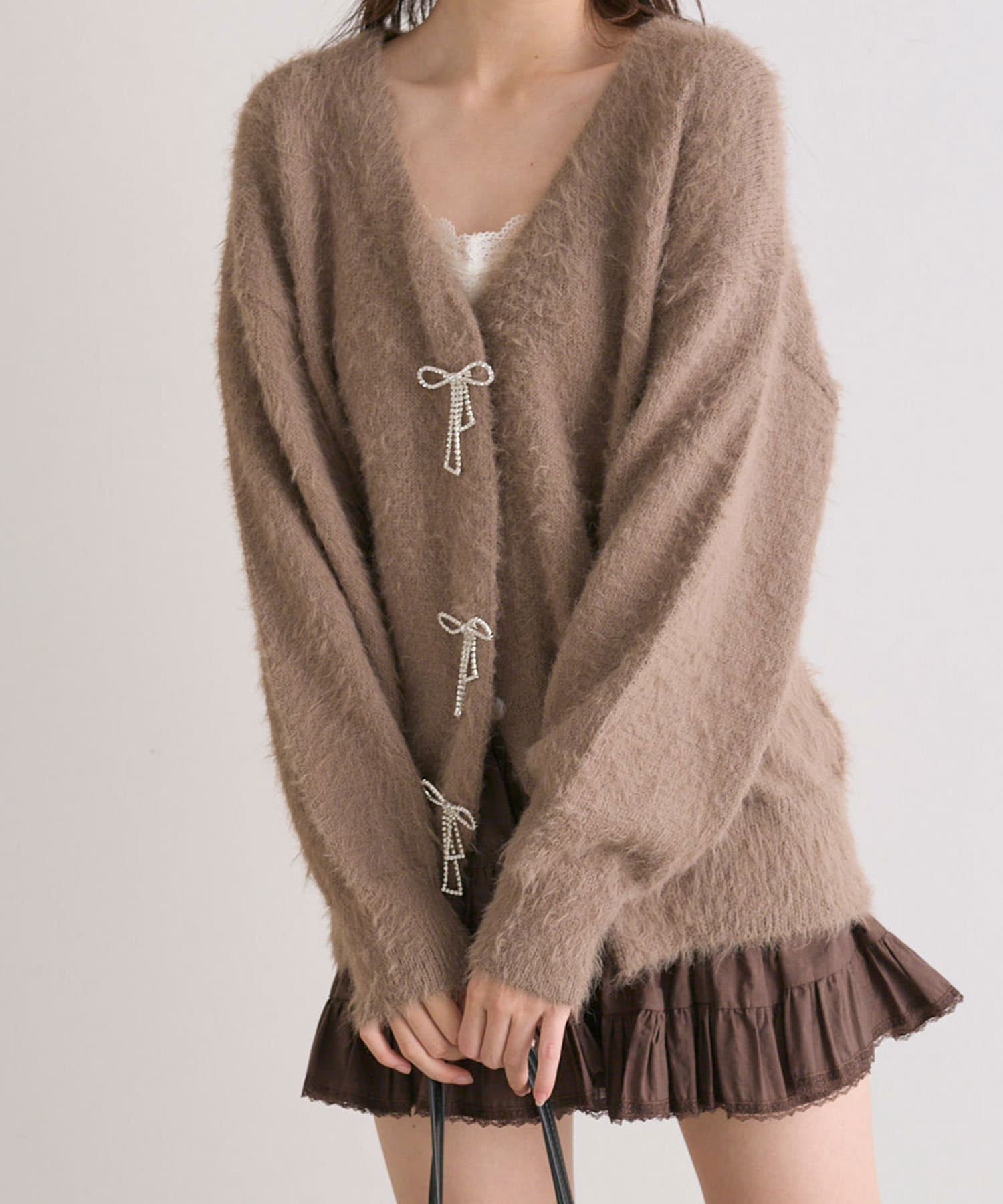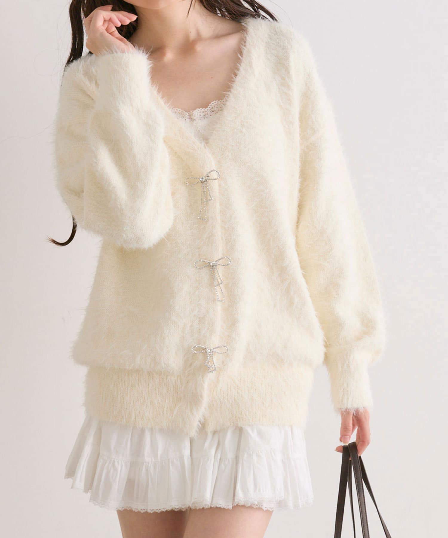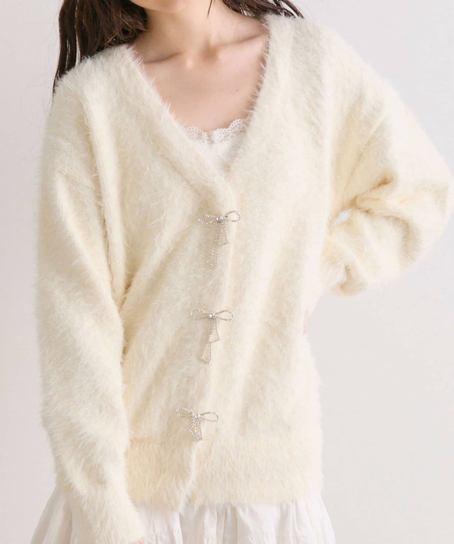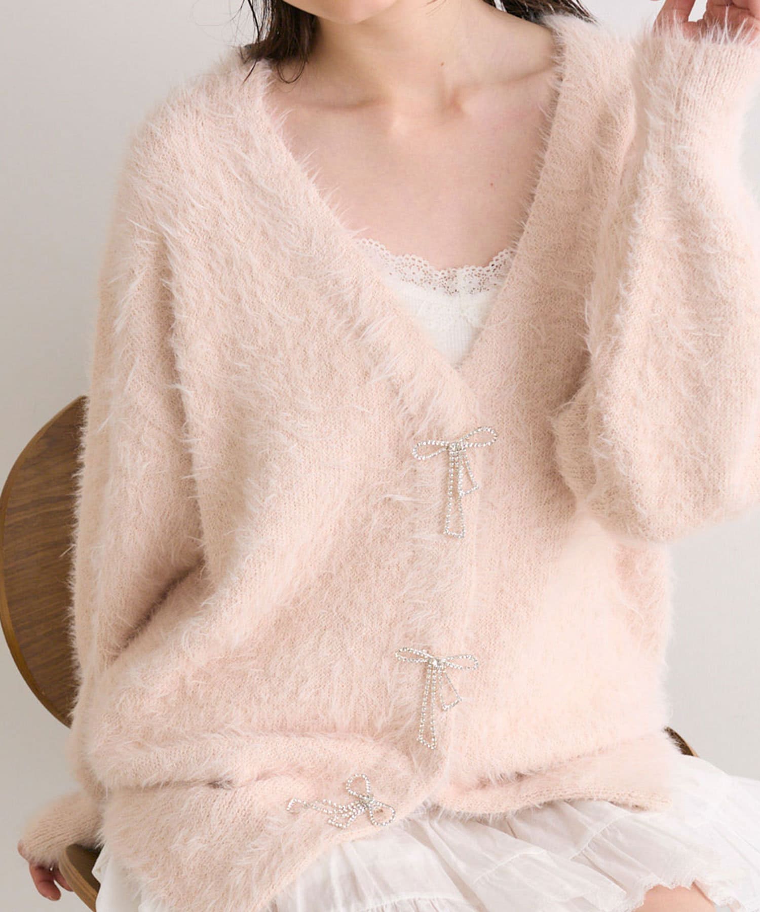 ・ふわふわのフェザーに揺れるリボンビジューが女の子らしさを演出するカーディガン。