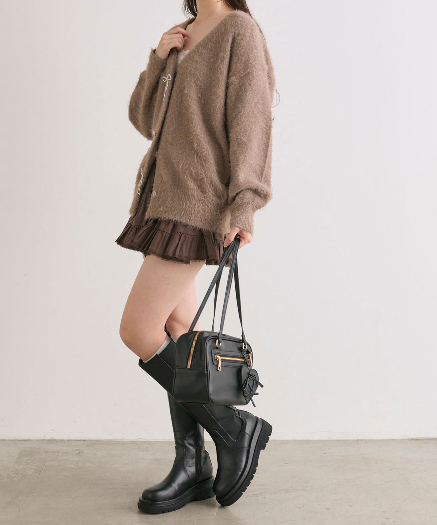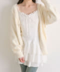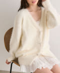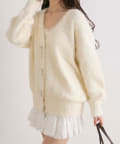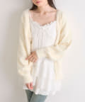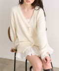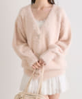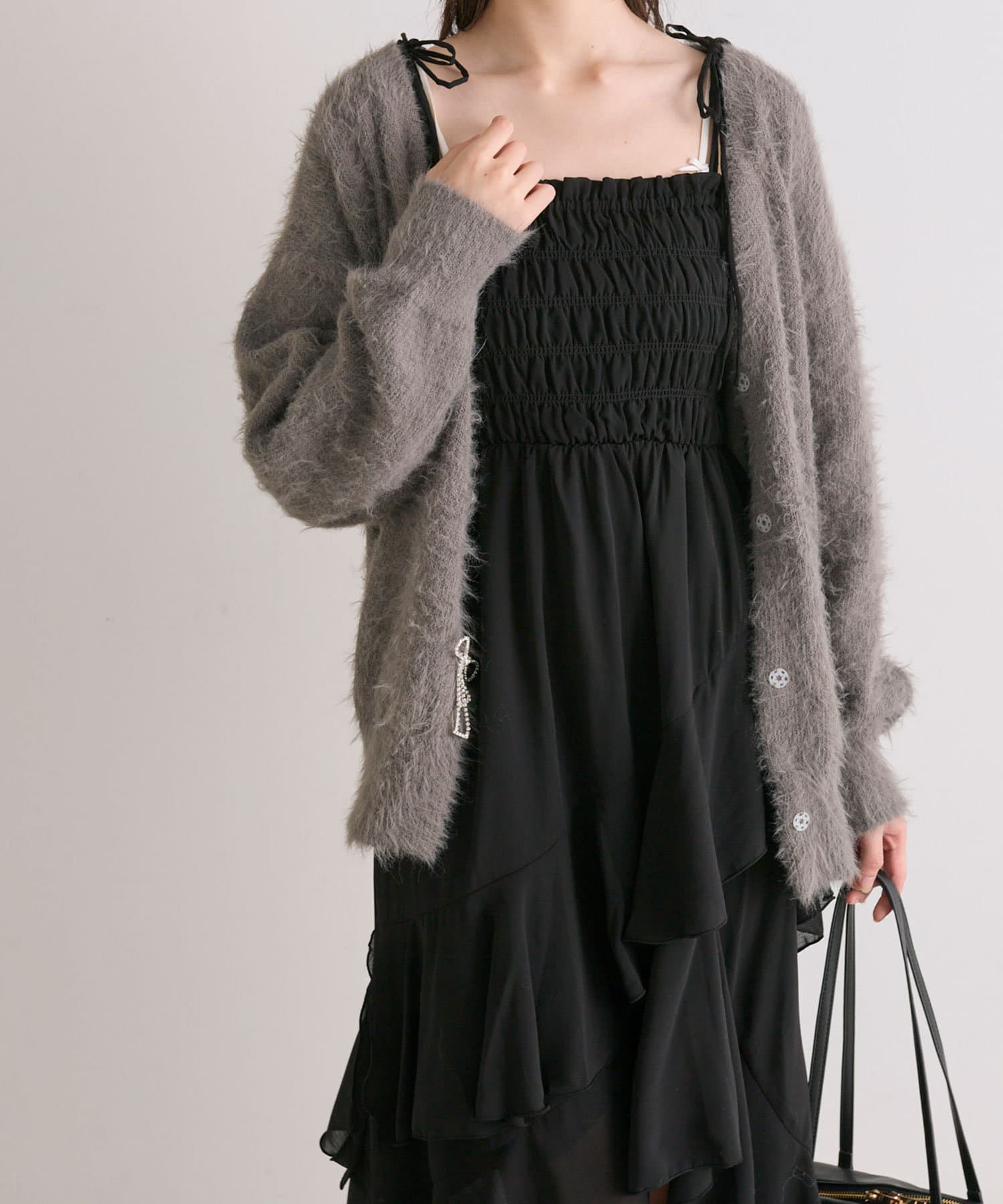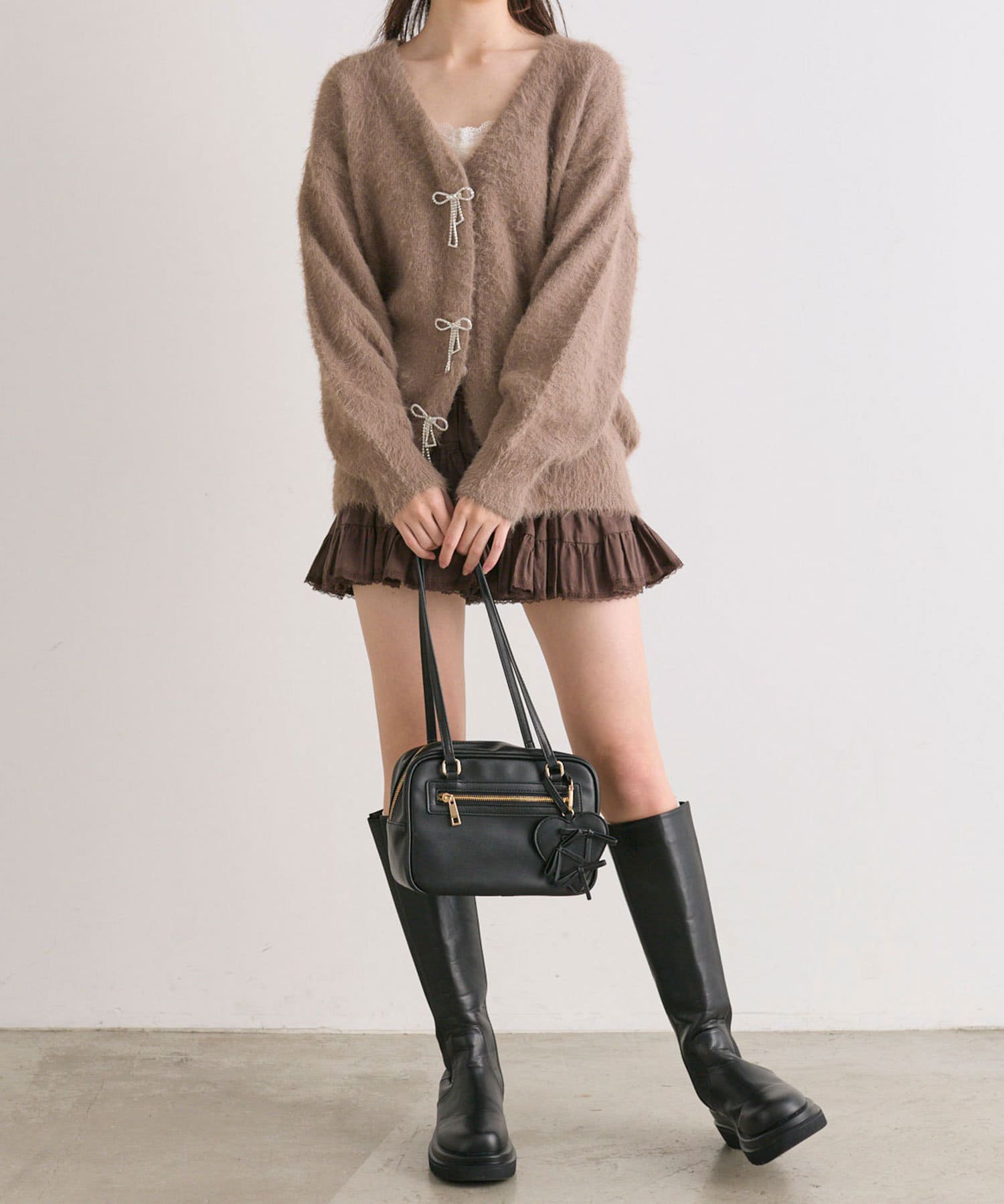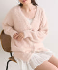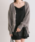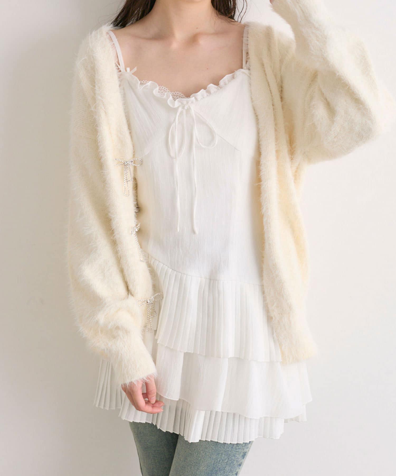 ・ふわふわのフェザーに揺れるリボンビジューが女の子らしさを演出するカーディガン。