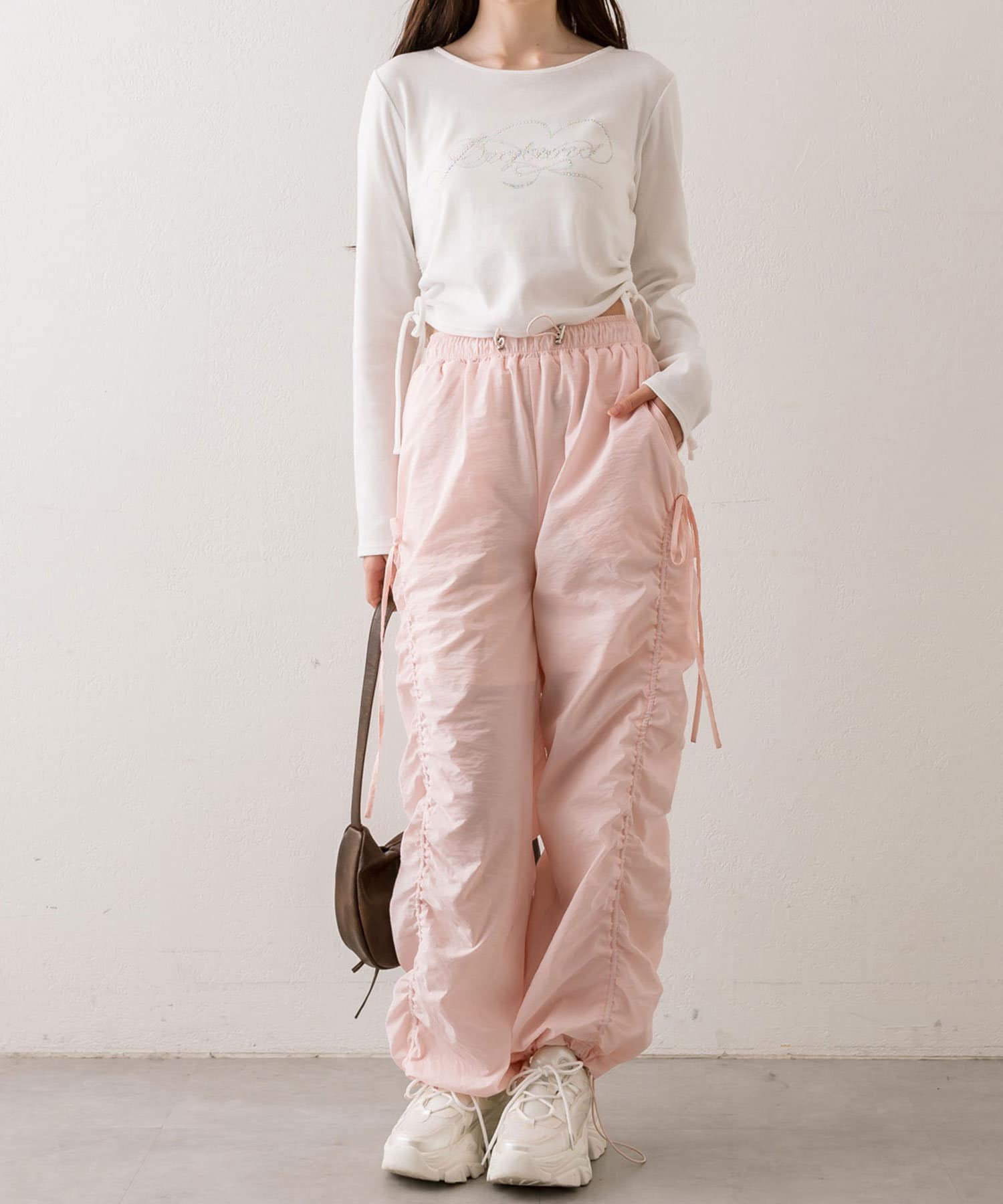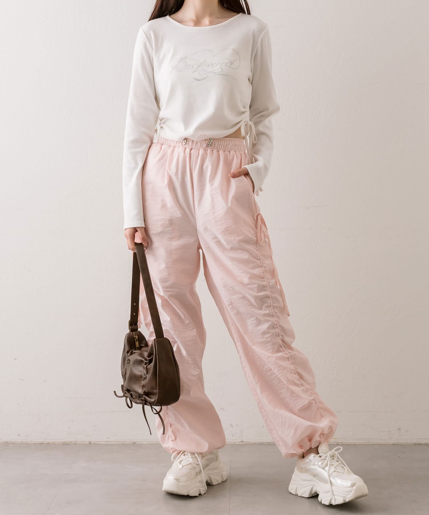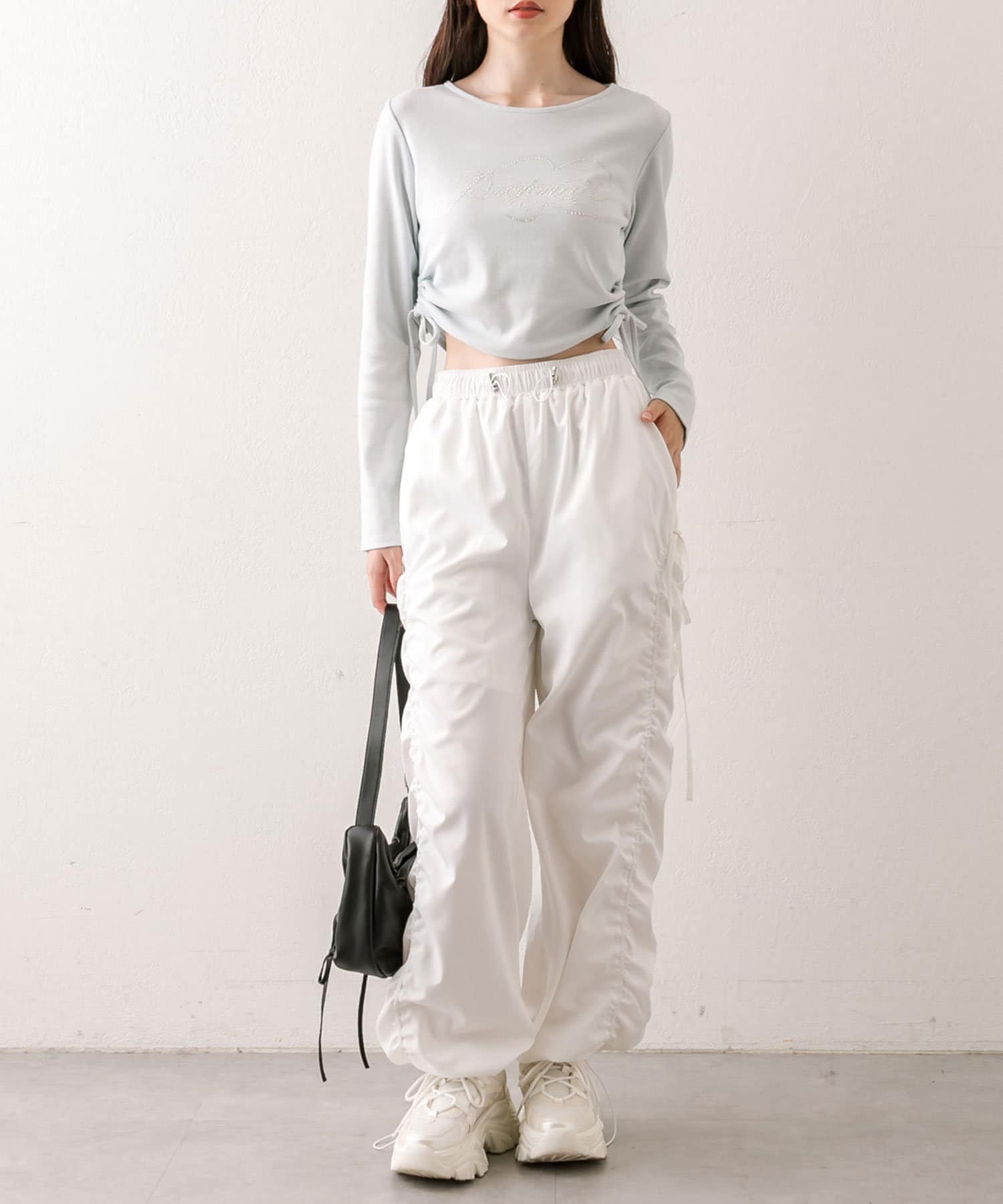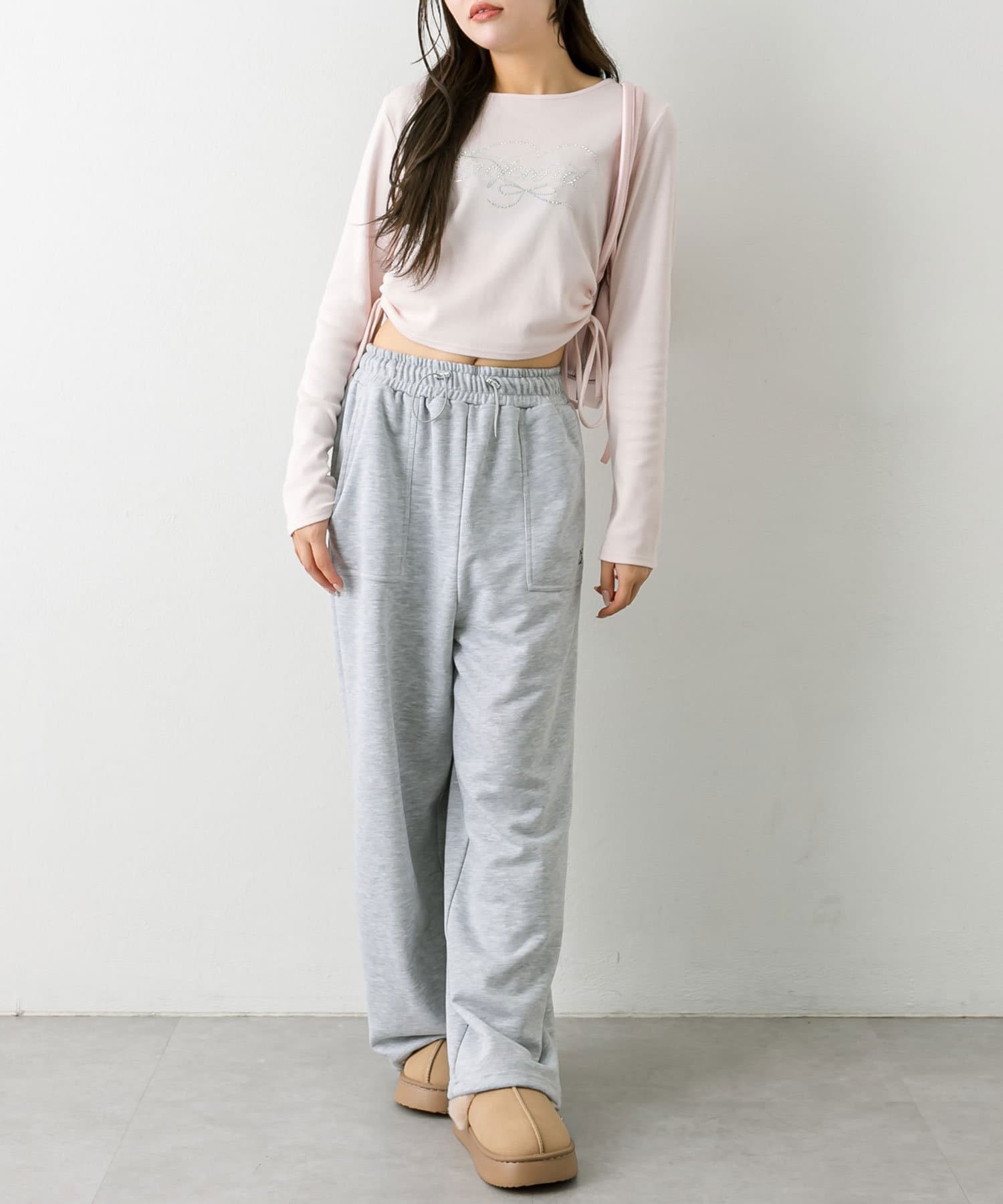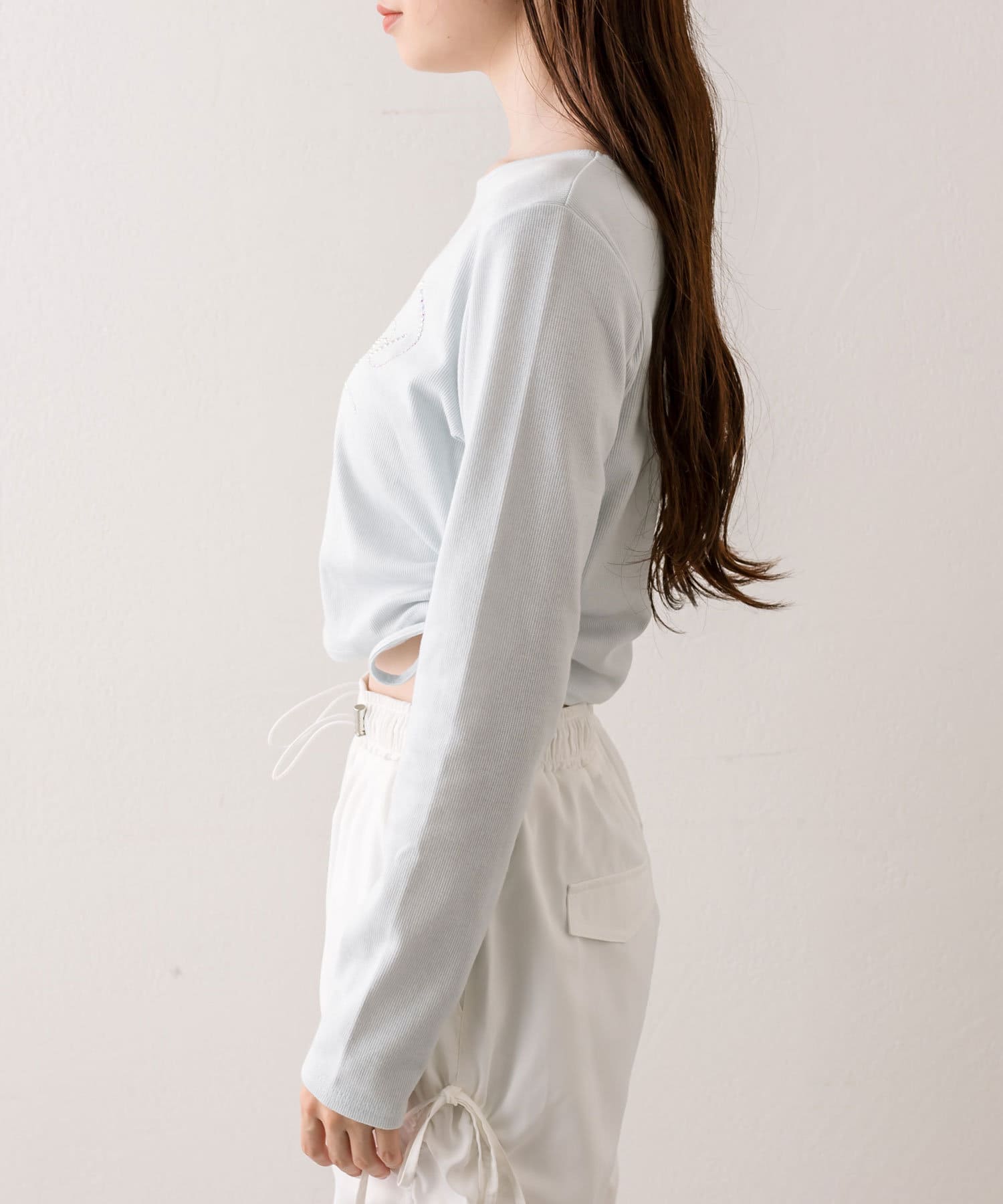 ・胸元のロゴがきらきらしたラインストーンで目を惹くデザイン。