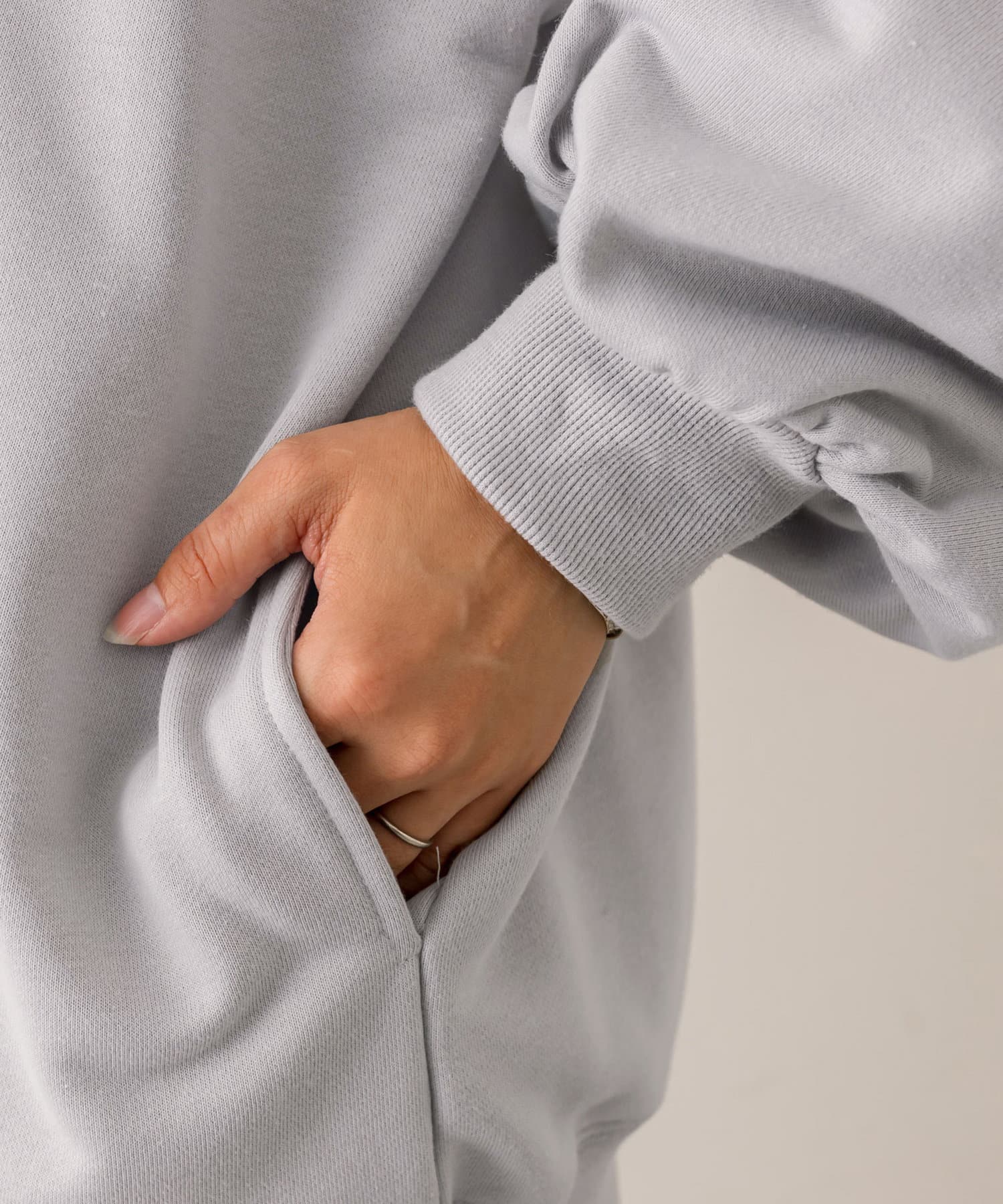 ・淡いカラーで合わせやすく、ロングシーズン着用できる裏毛素材です。