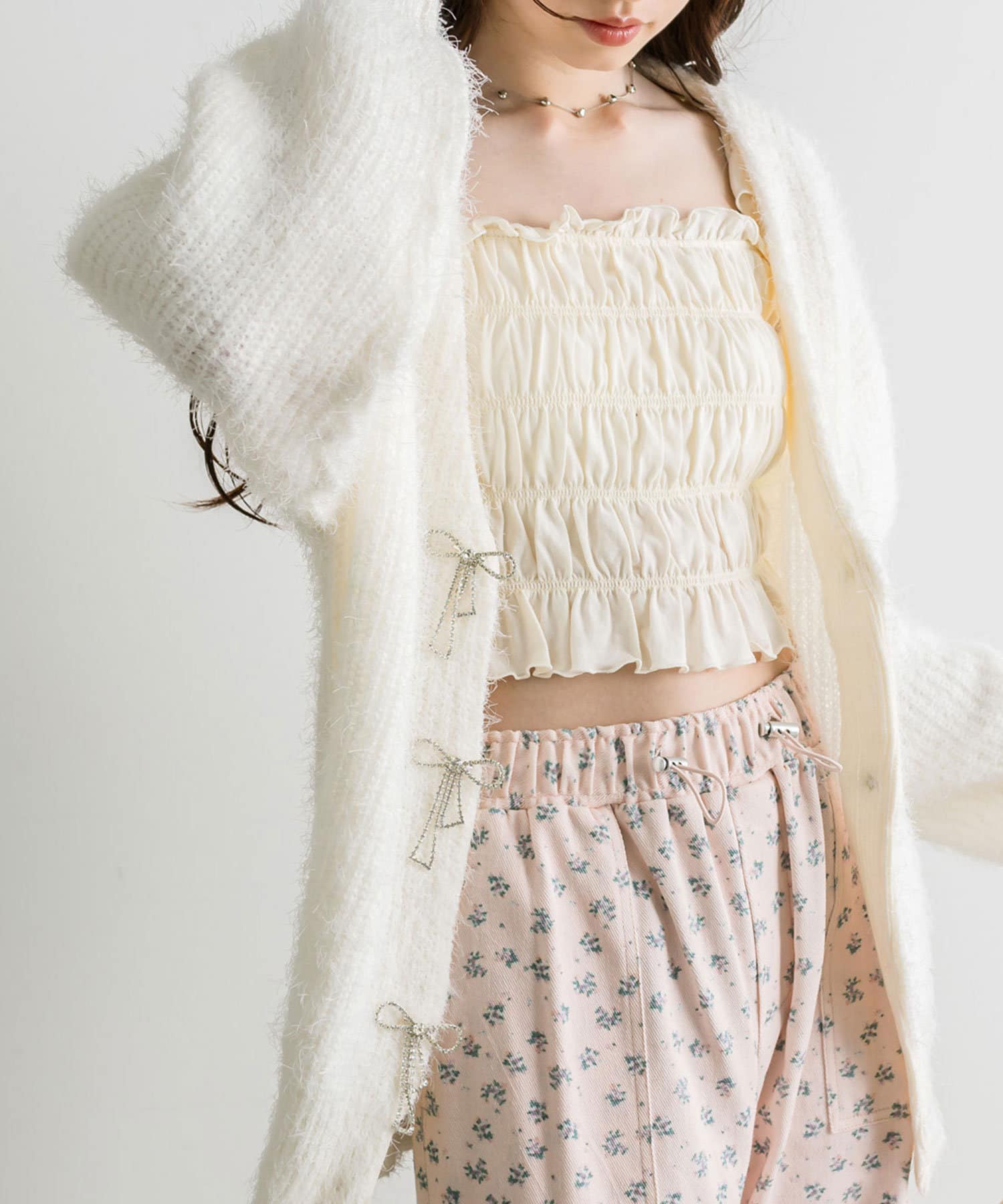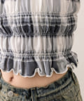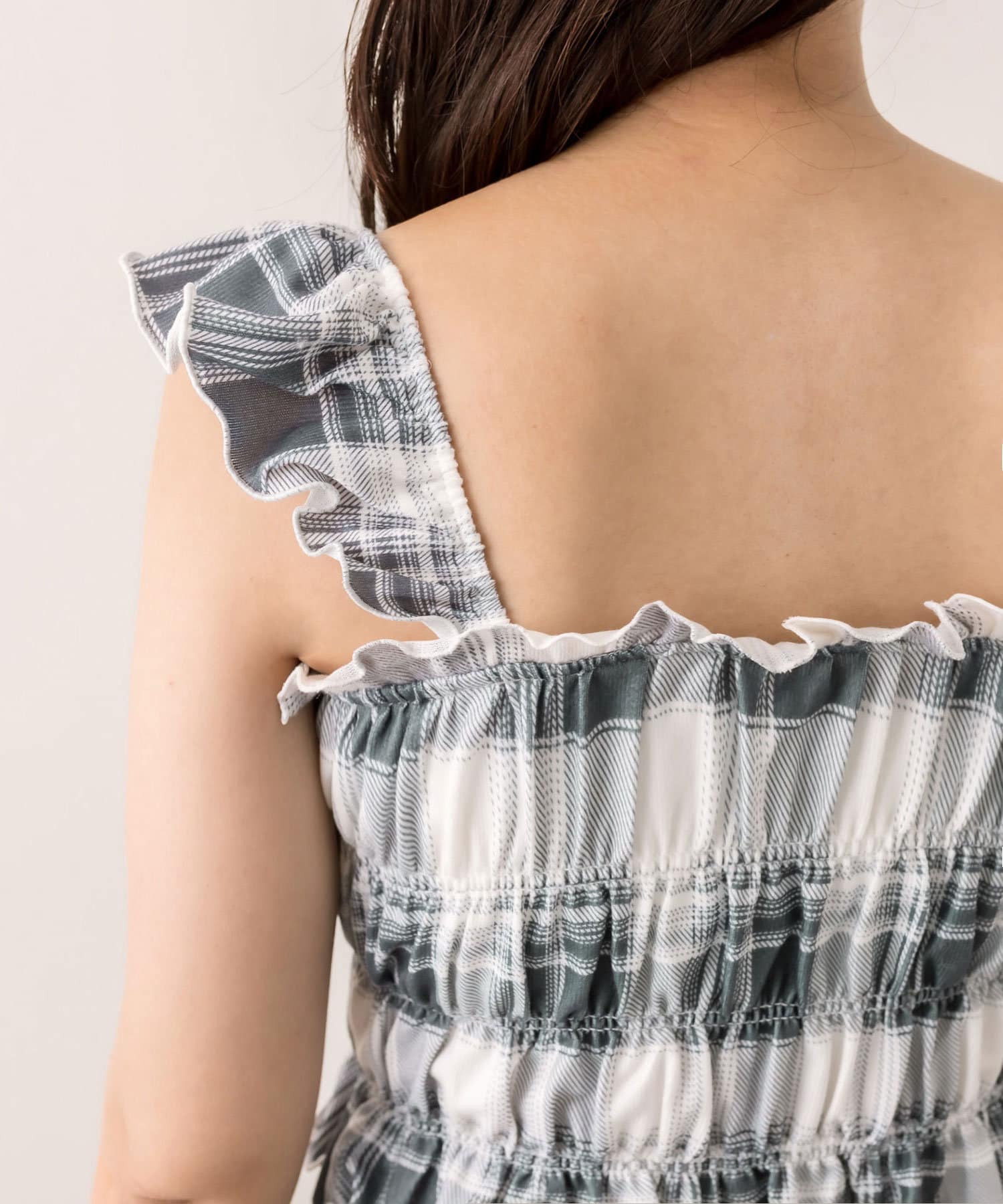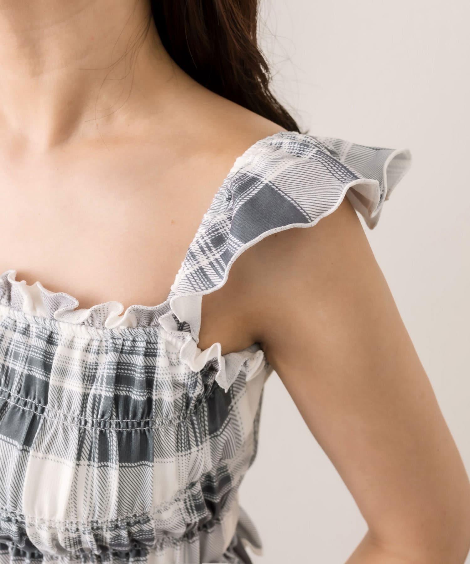 ・フリルとシャーリングで華奢見えし、女性らしさを演出します。