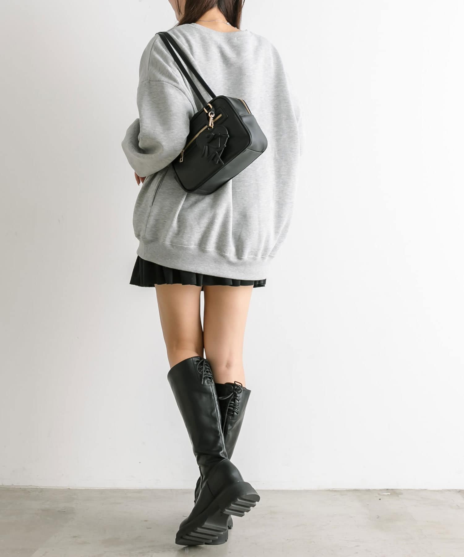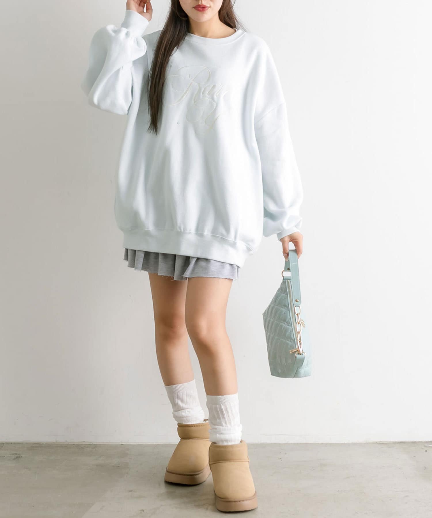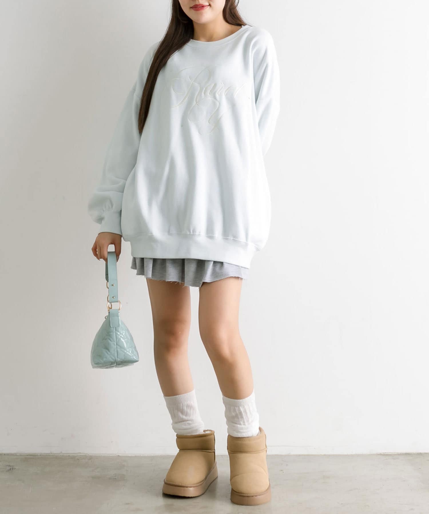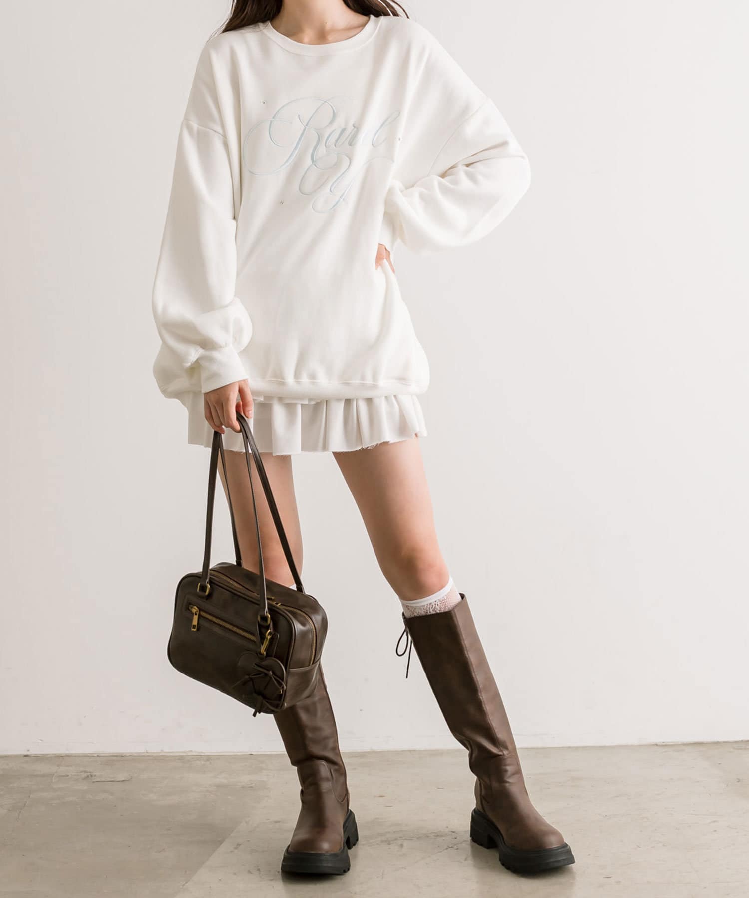 ・ミニボトムを合わせてミニワンピ風に着るのがおすすめ。