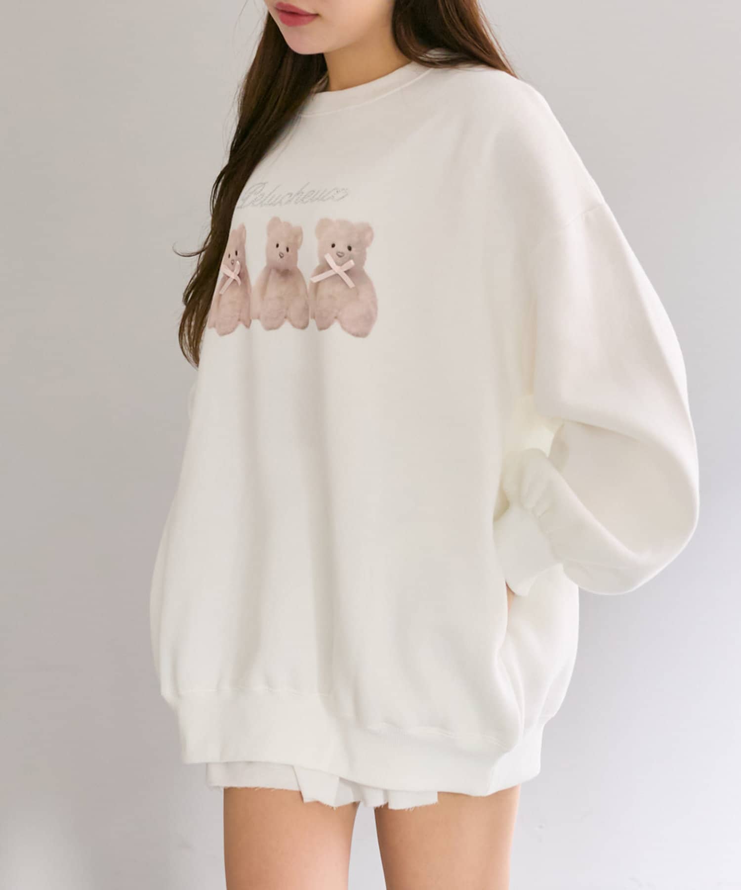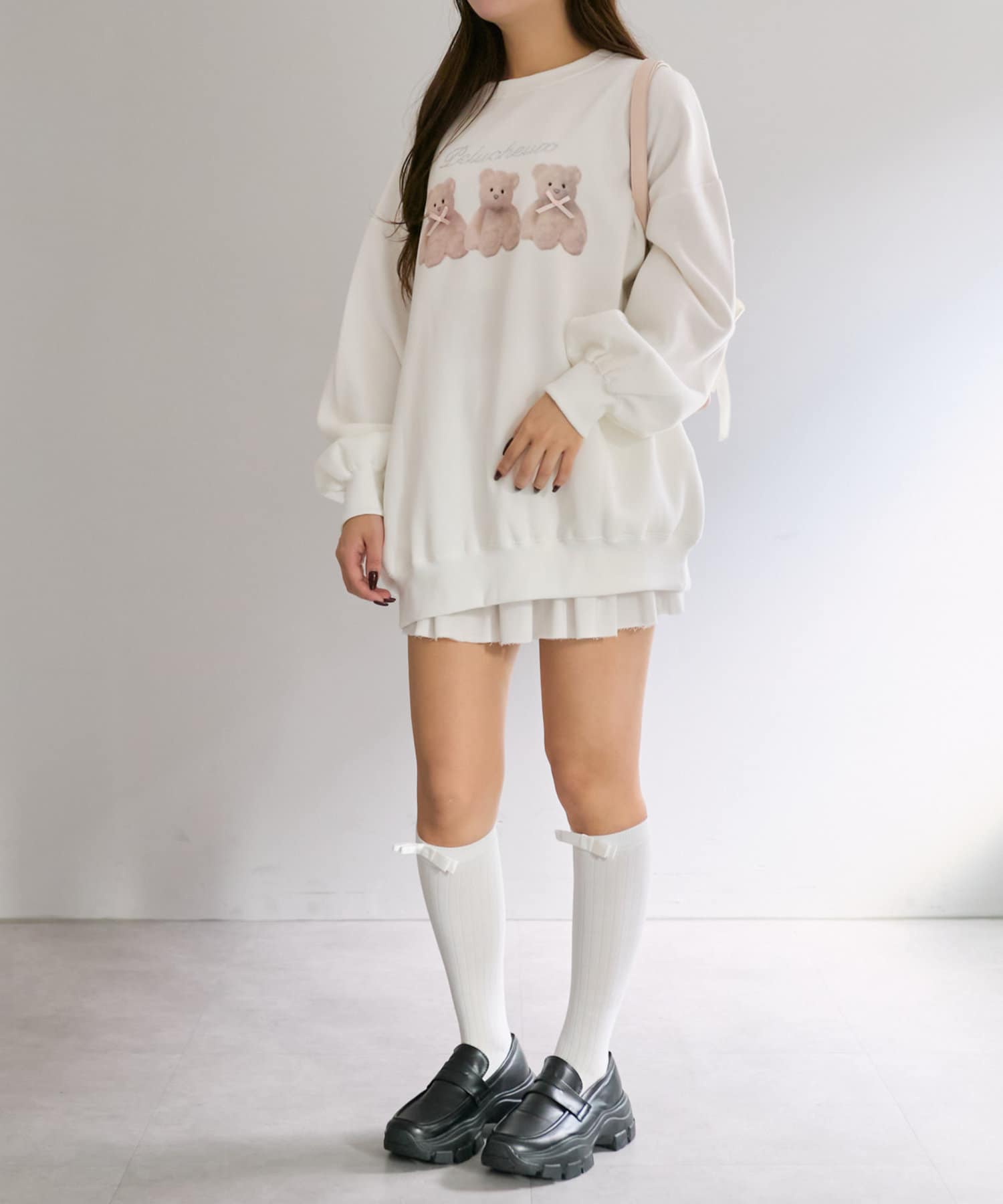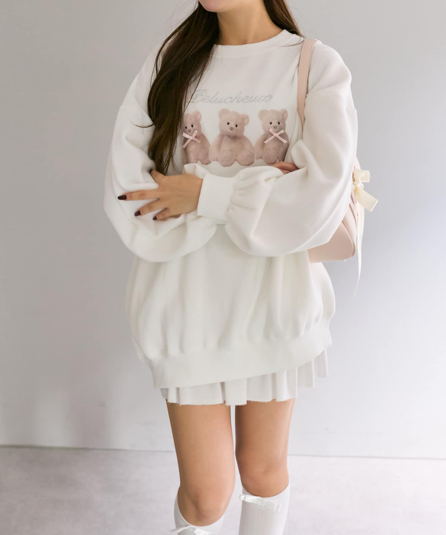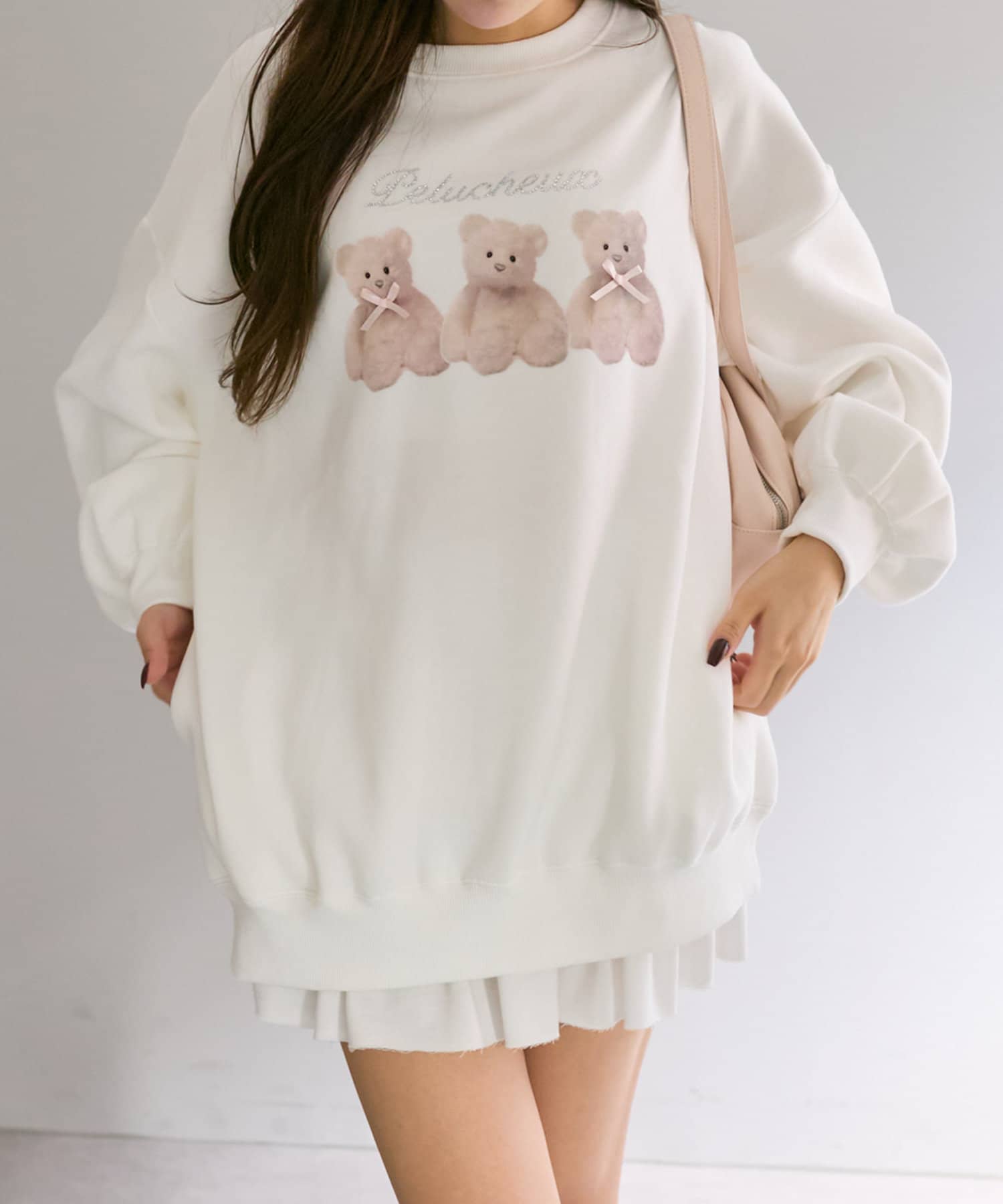 ・オフはクマプリントにリボンとビジューロゴ、ピンクはふわふわのナンバリングロゴ、グレーはレースリボンのデザインです。