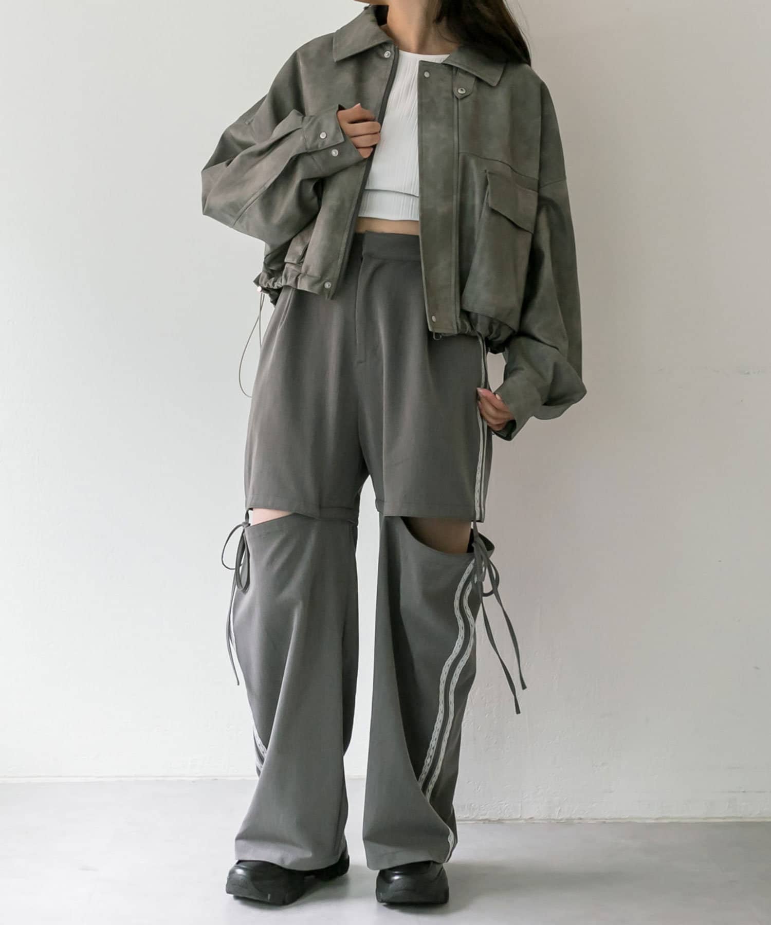 ・裾にゴム紐が入っているので、きゅっと絞って裾がたぽっとなるようにしたり、絞らずにすとんと落としたりシルエットの変化を楽しめます。
