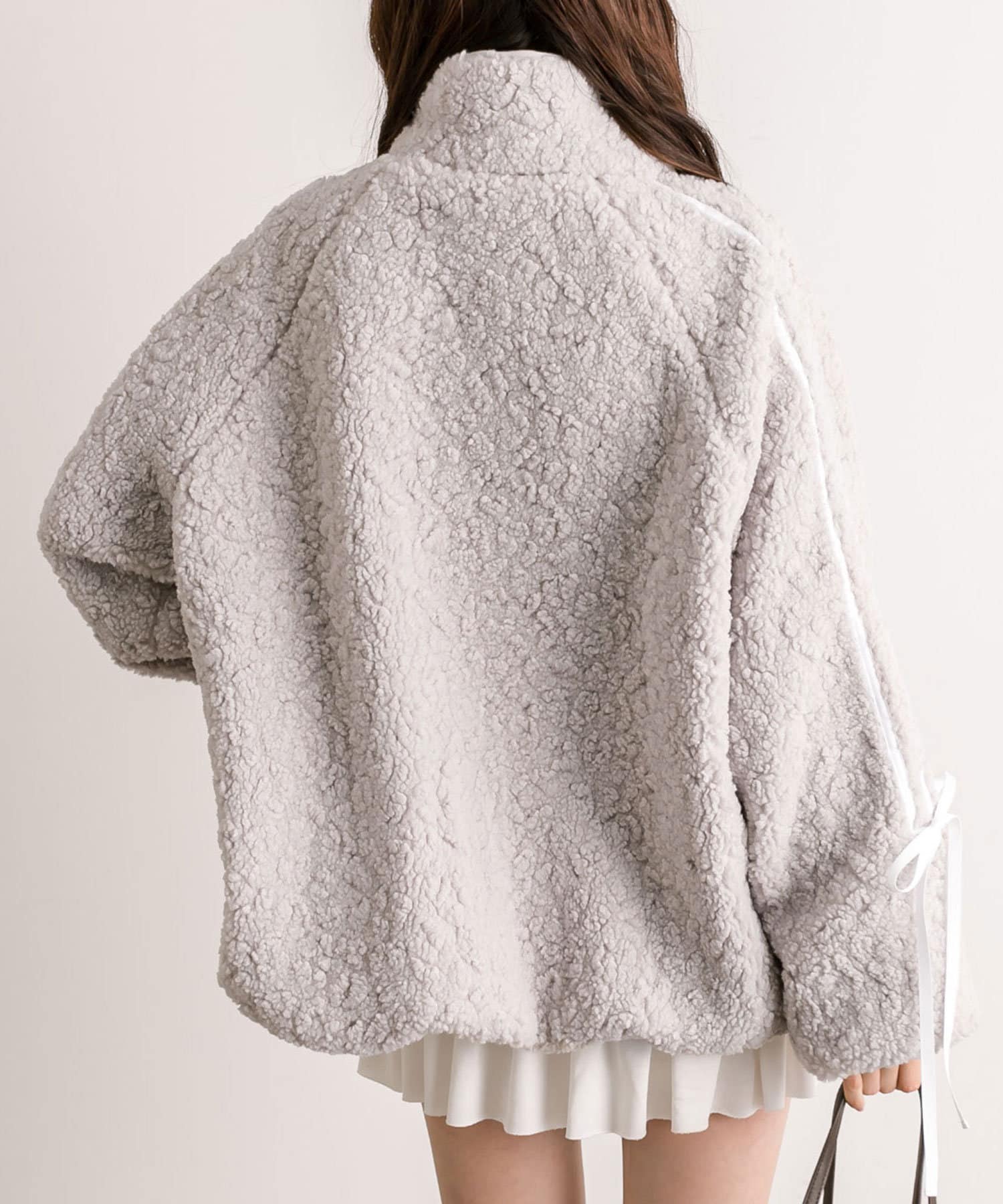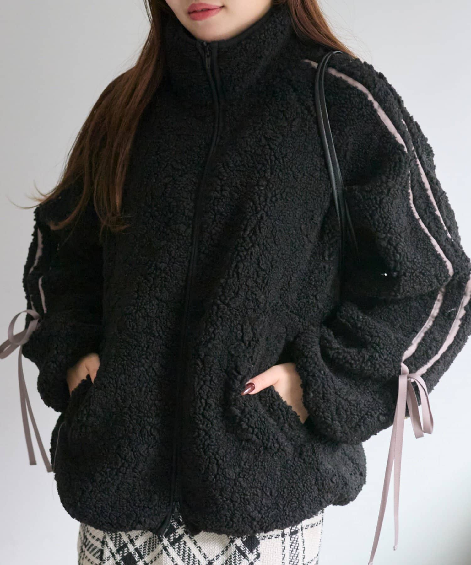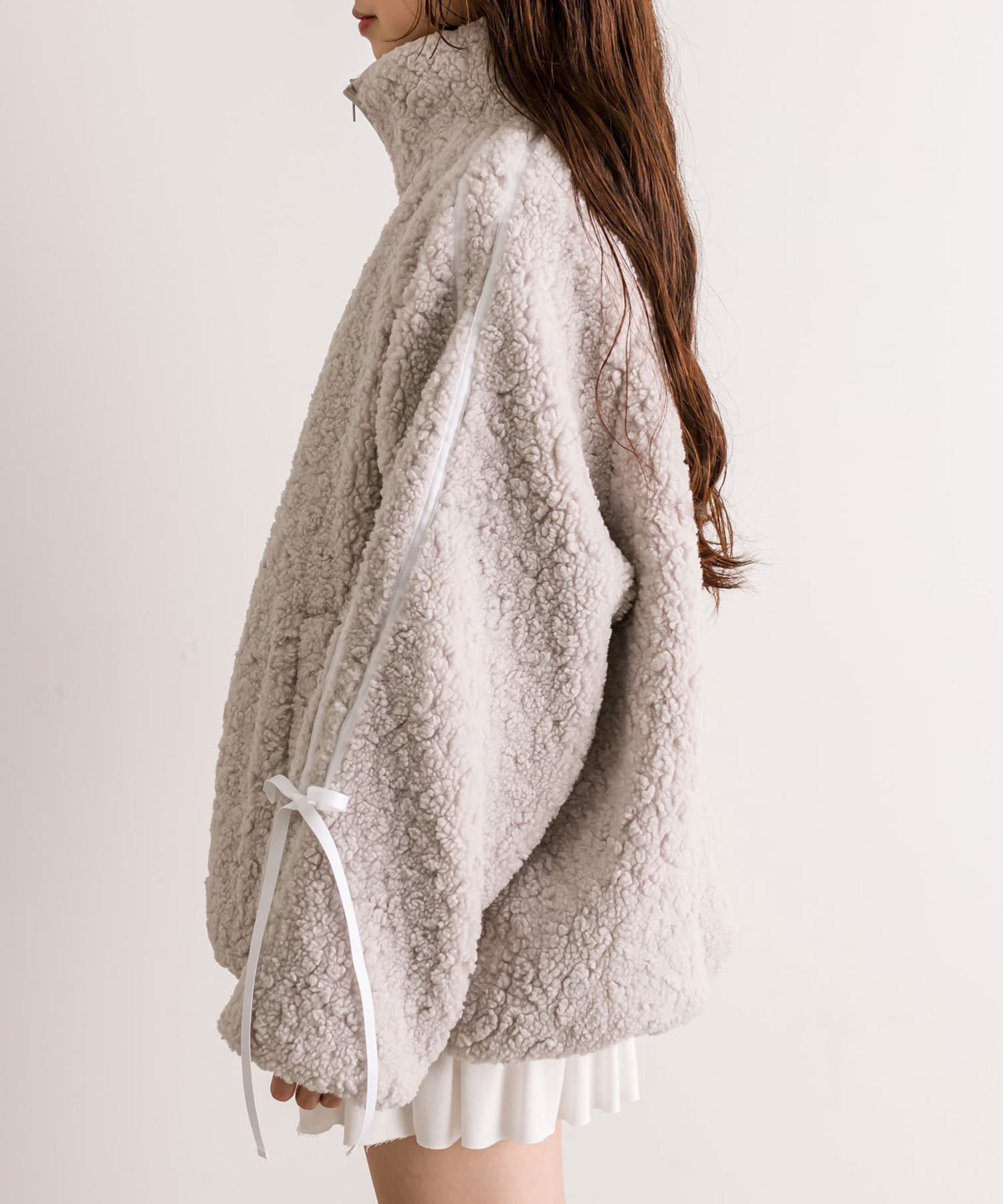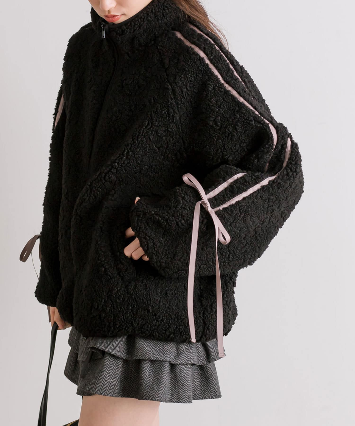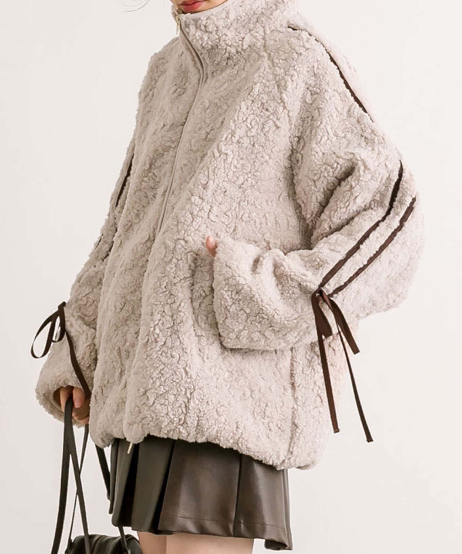 ・袖のラインとリボンがトレンドライクなボアブルゾン。