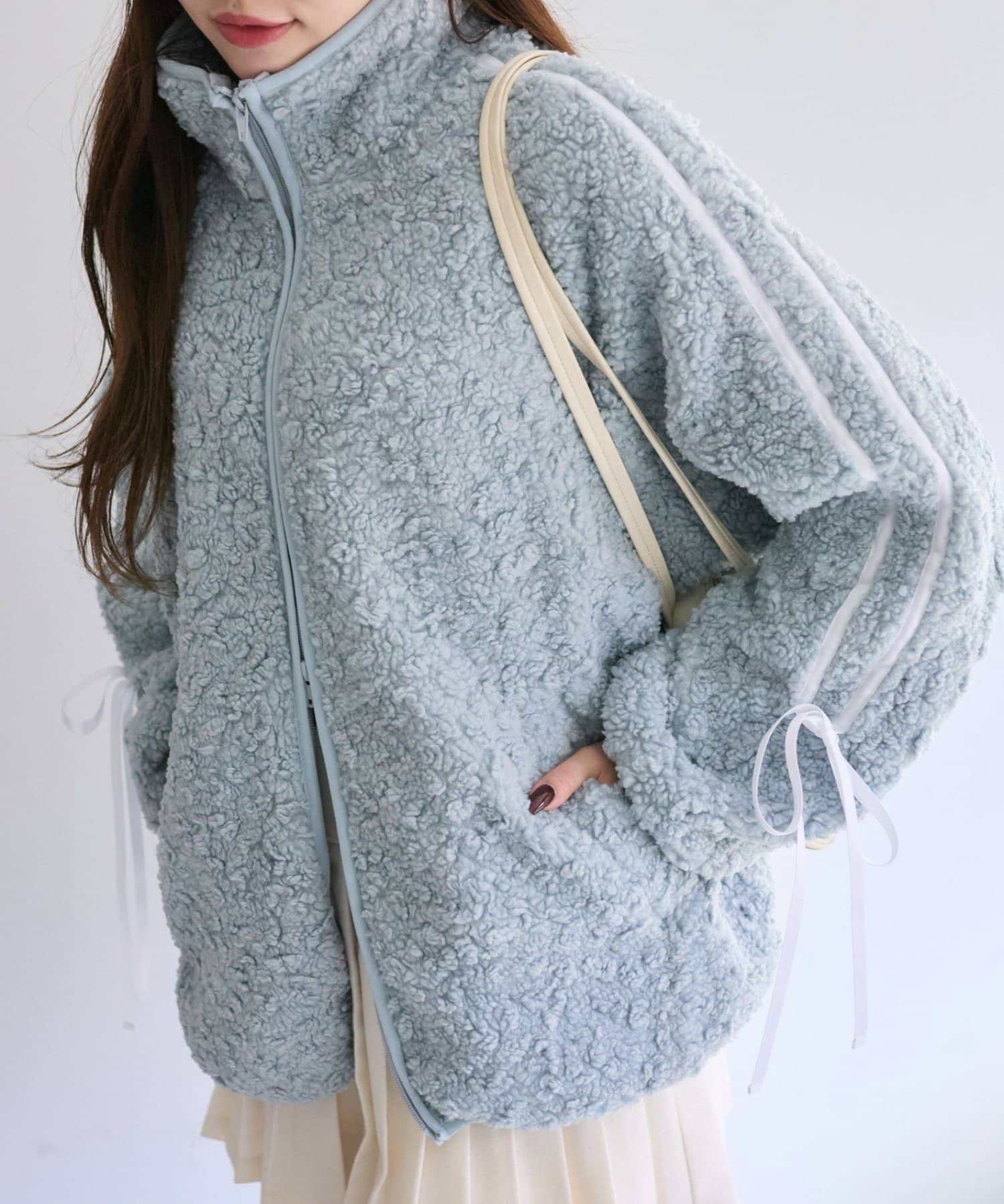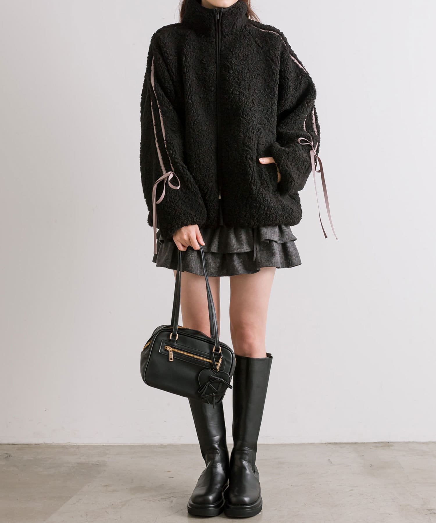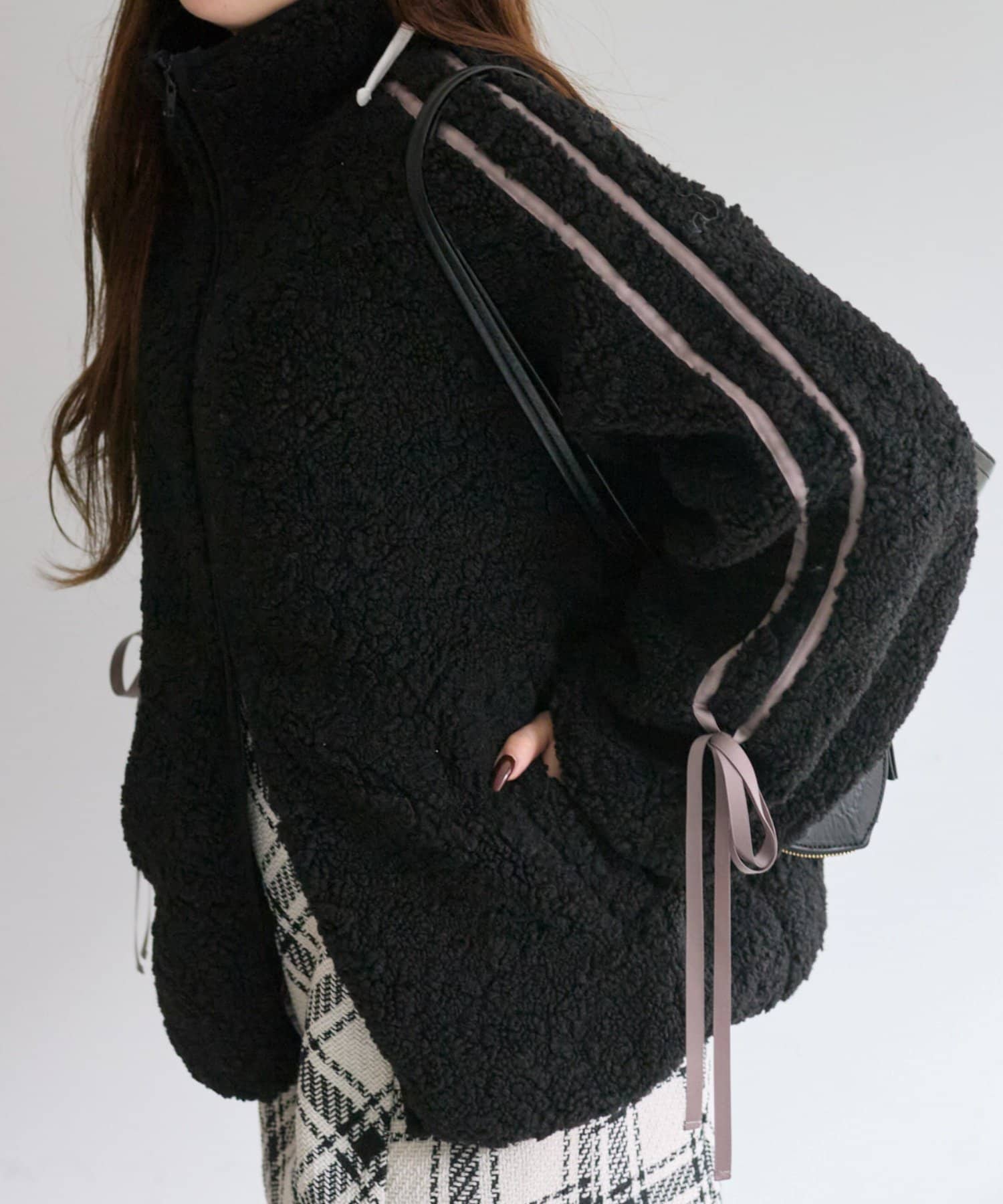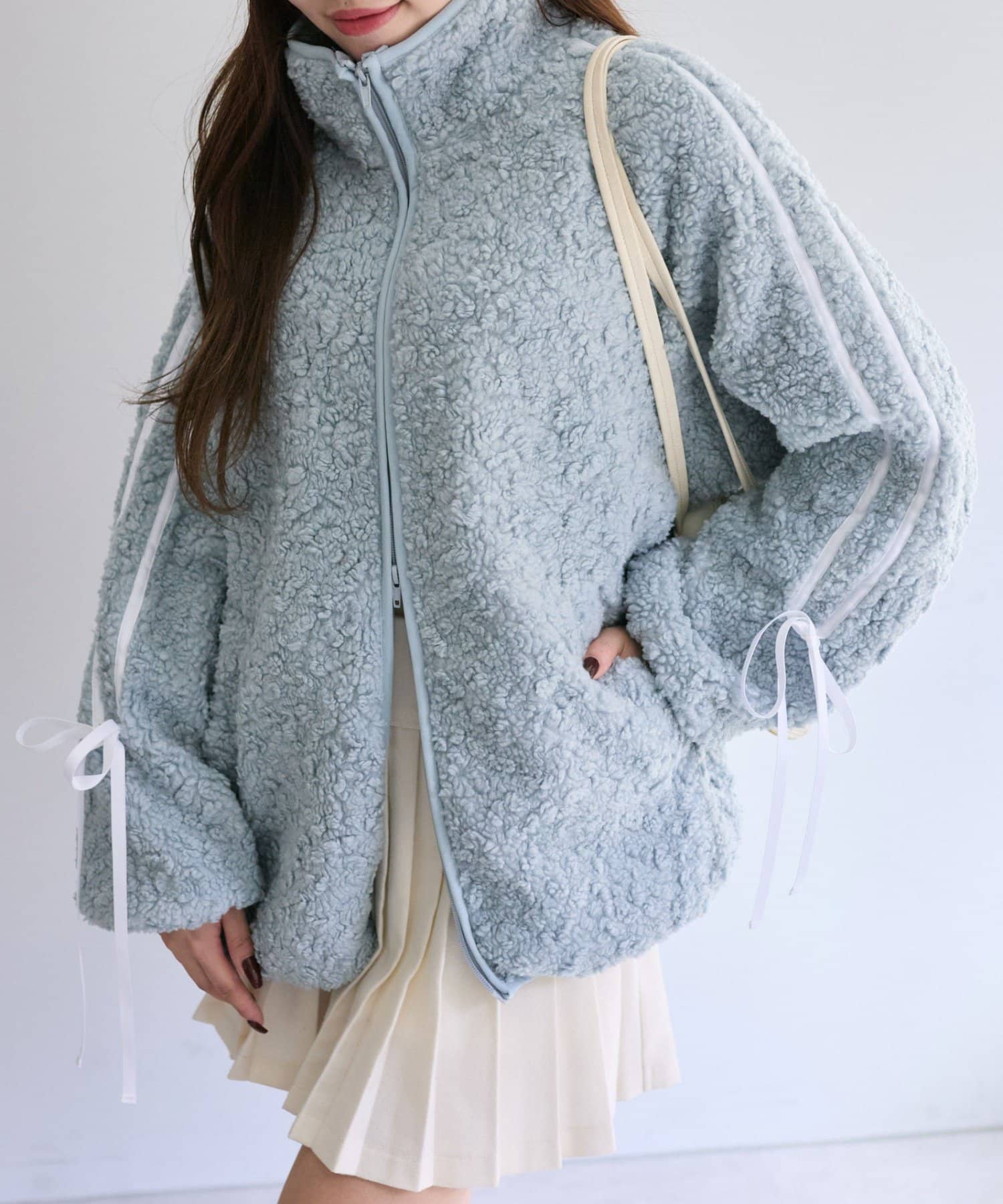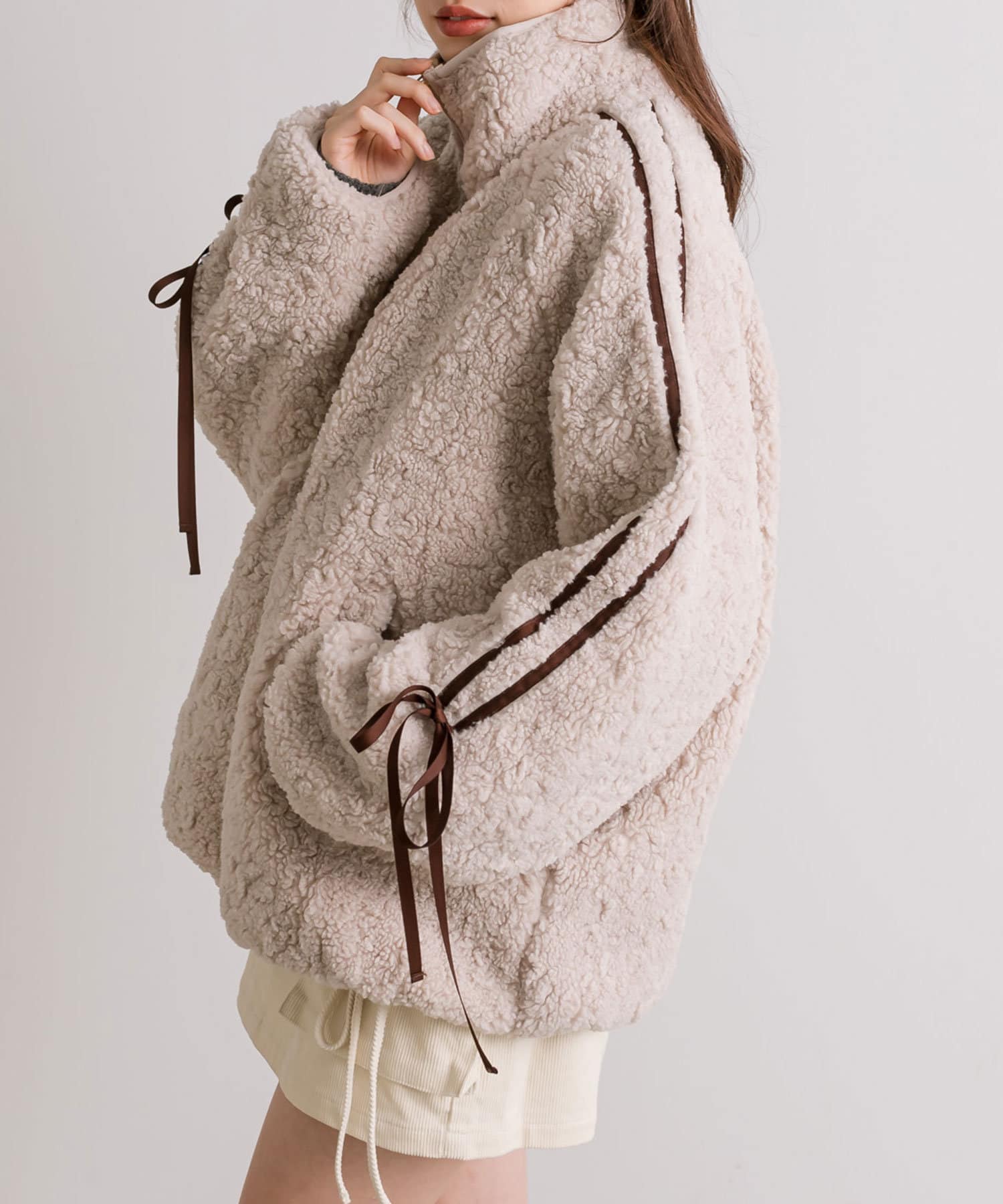 ・袖のラインとリボンがトレンドライクなボアブルゾン。