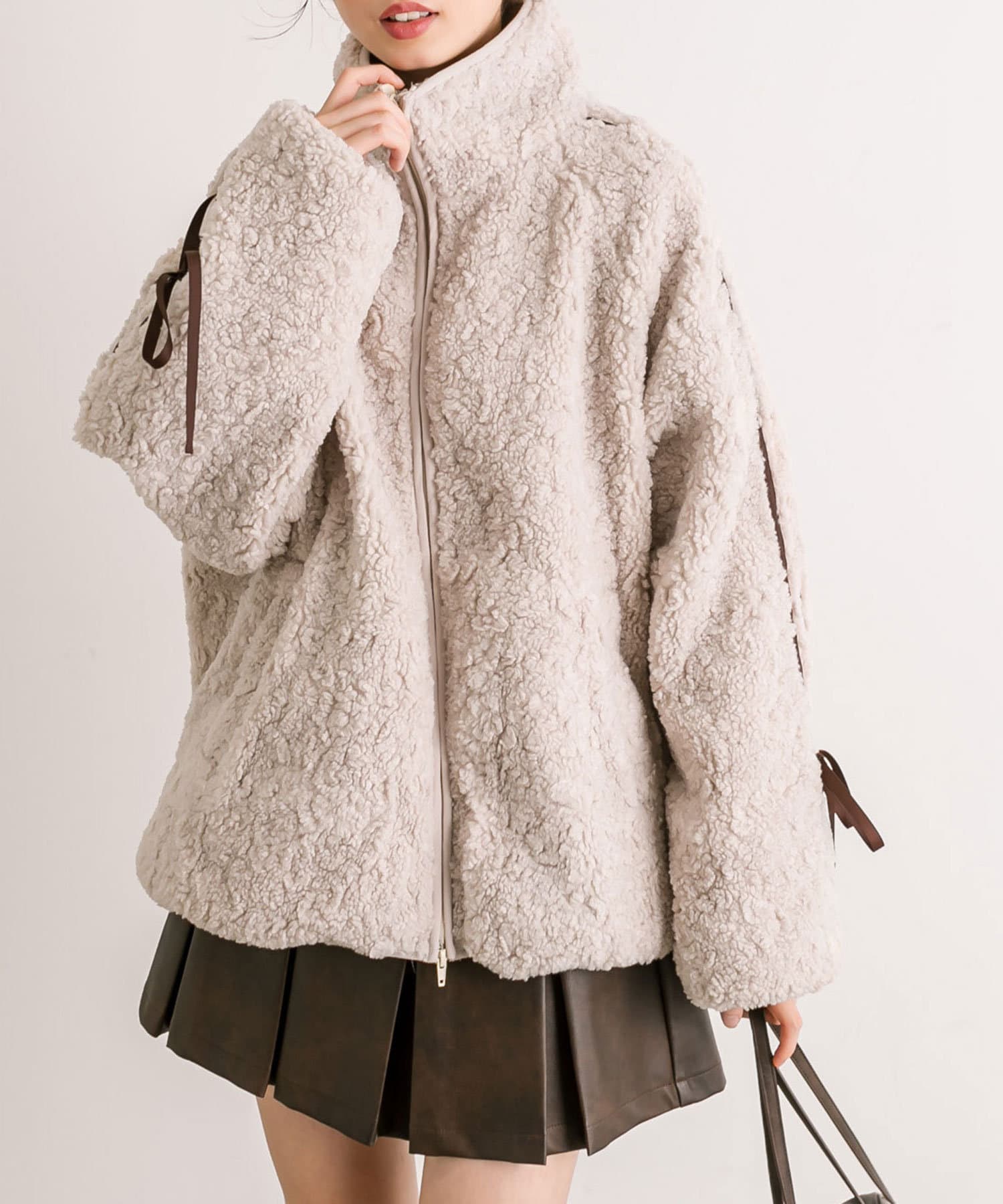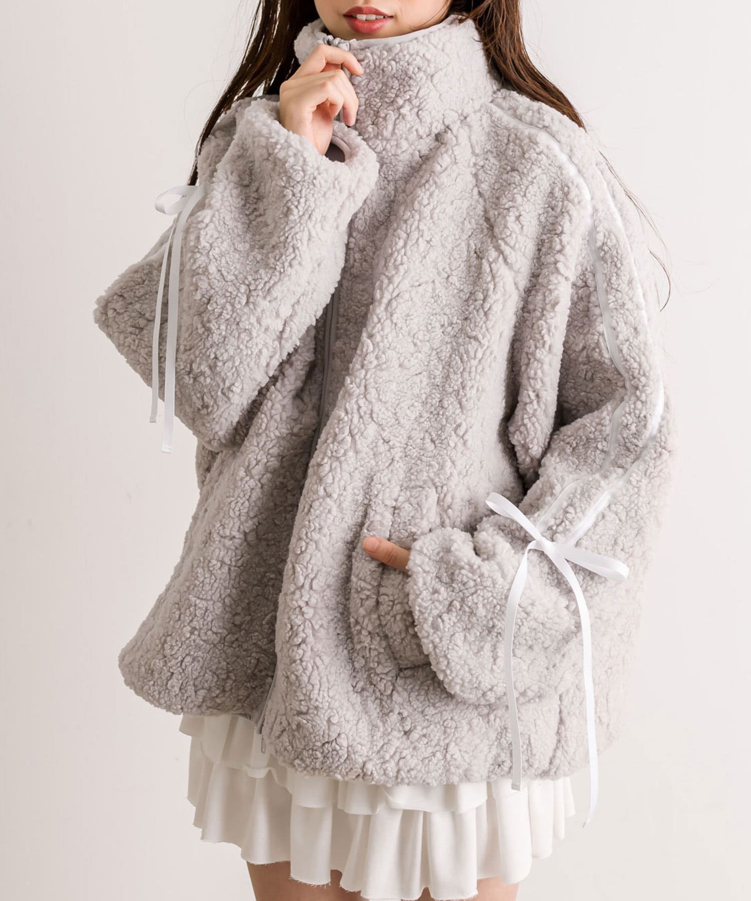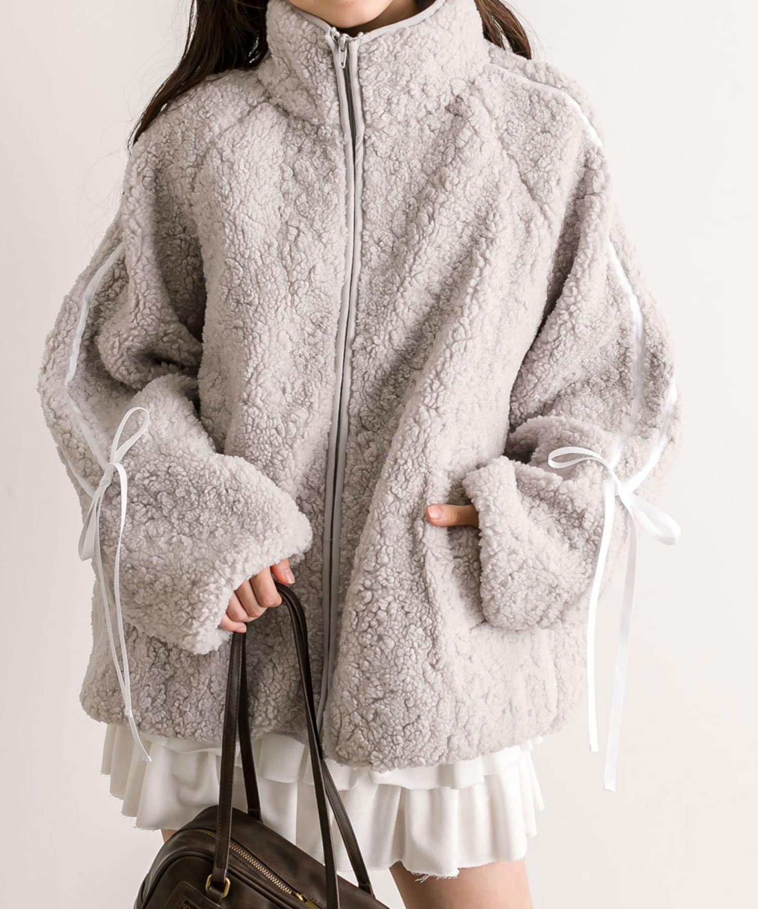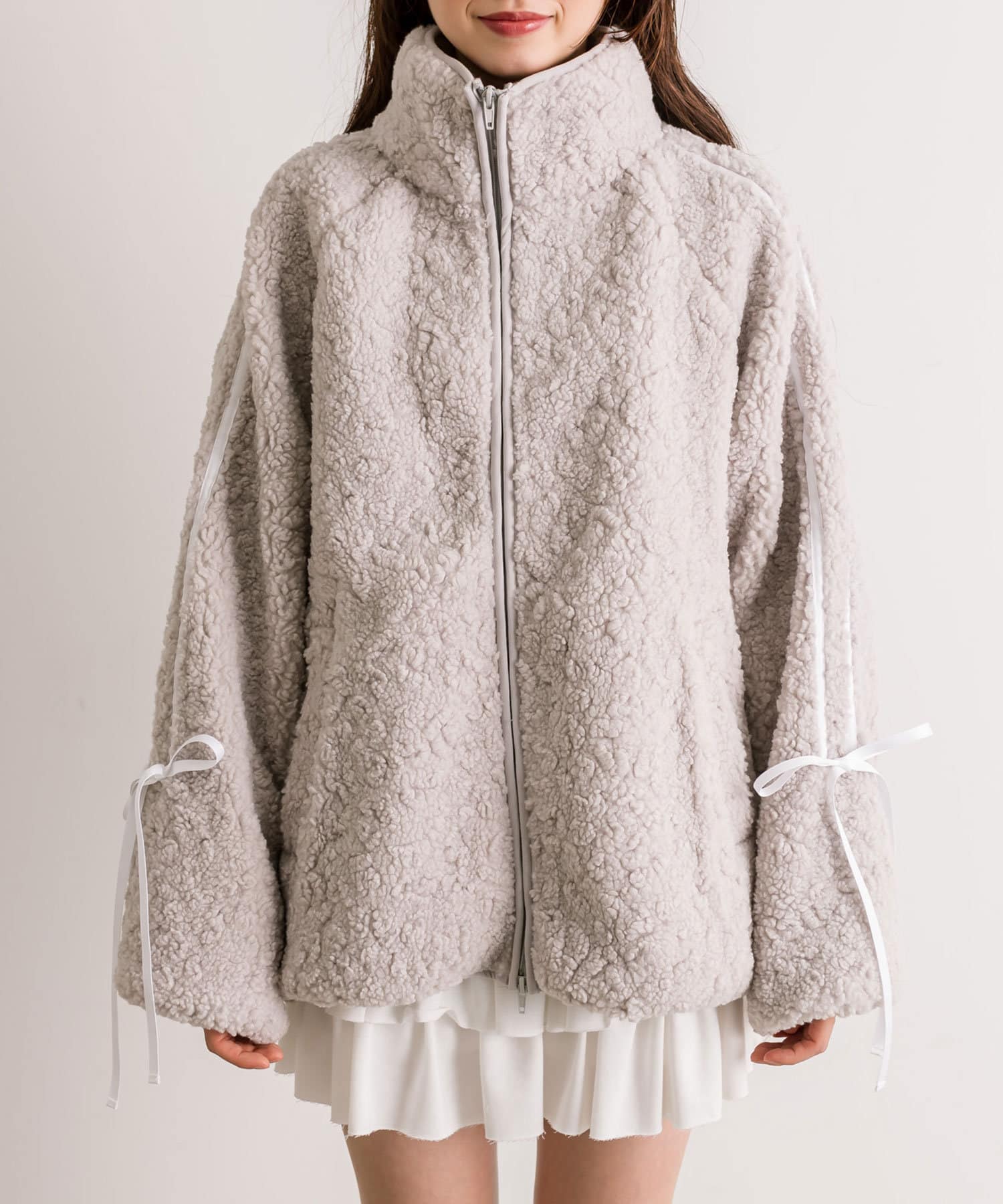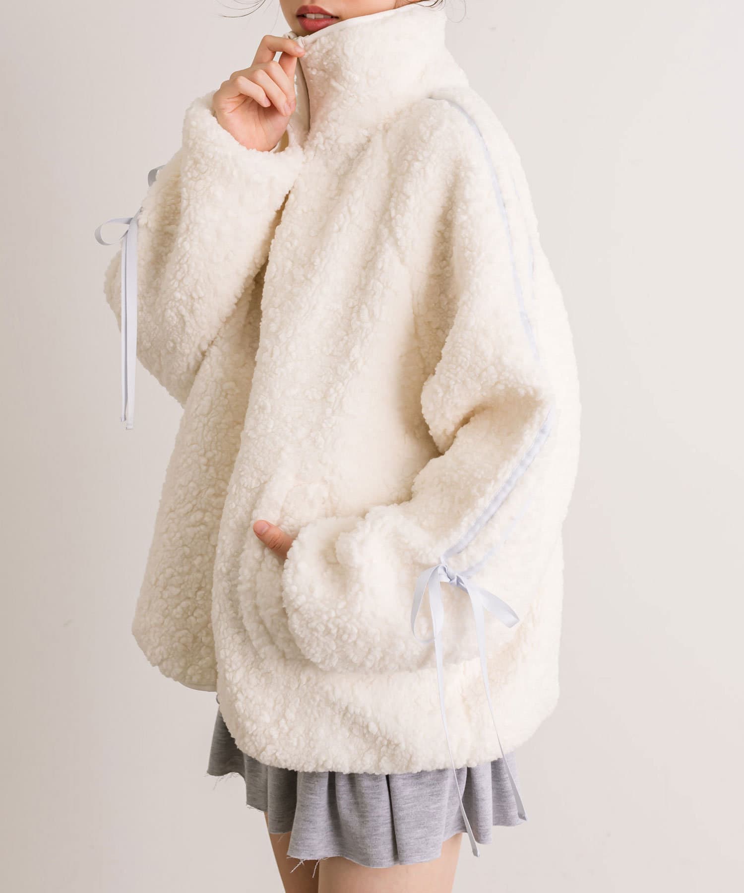 ・袖のラインとリボンがトレンドライクなボアブルゾン。