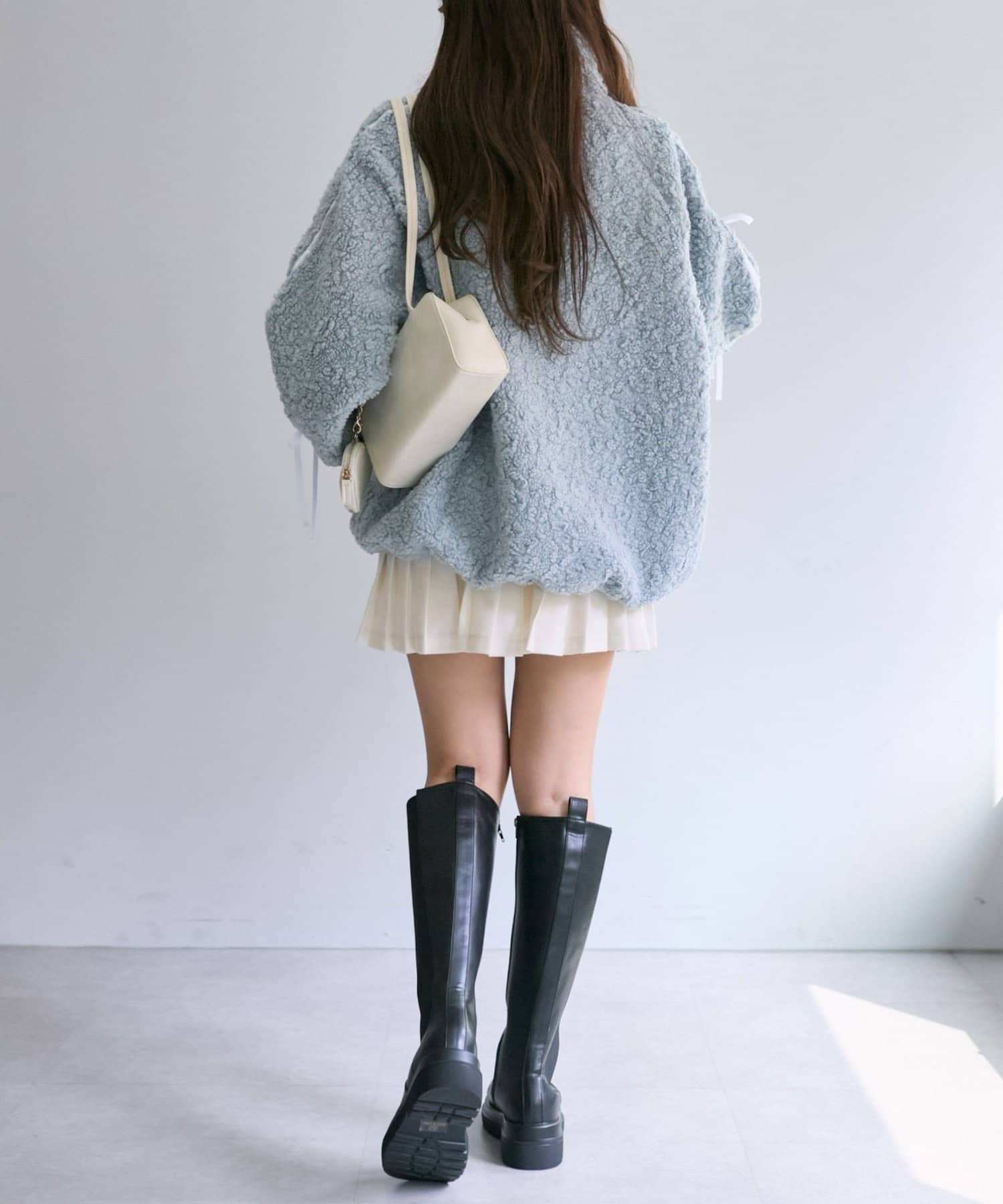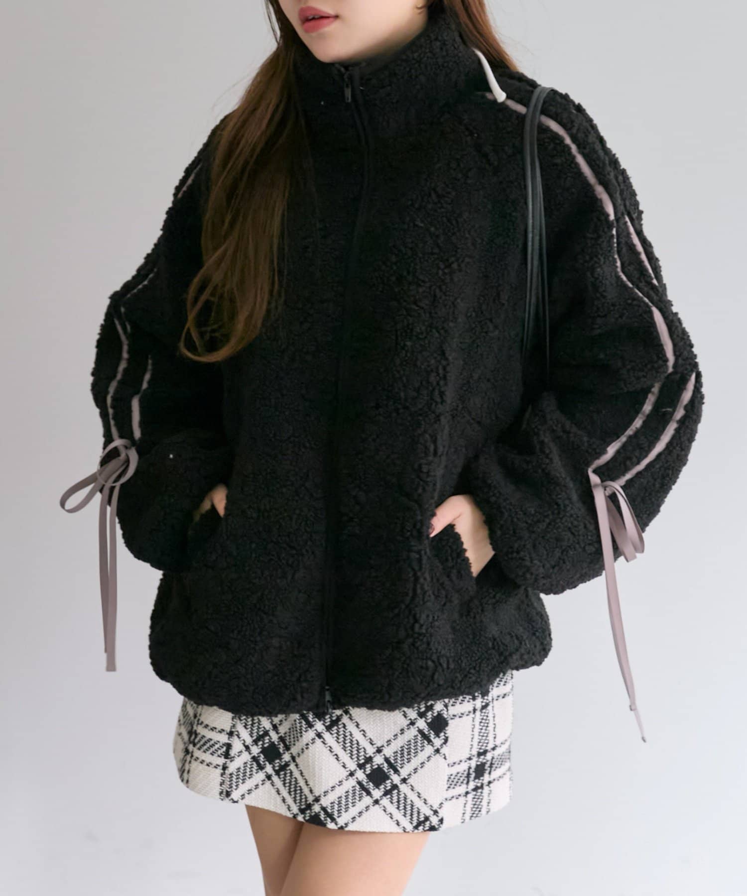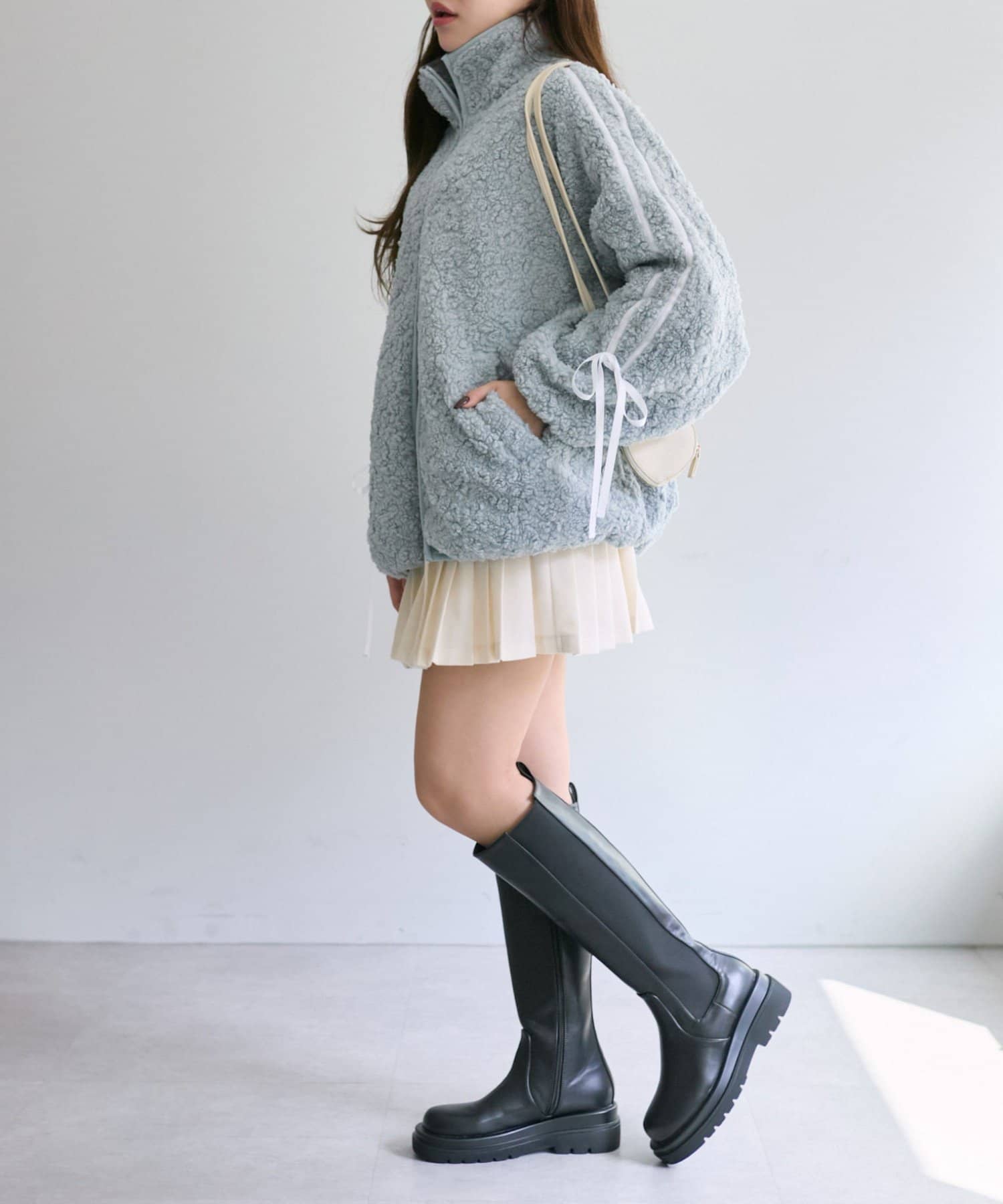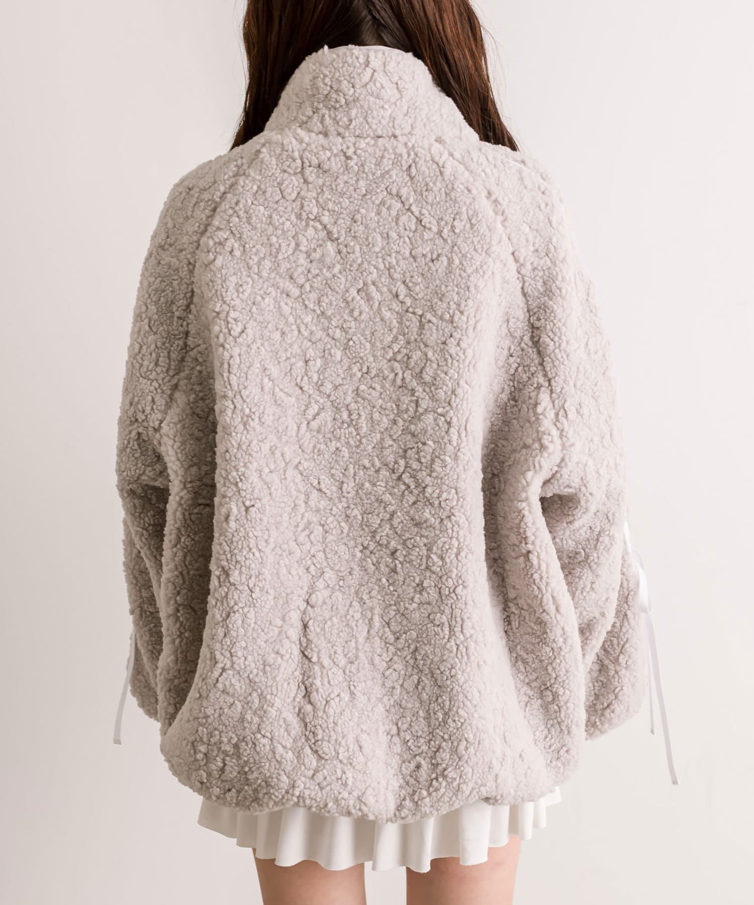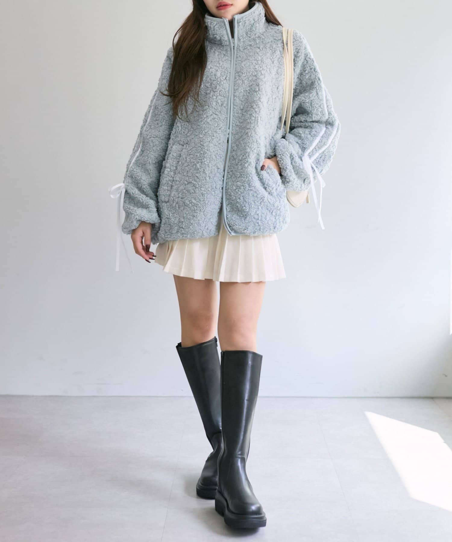 ・袖のラインとリボンがトレンドライクなボアブルゾン。