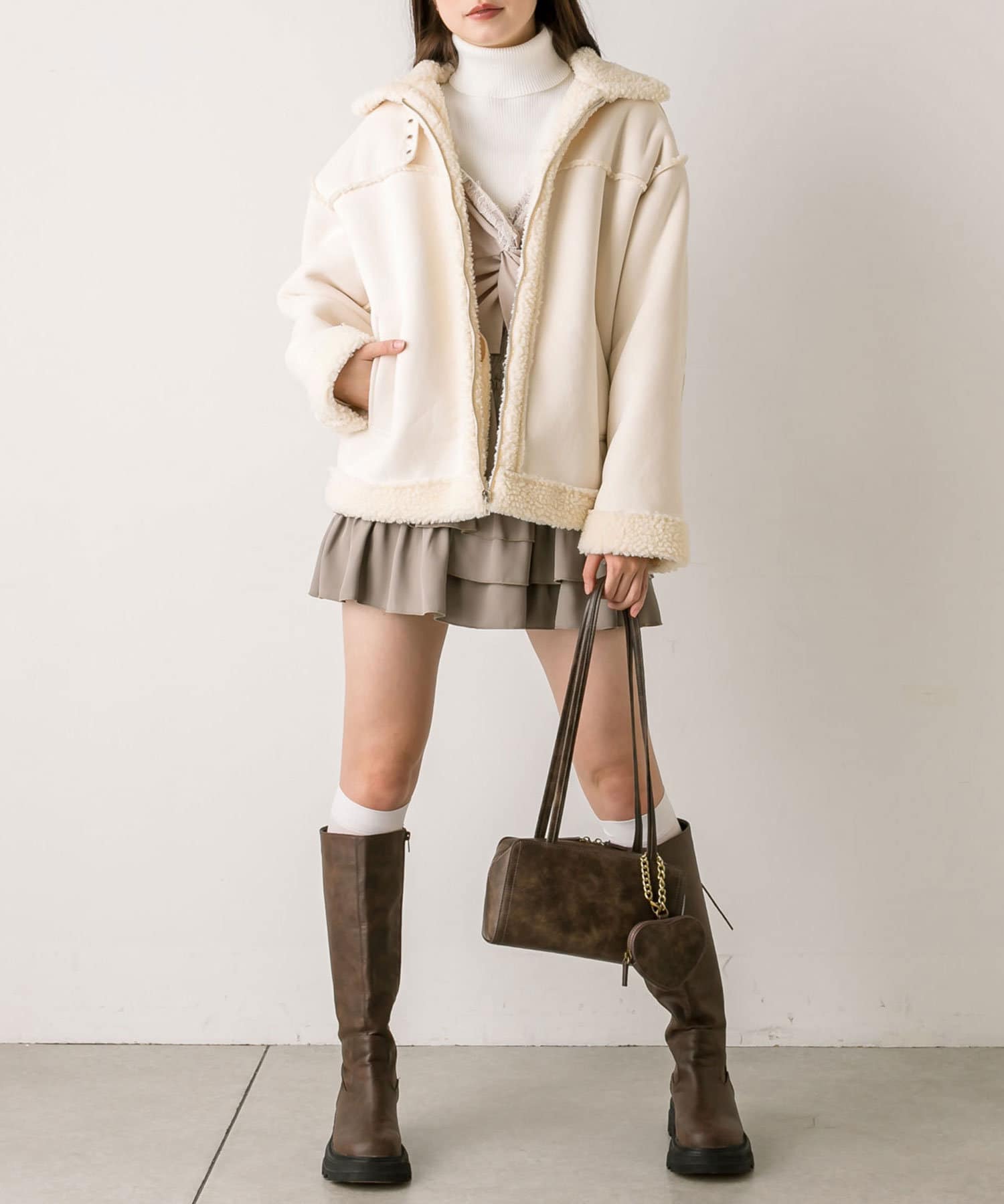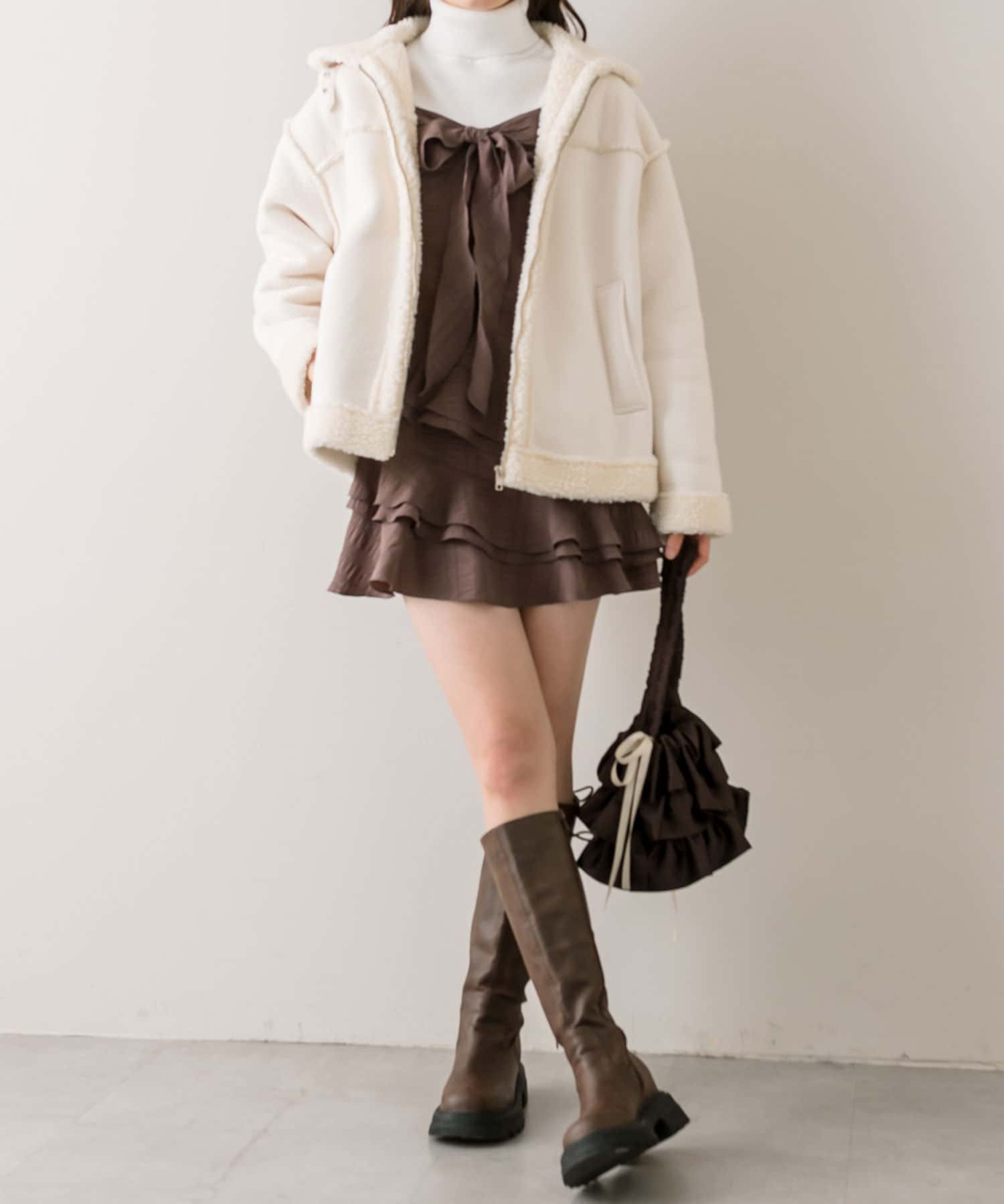 ・ミニボトムに、ロングブーツ合わせでガーリーコーデがおすすめです。