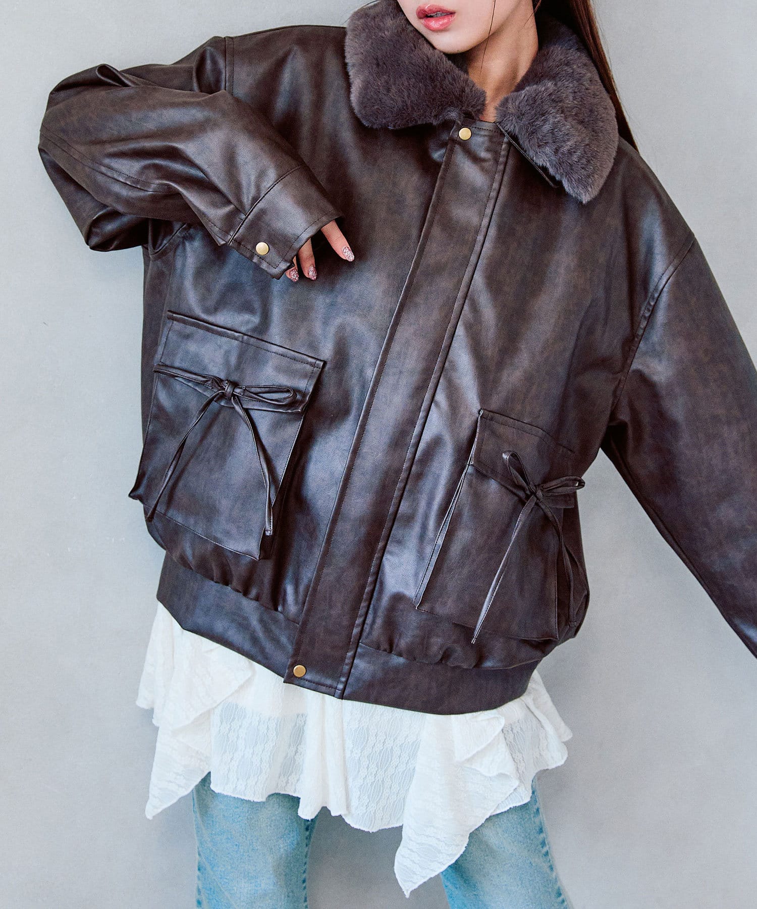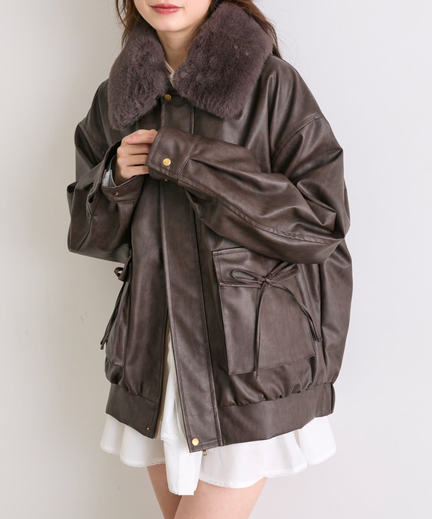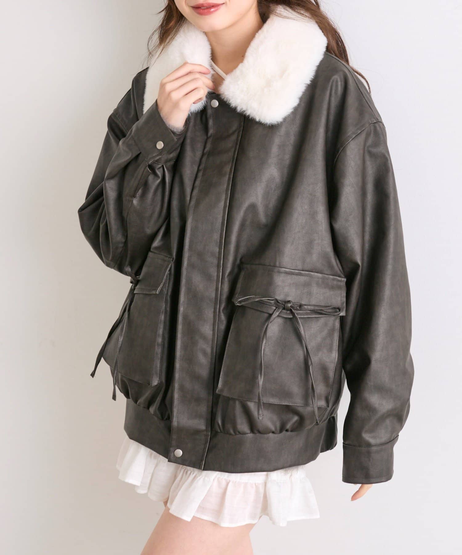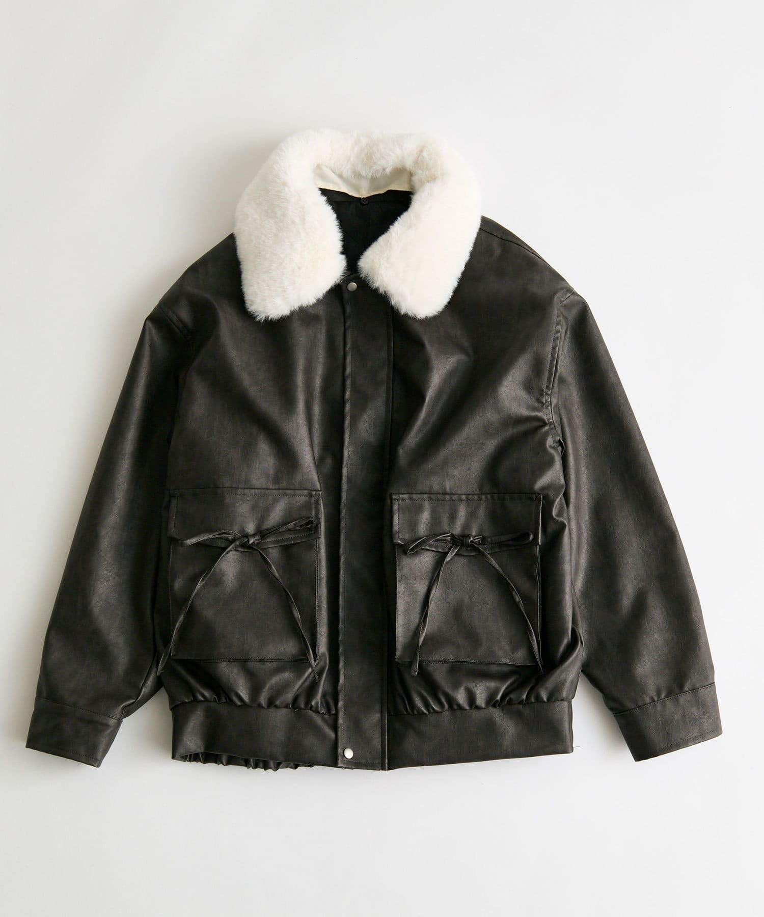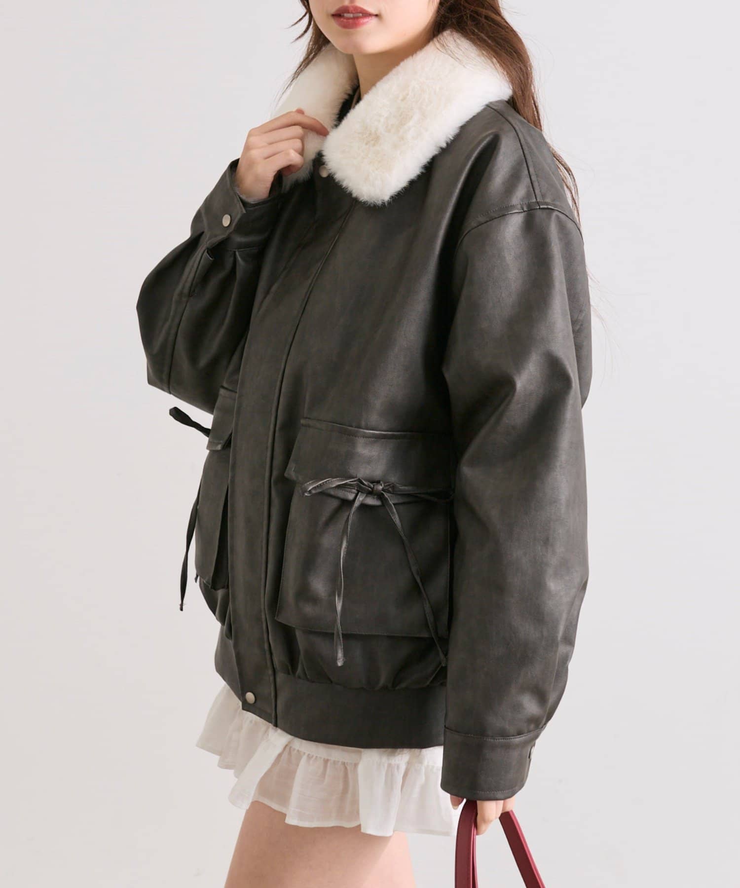 リボンとファーでガーリーデザインのエコレザーブルゾン