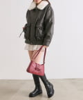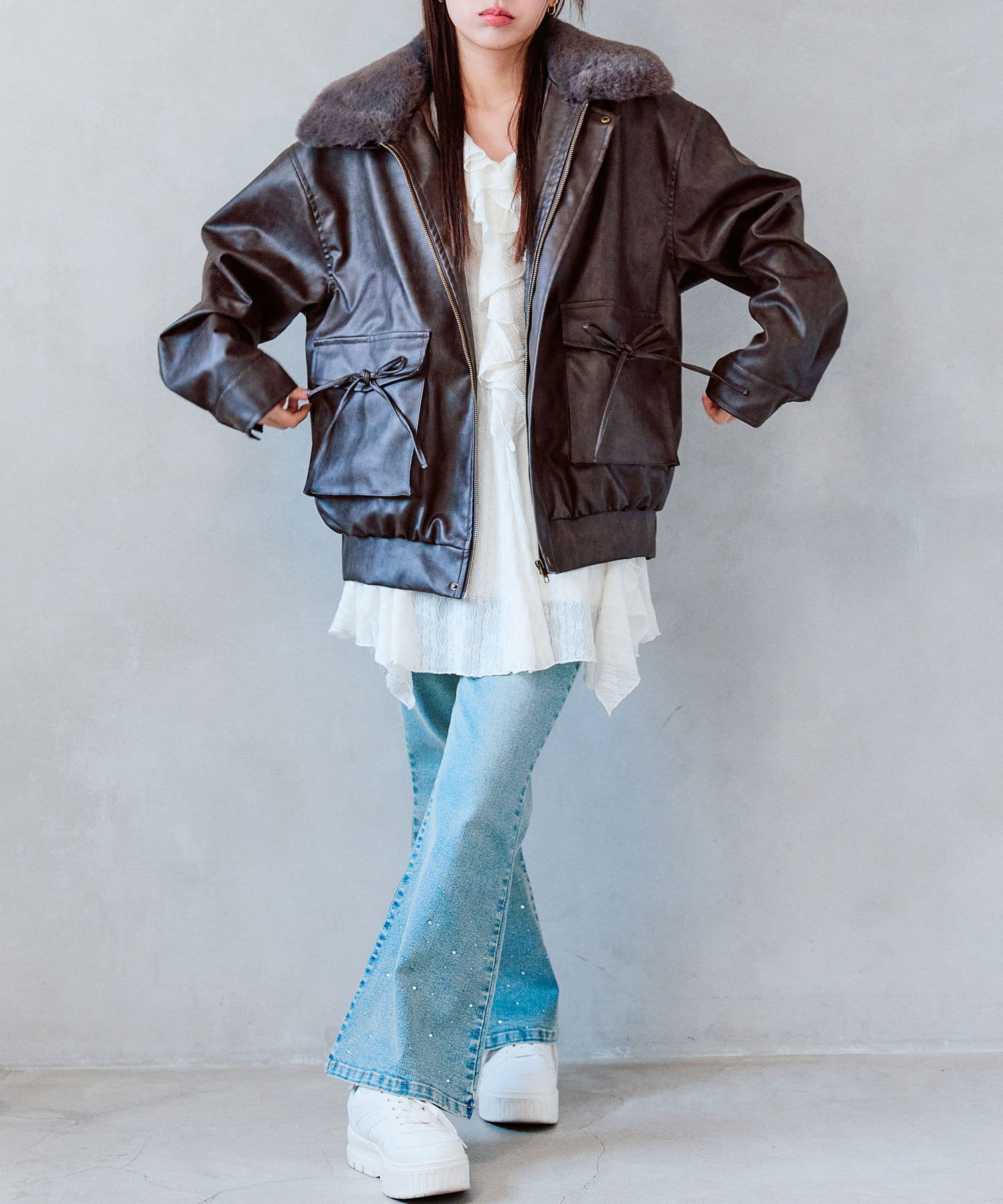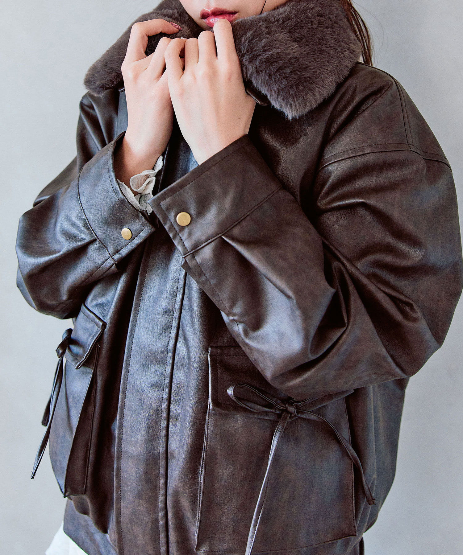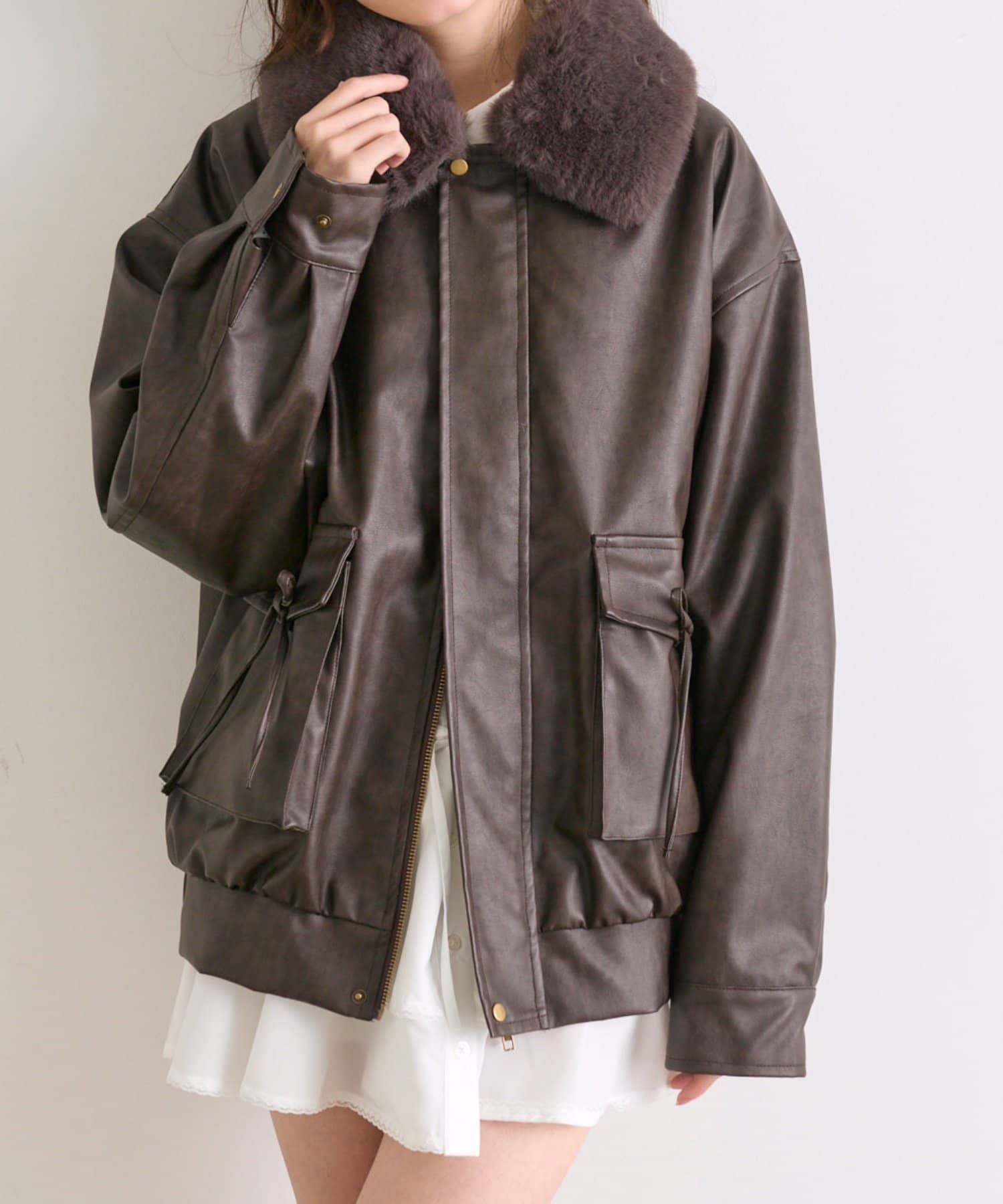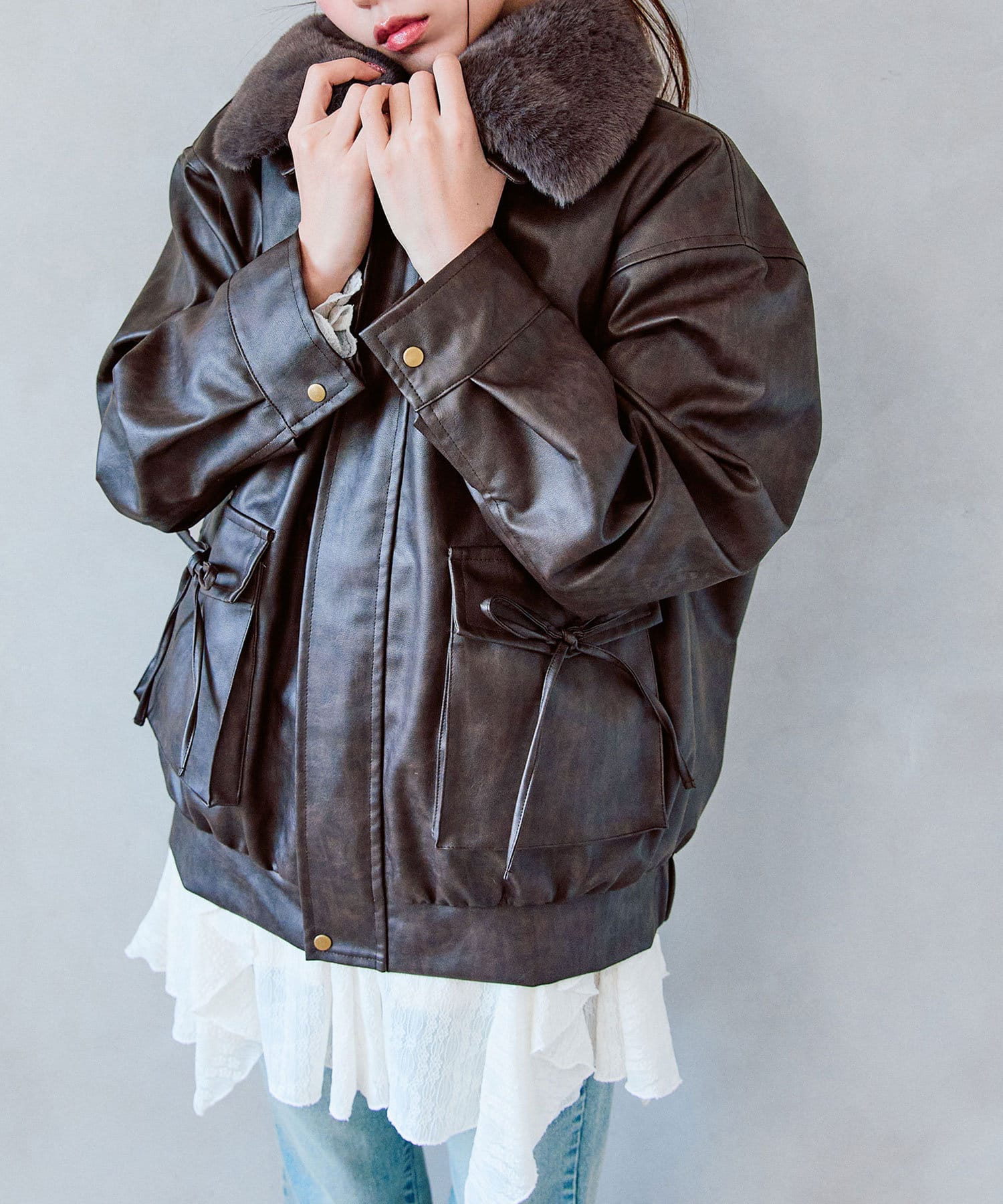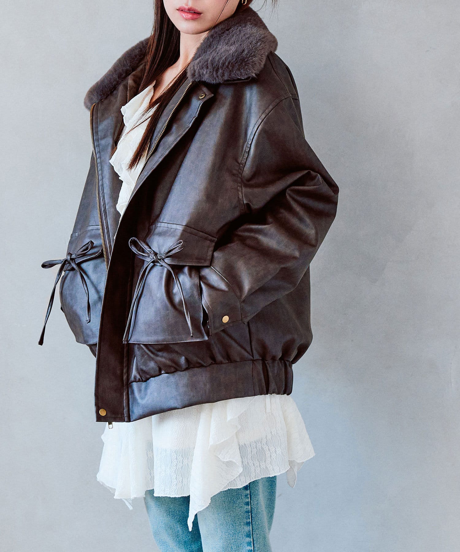 リボンとファーでガーリーデザインのエコレザーブルゾン
