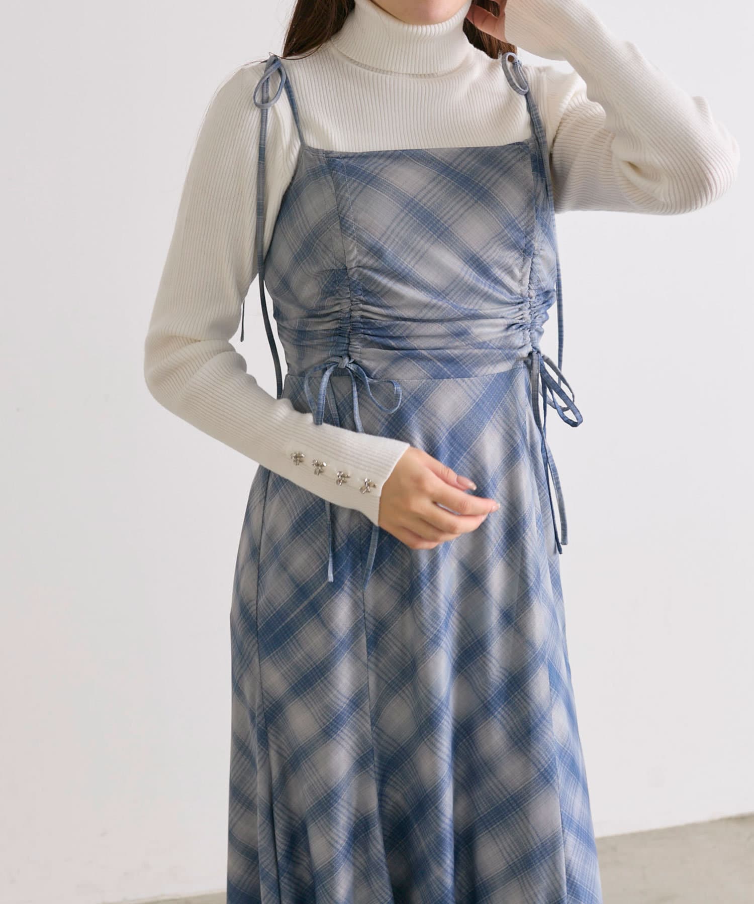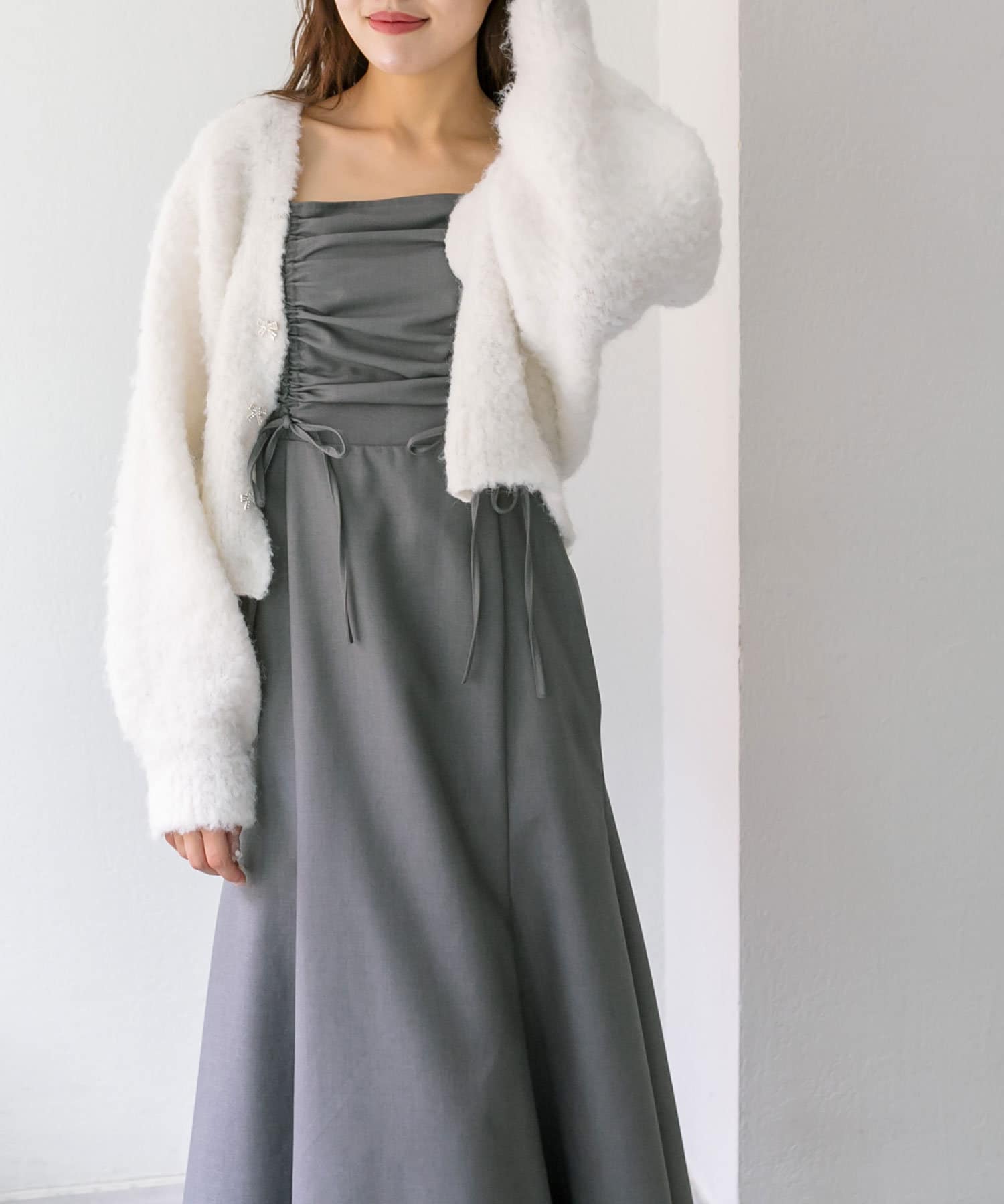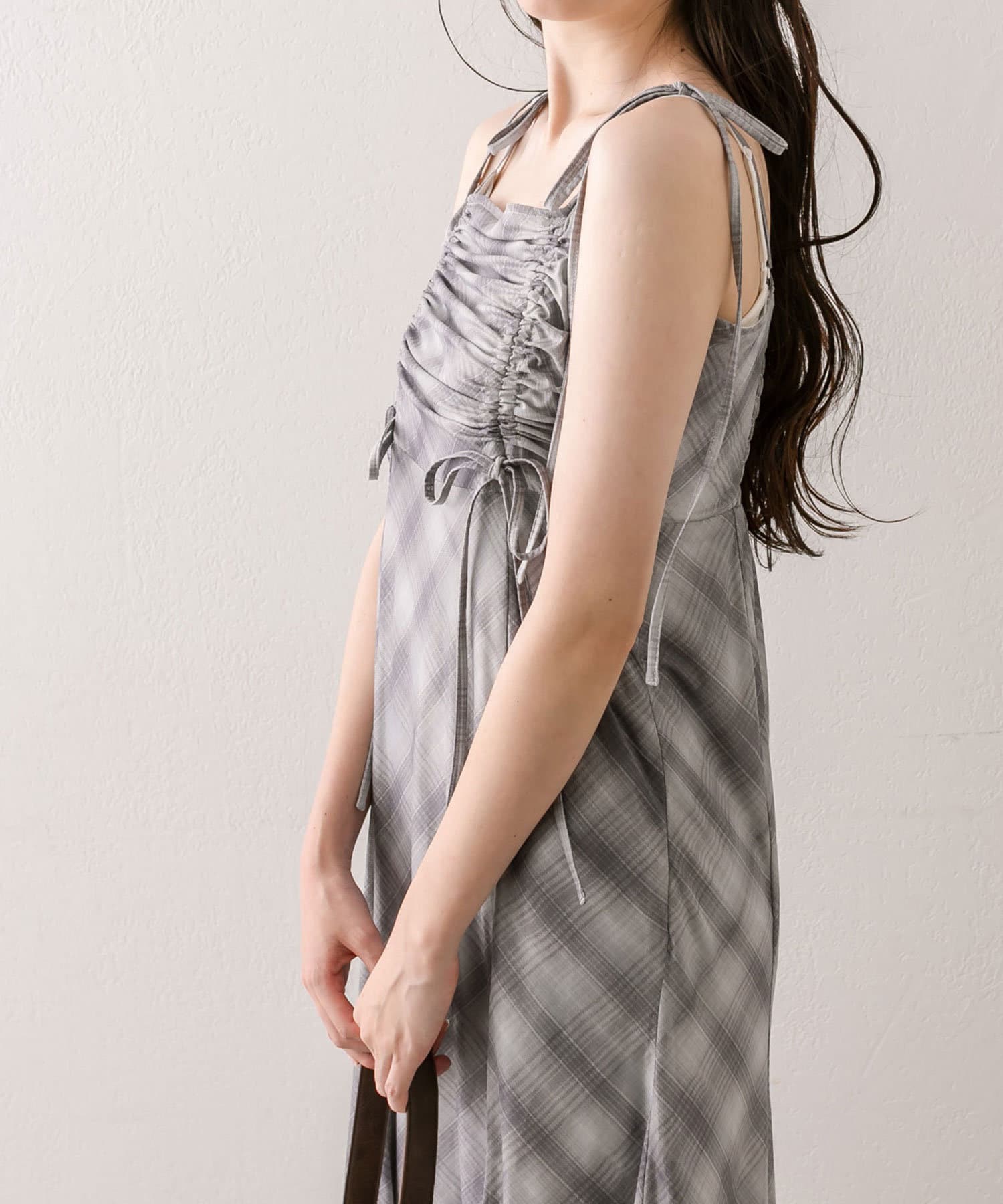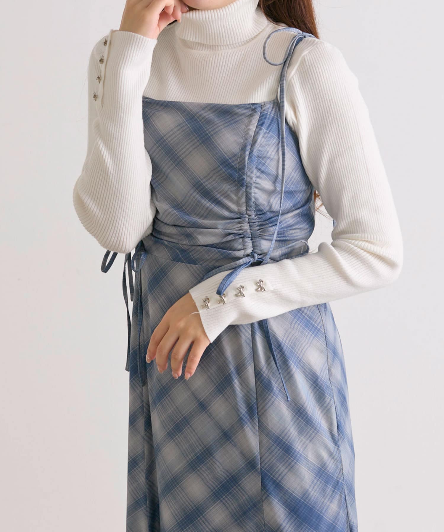 ・胸元のドロストは体型に合わせて調節できて、お好きな位置でリボンが結べルデザインです。