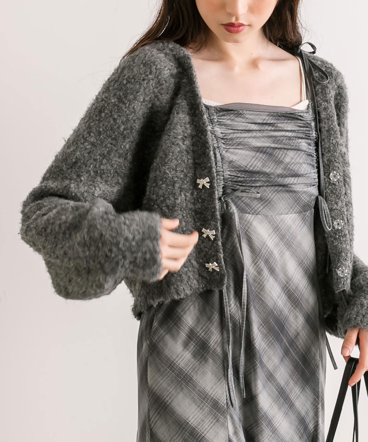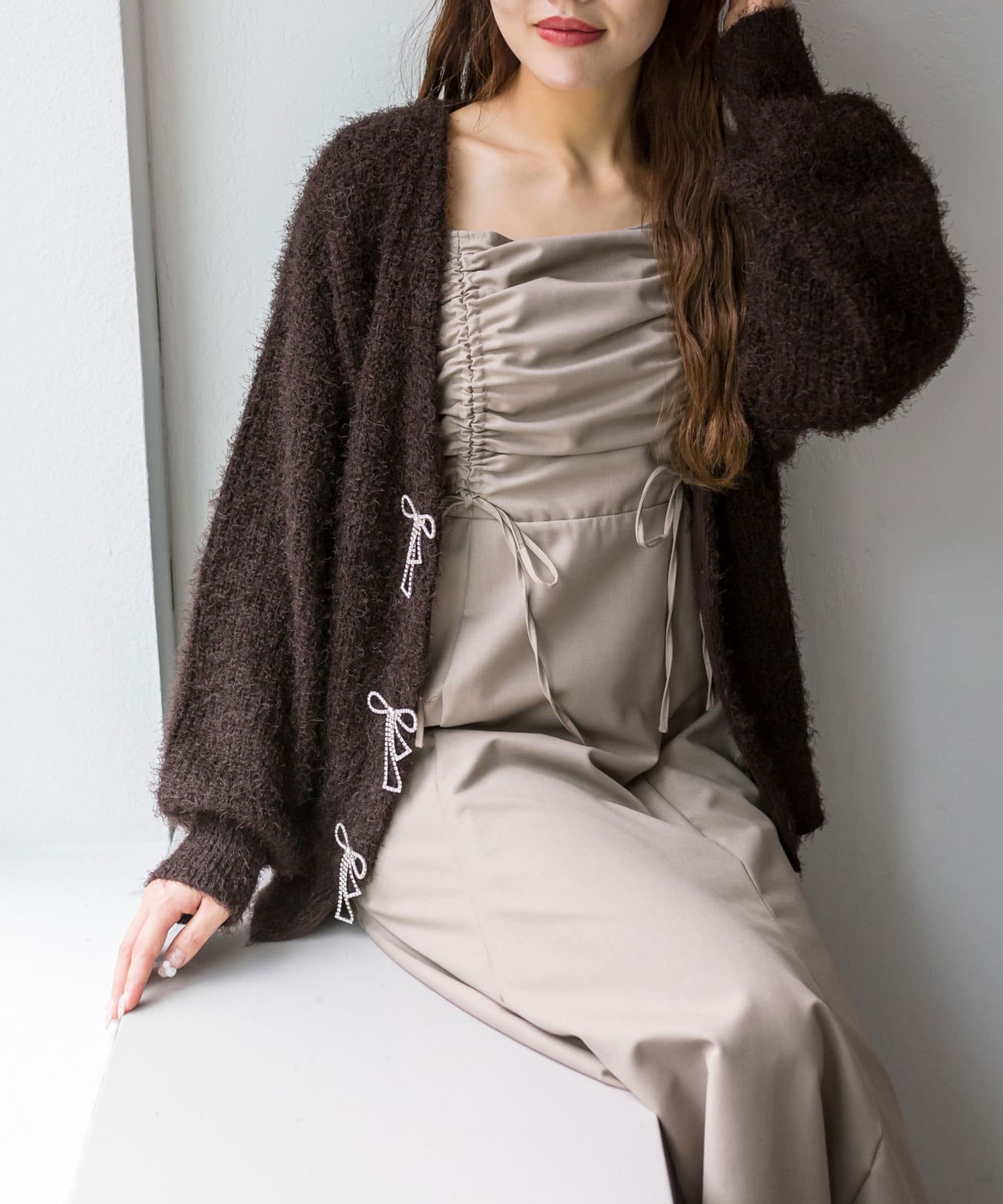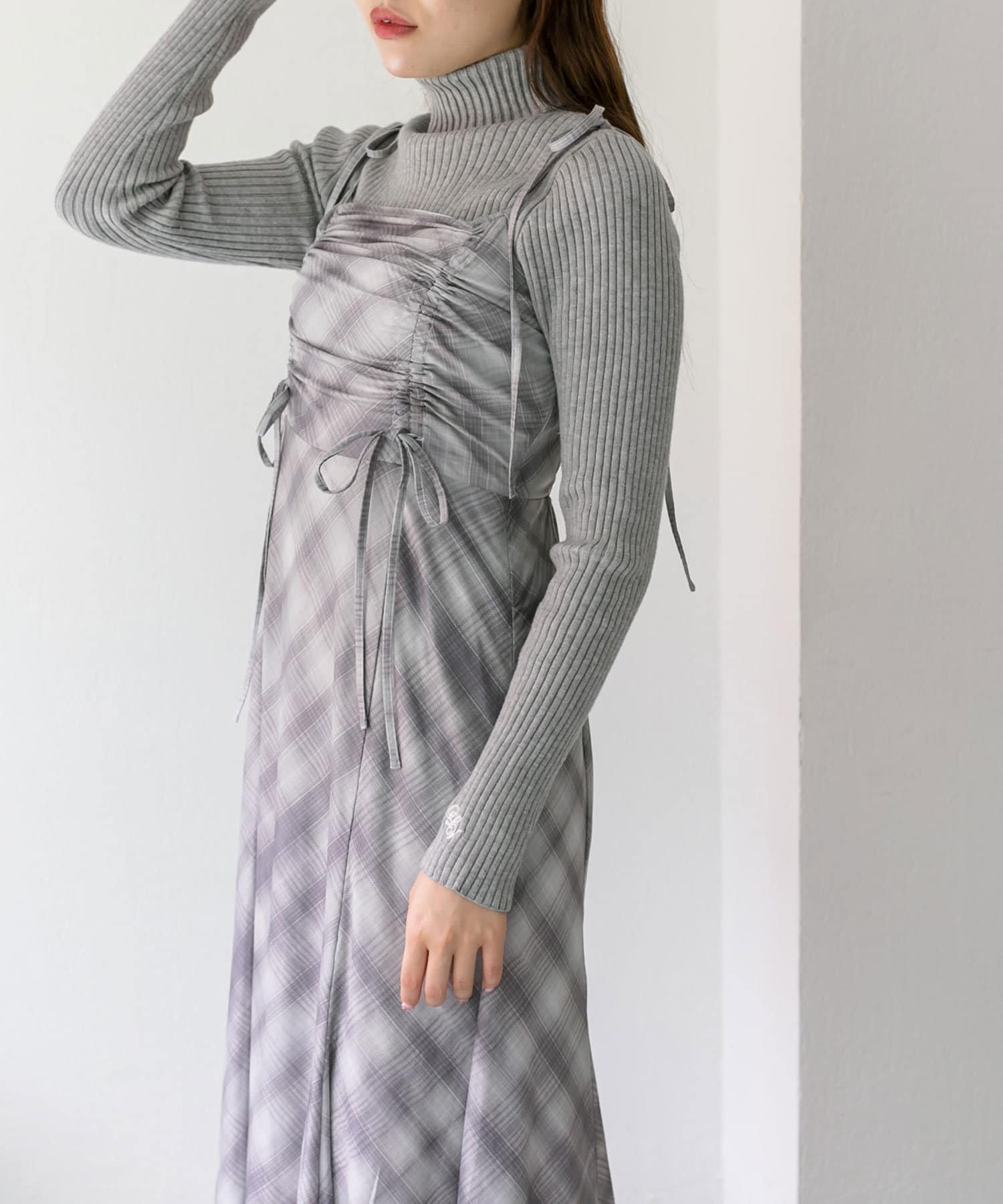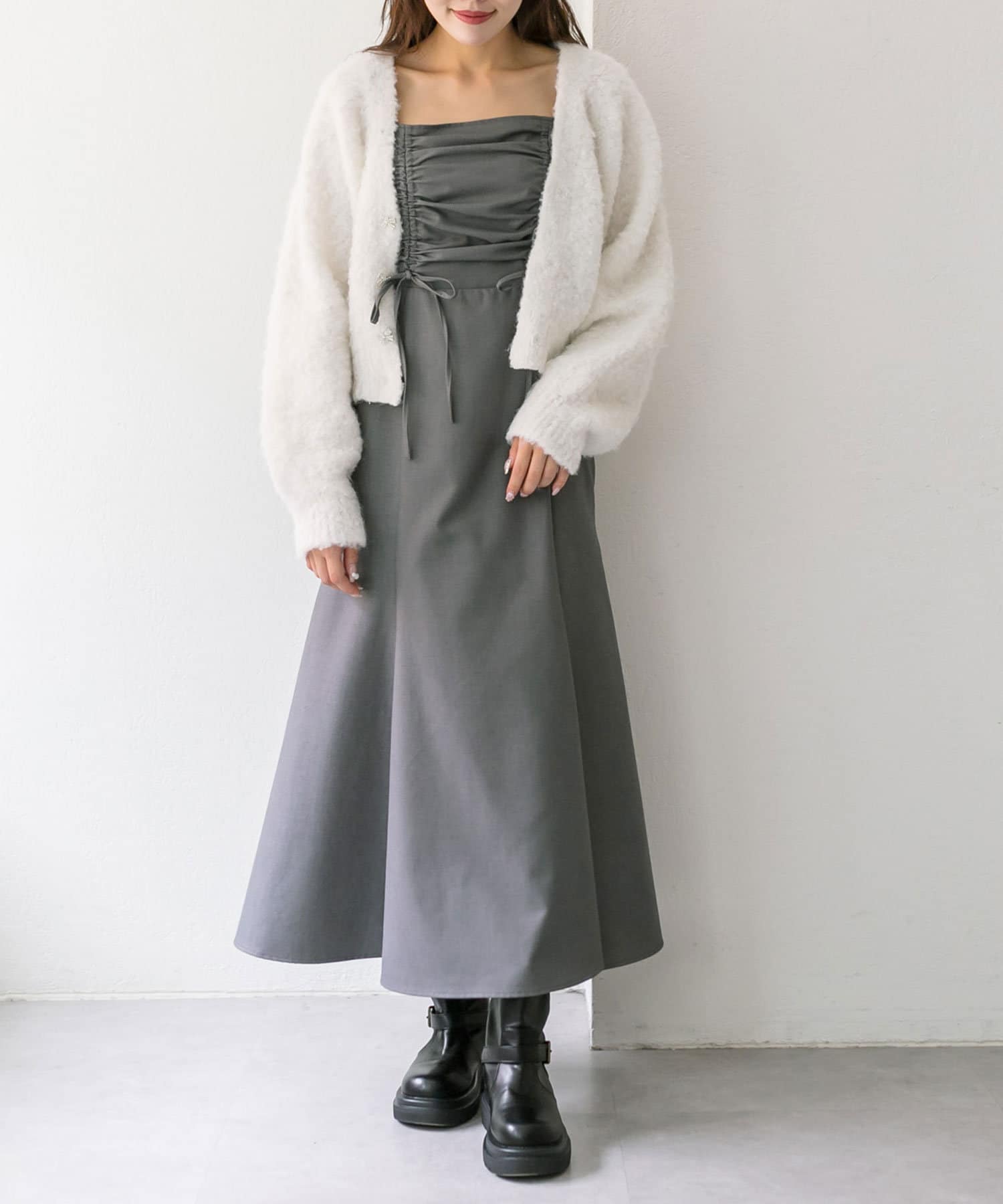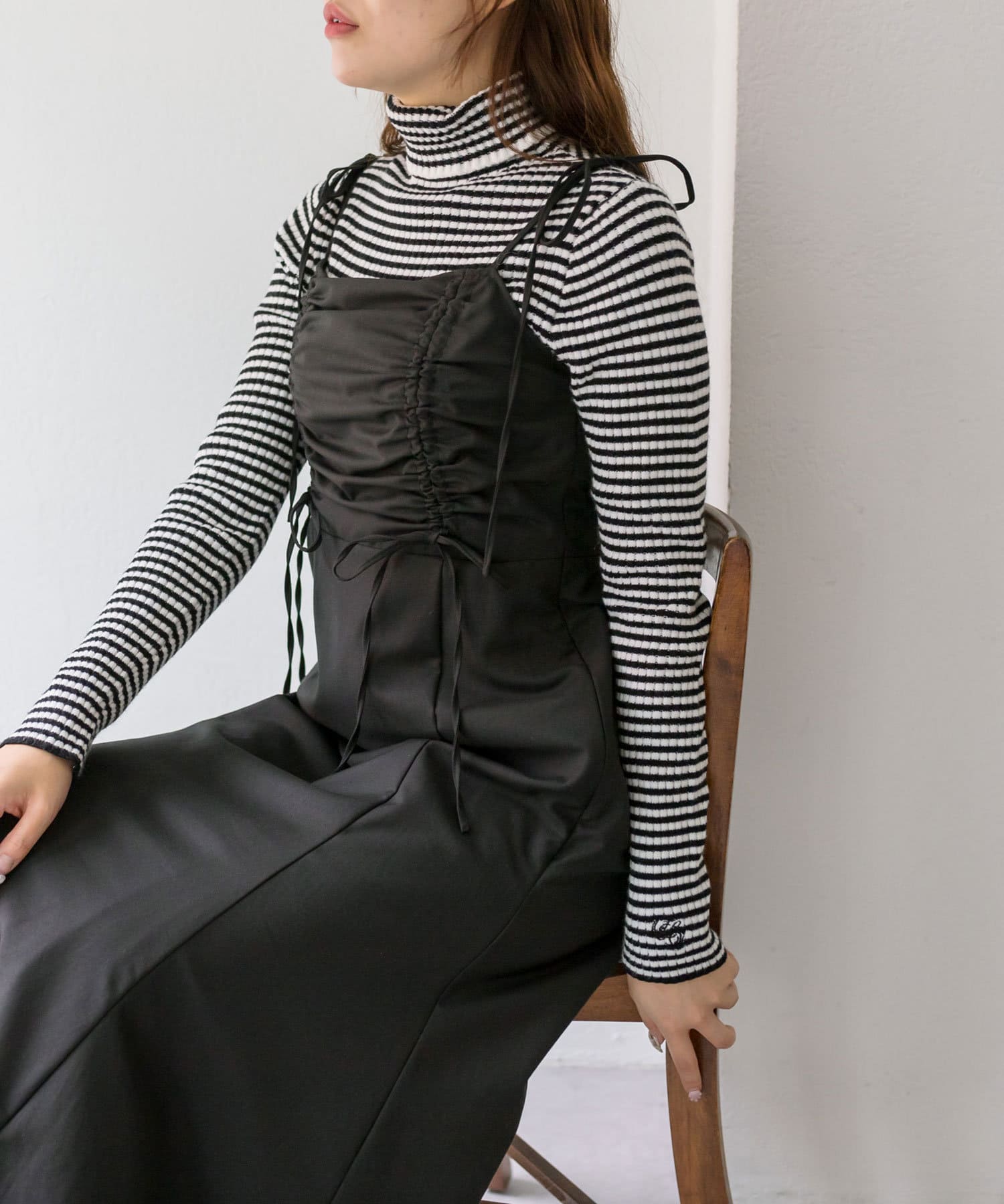 ・胸元のドロストは体型に合わせて調節できて、お好きな位置でリボンが結べルデザインです。