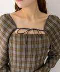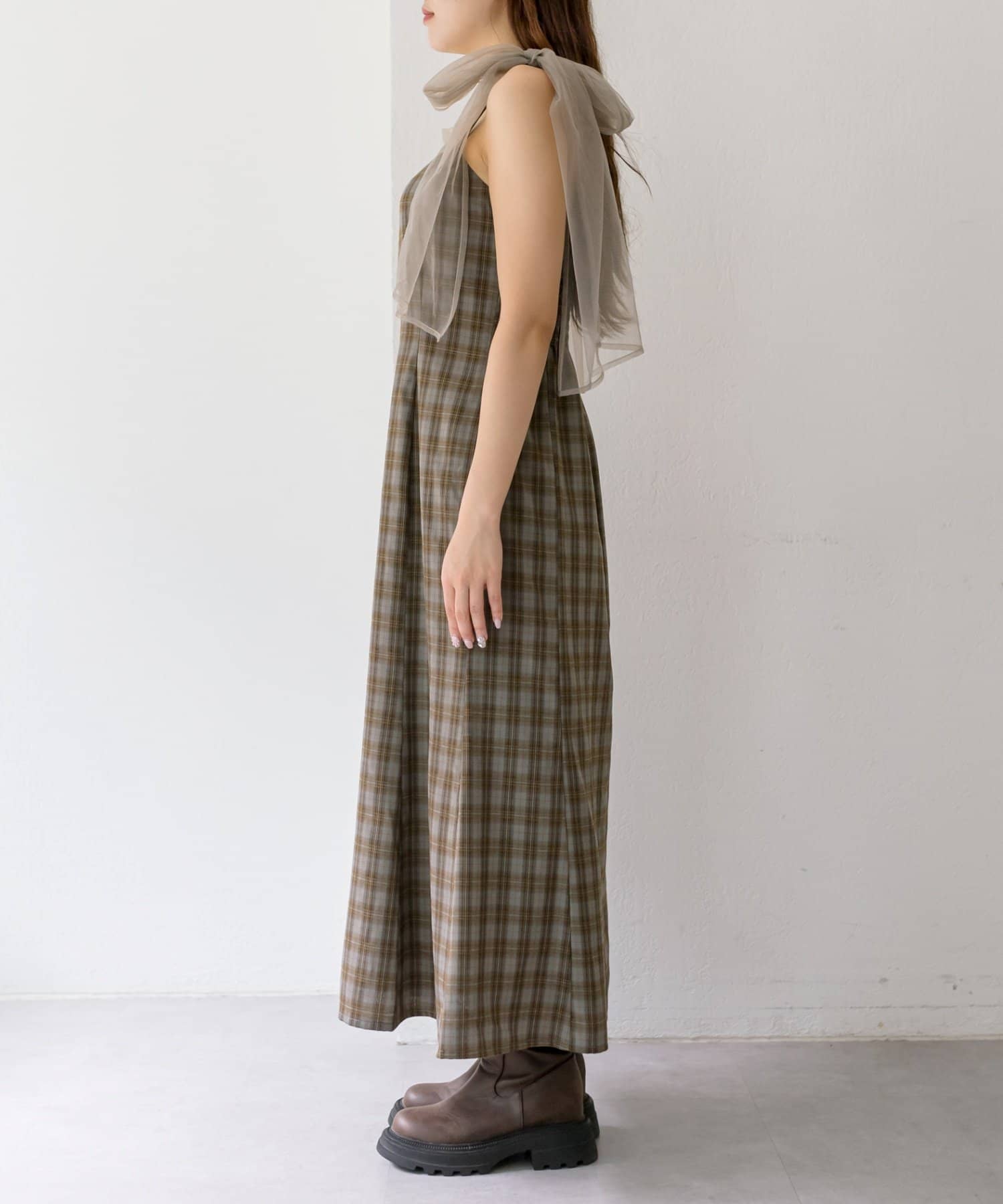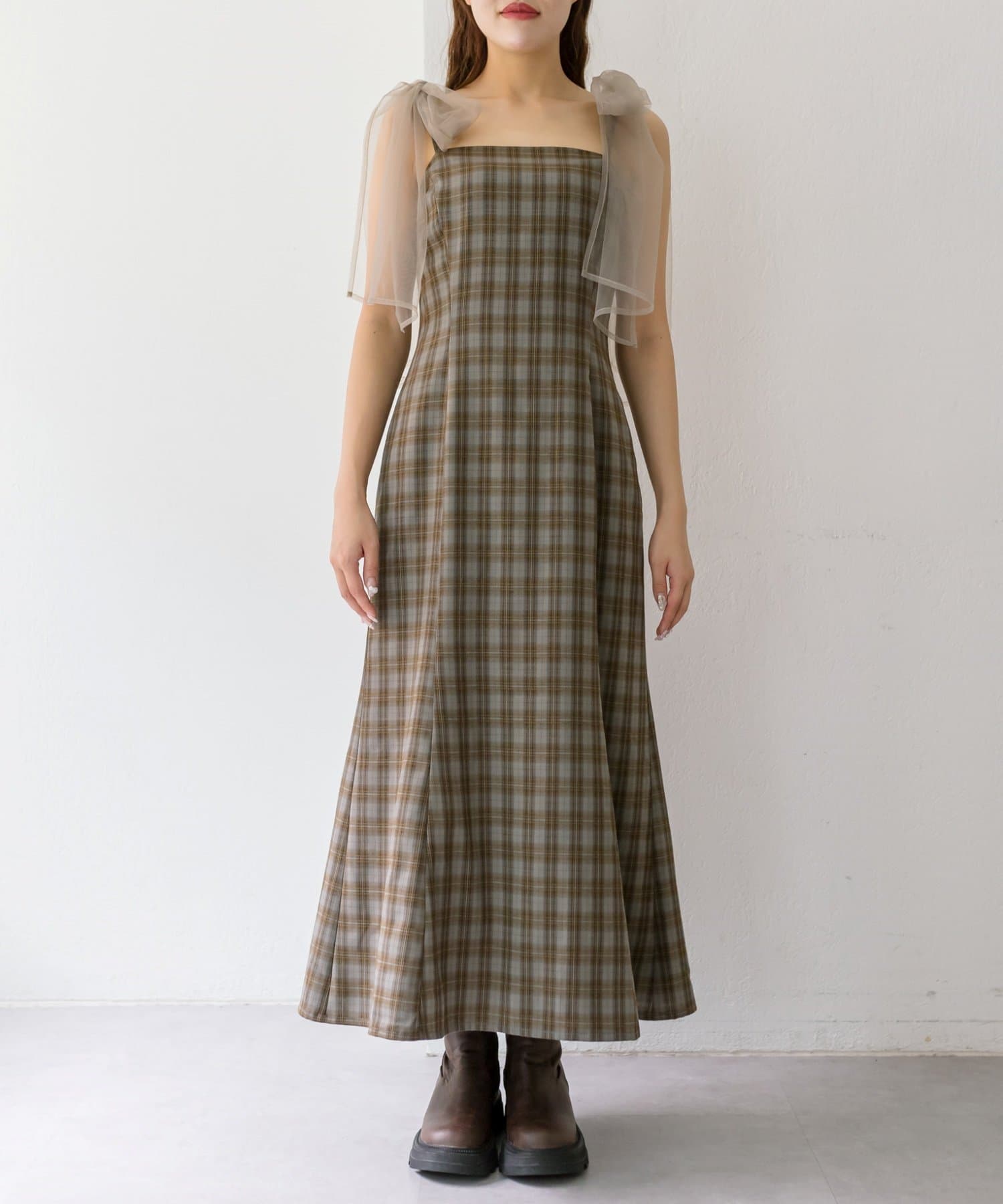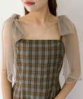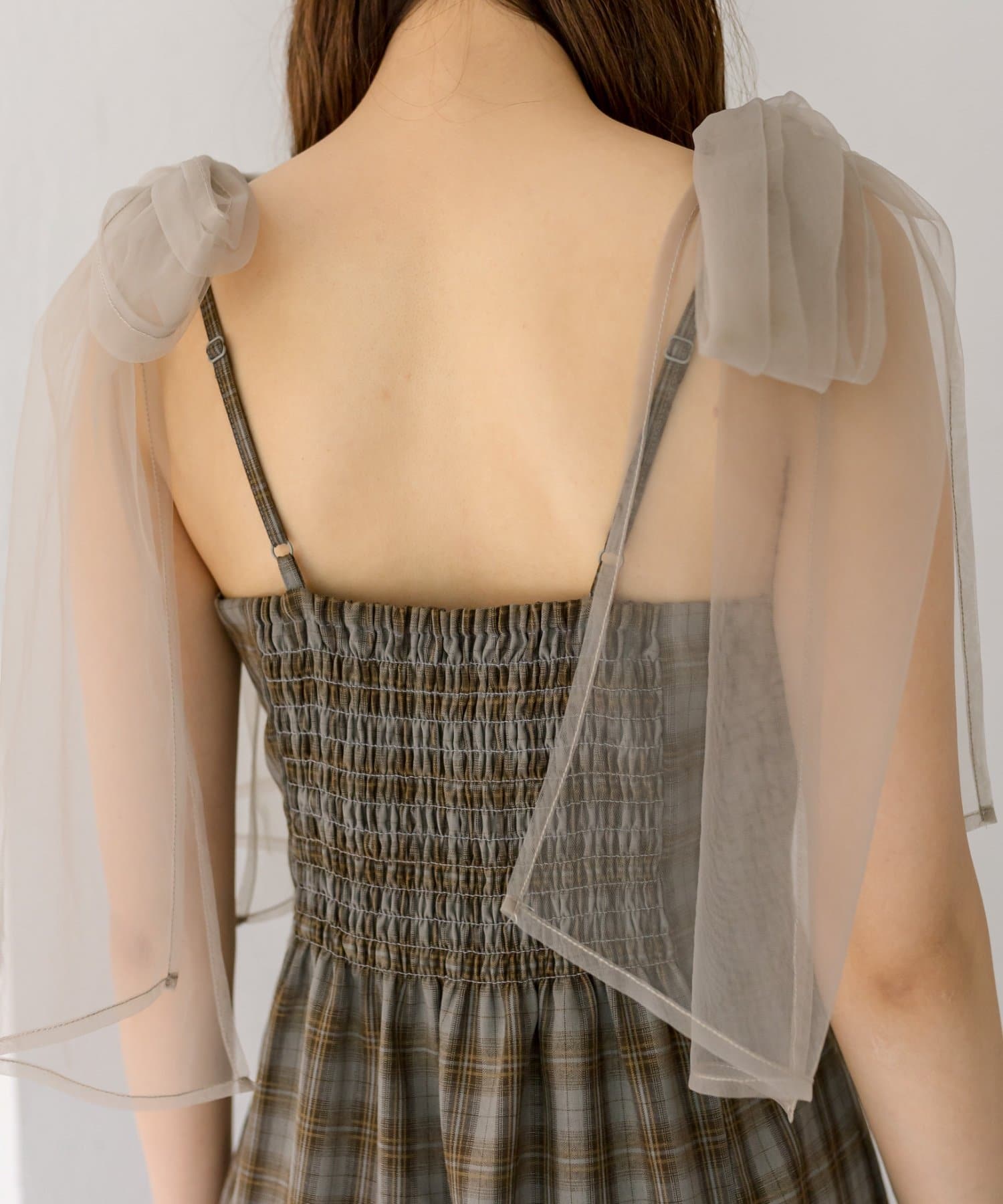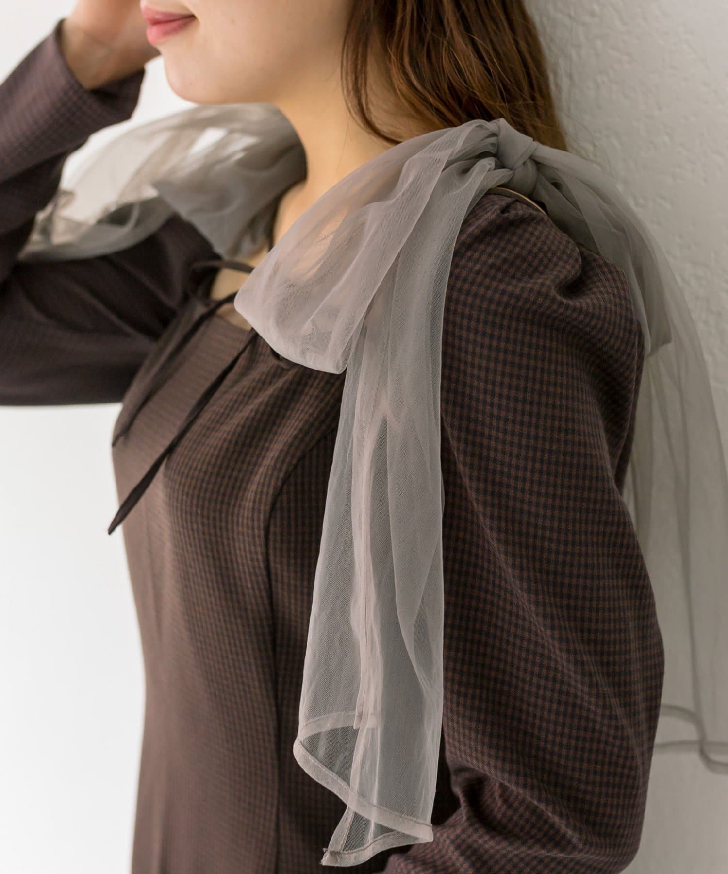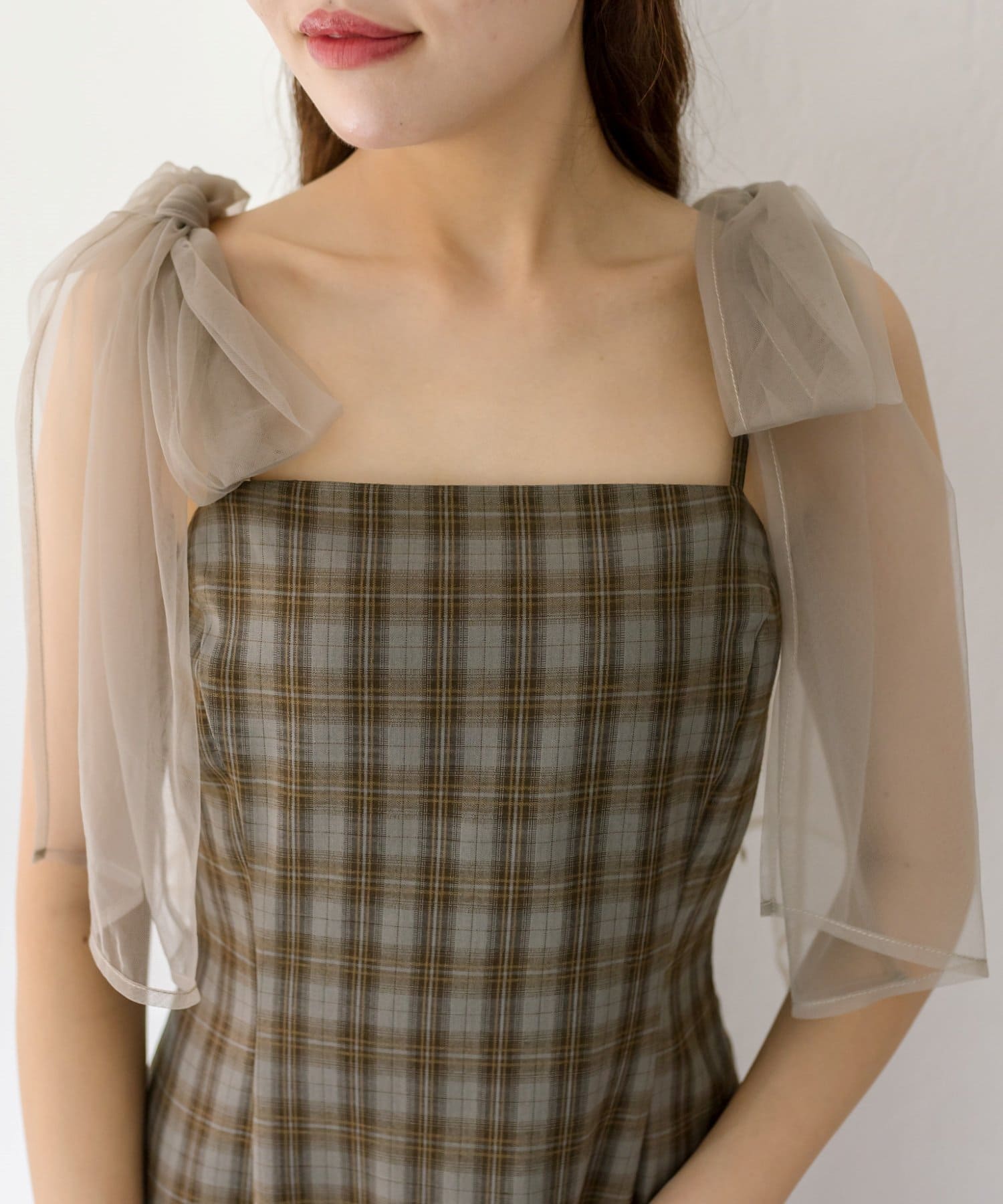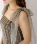 ・ワンピースの肩紐に取り外し可能なチュールリボンが付いていて、顔周りが華やかになります。