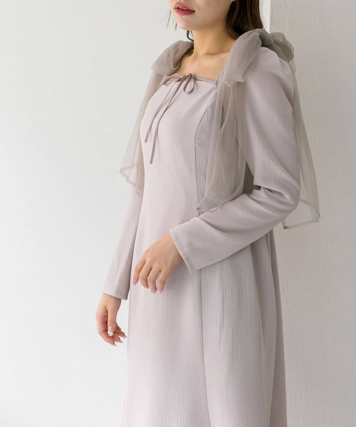 ・ワンピースの肩紐に取り外し可能なチュールリボンが付いていて、顔周りが華やかになります。