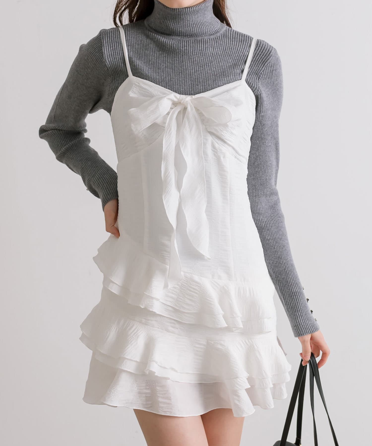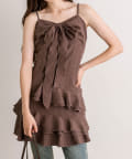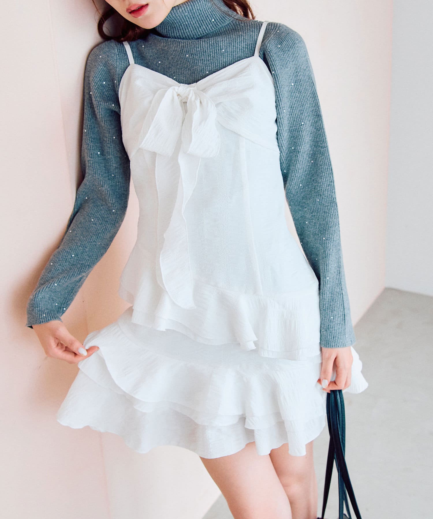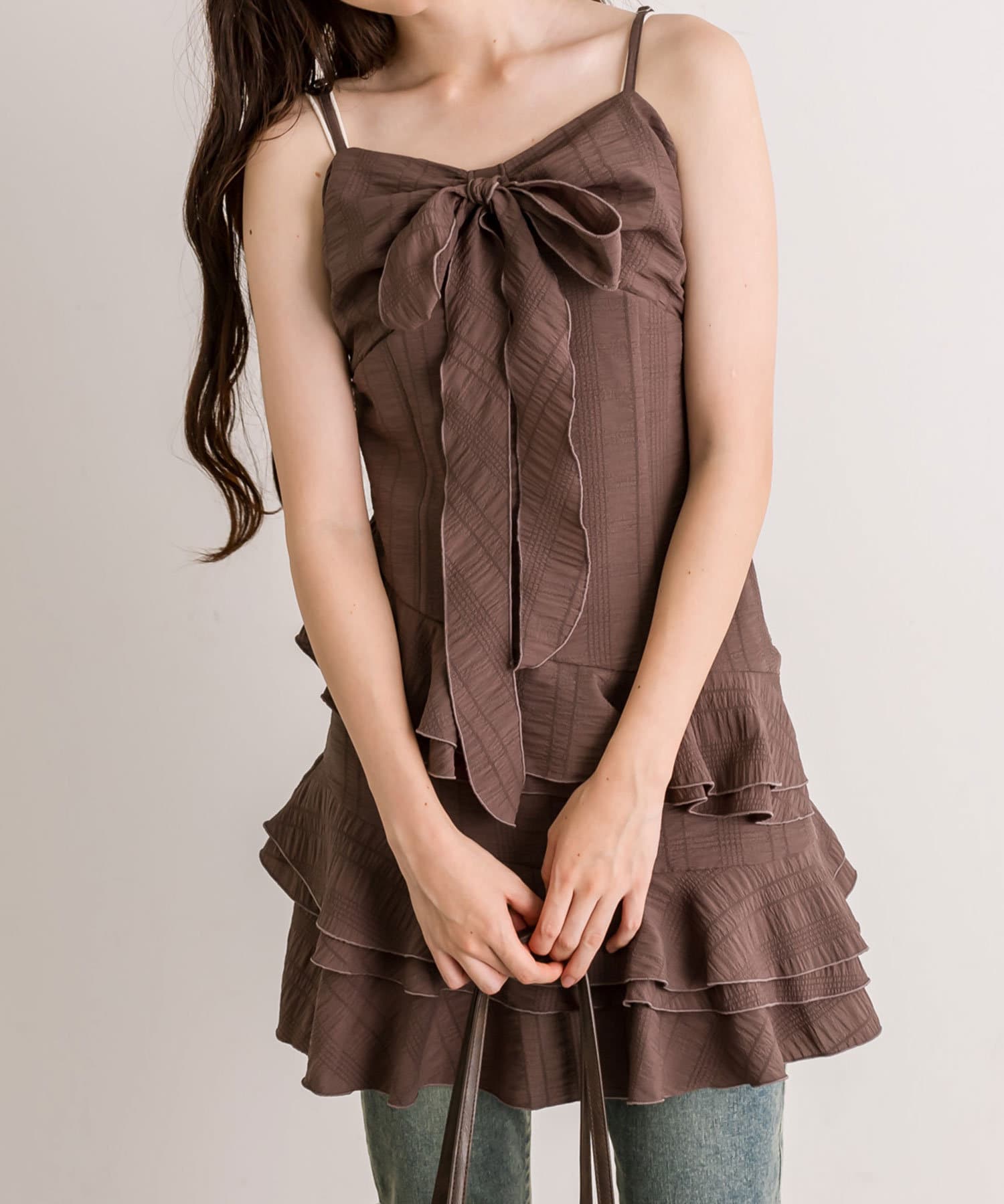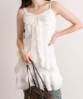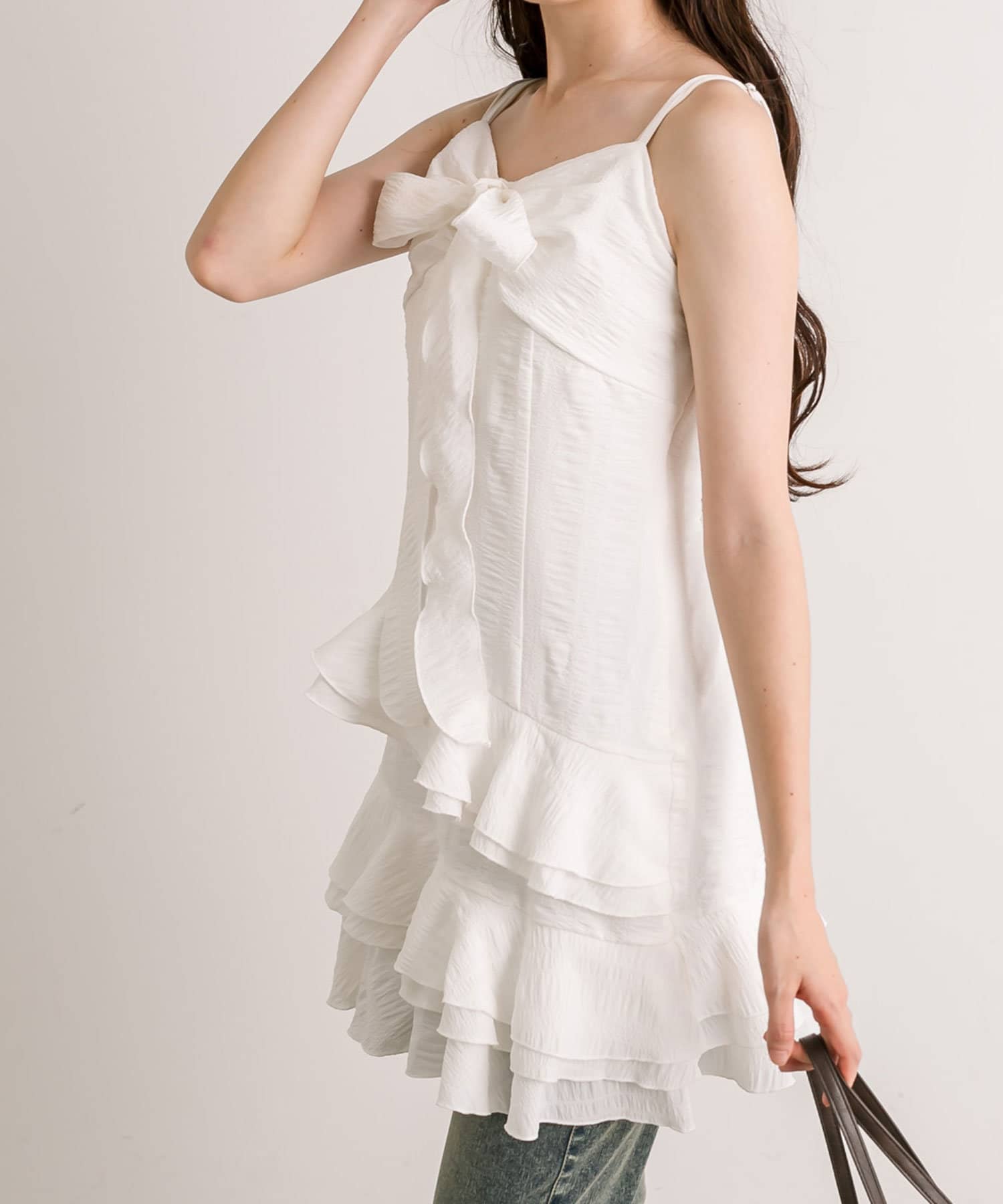 ・胸元のリボンや裾のラッフルなどかわいい要素が詰まったキャミワンピ。
