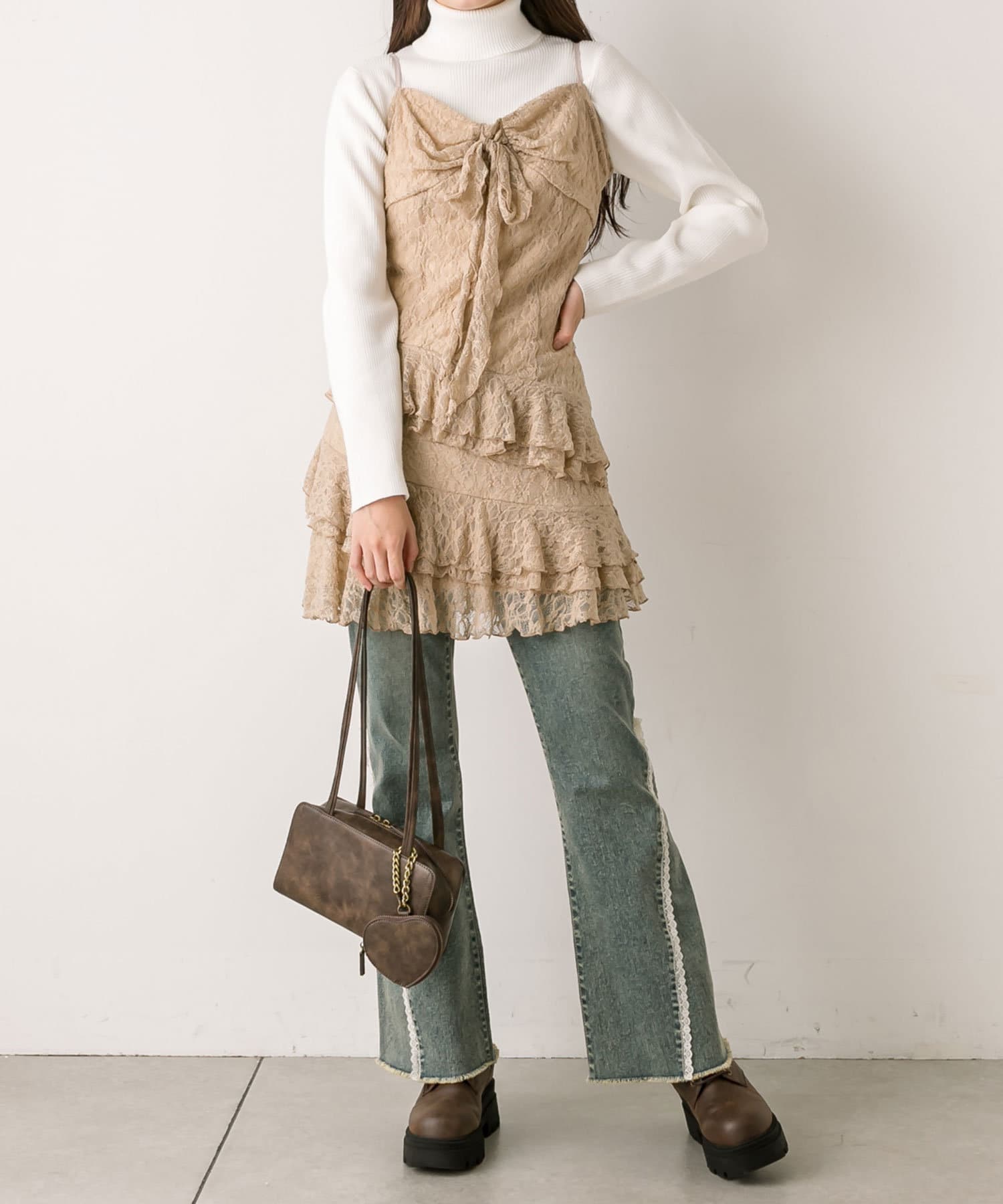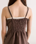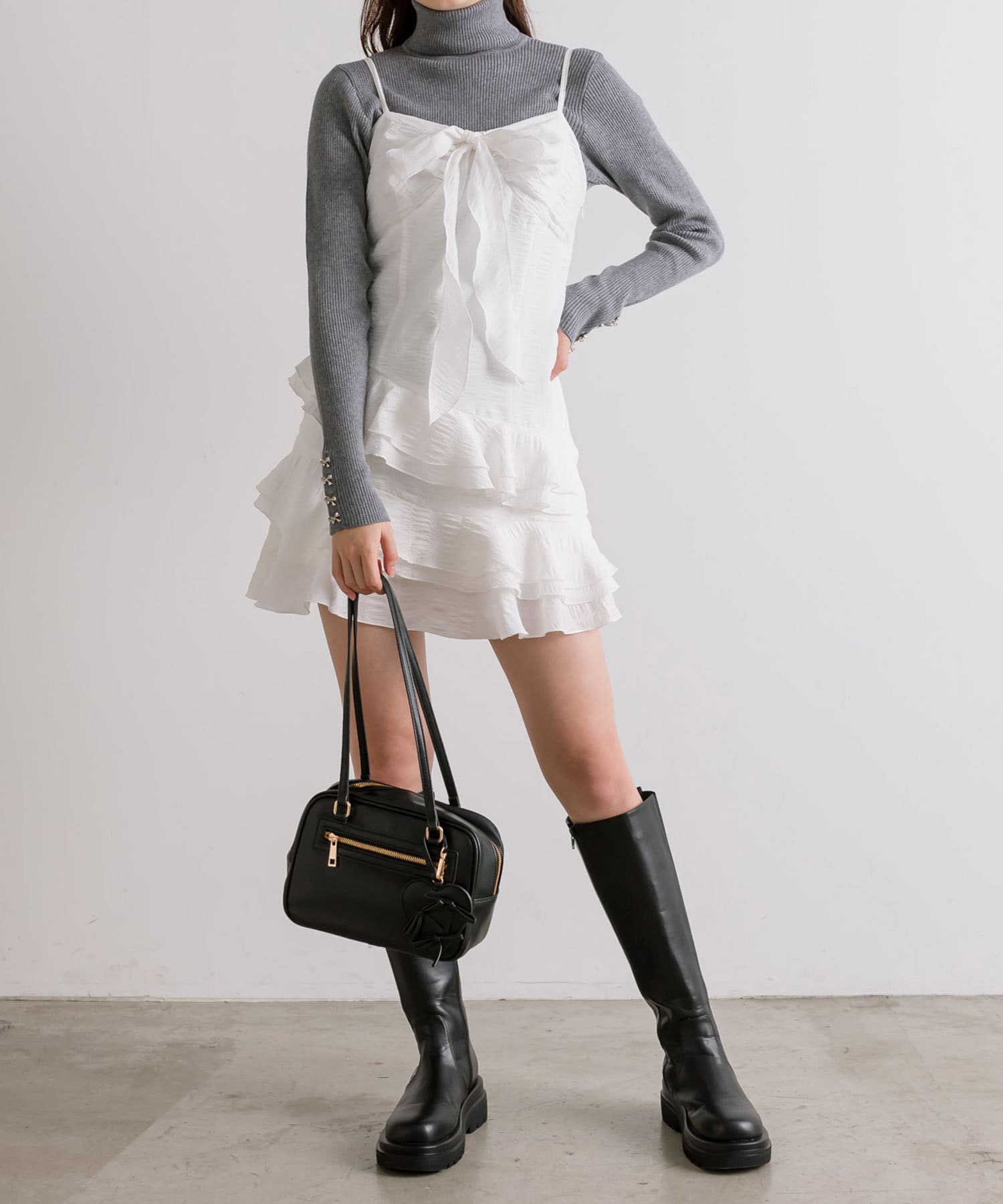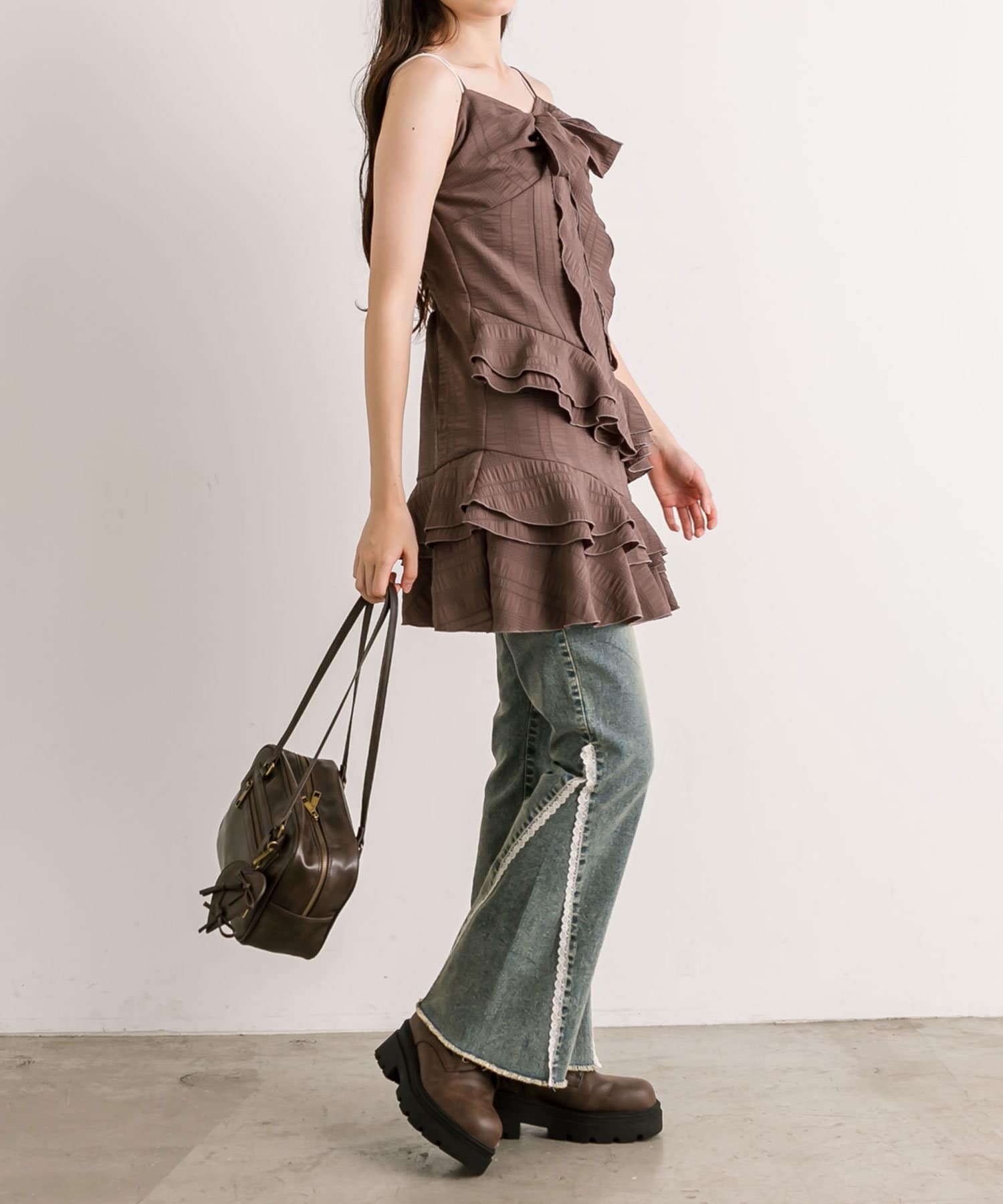 ・胸元のリボンや裾のラッフルなどかわいい要素が詰まったキャミワンピ。