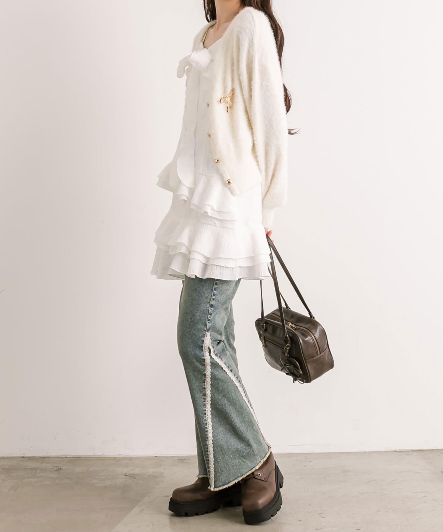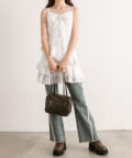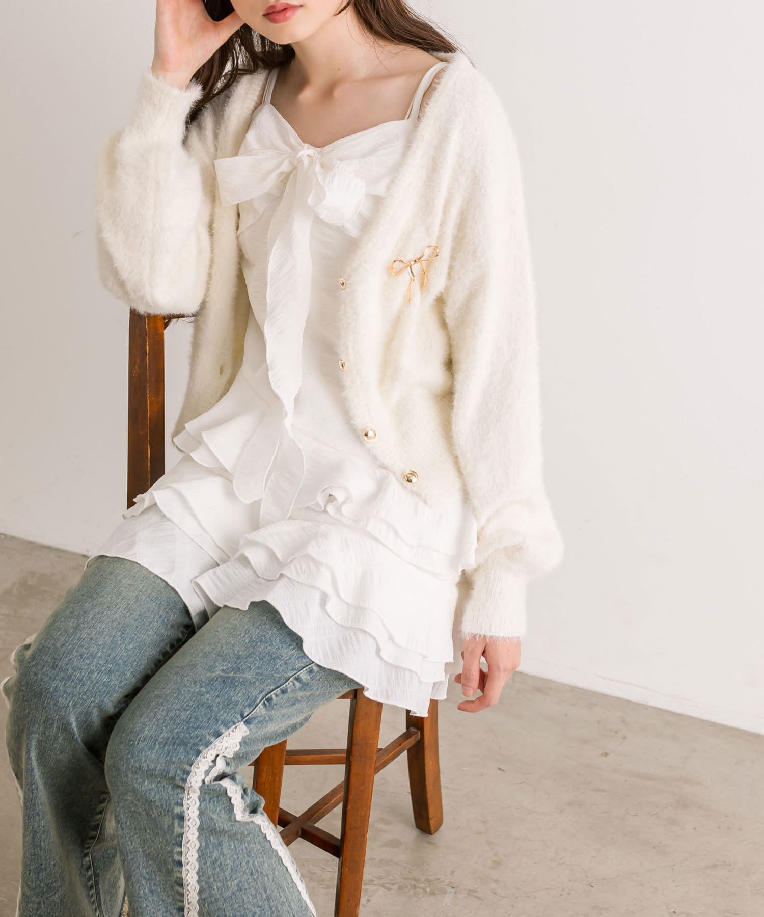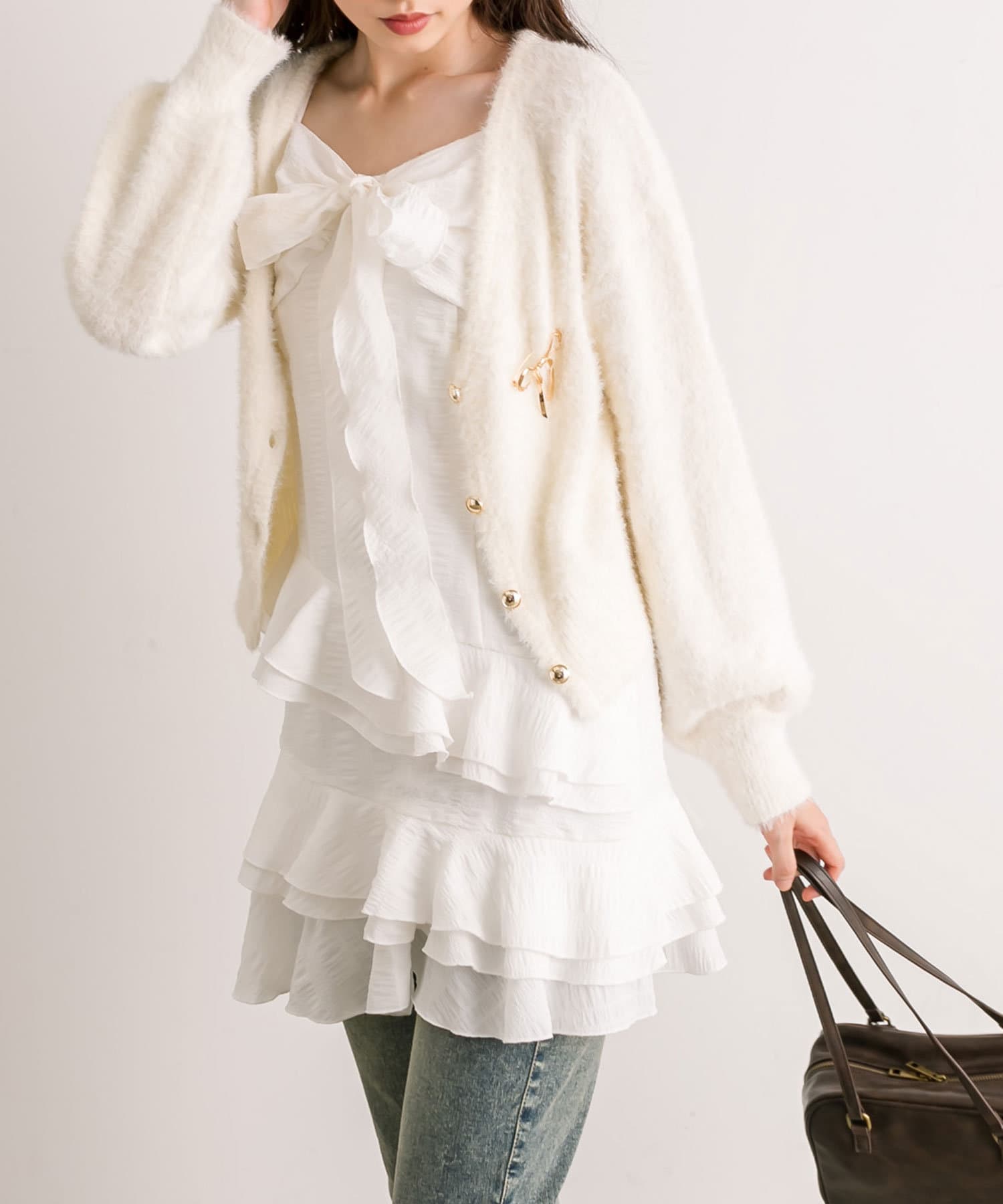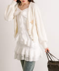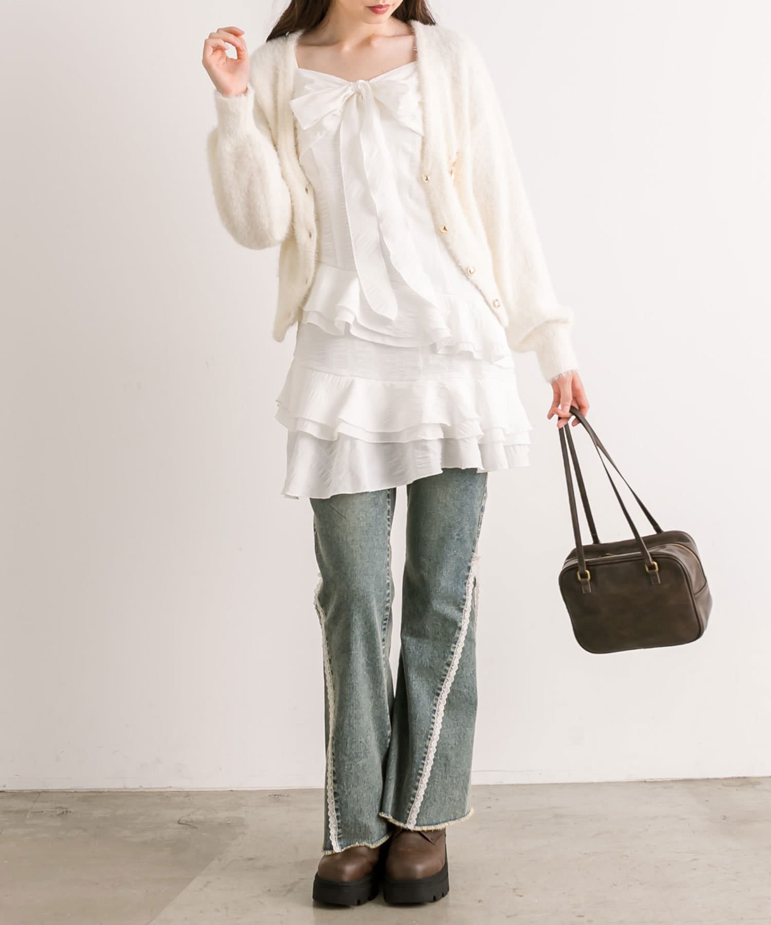 ・胸元のリボンや裾のラッフルなどかわいい要素が詰まったキャミワンピ。