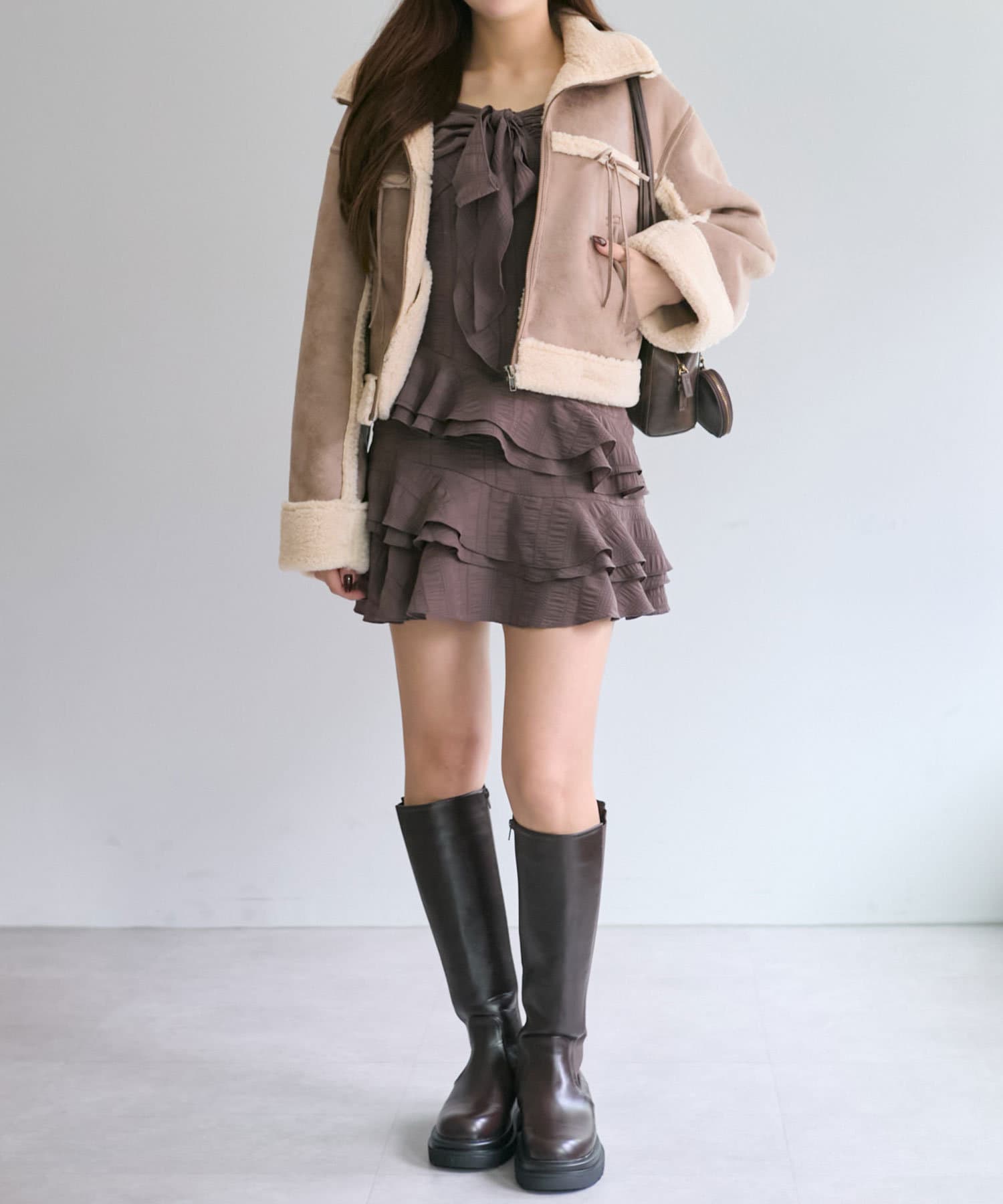 ・足元はハイソックスにブーツを合わせると今っぽい着こなしに◎