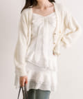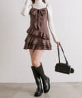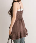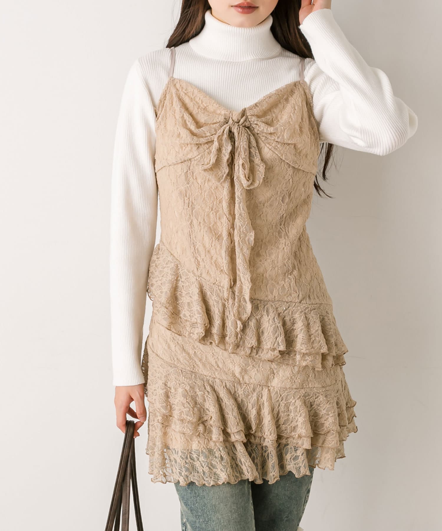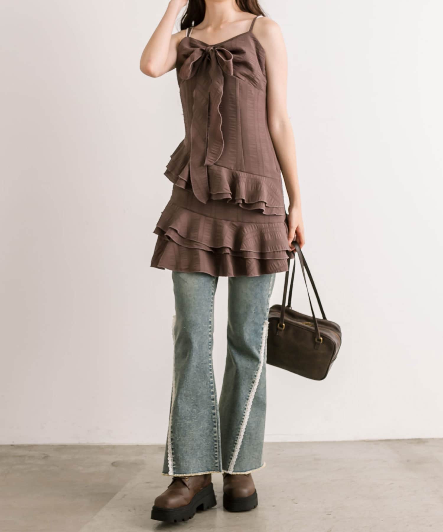 ・胸元のリボンや裾のラッフルなどかわいい要素が詰まったキャミワンピ。