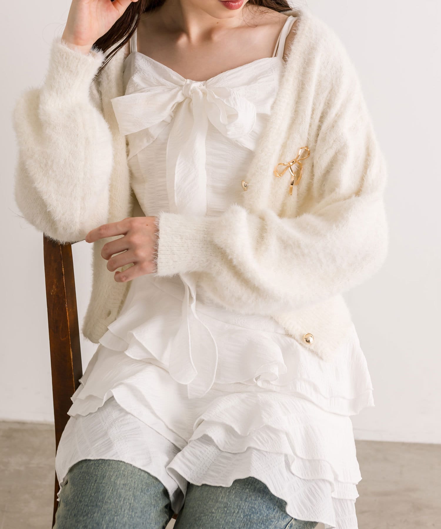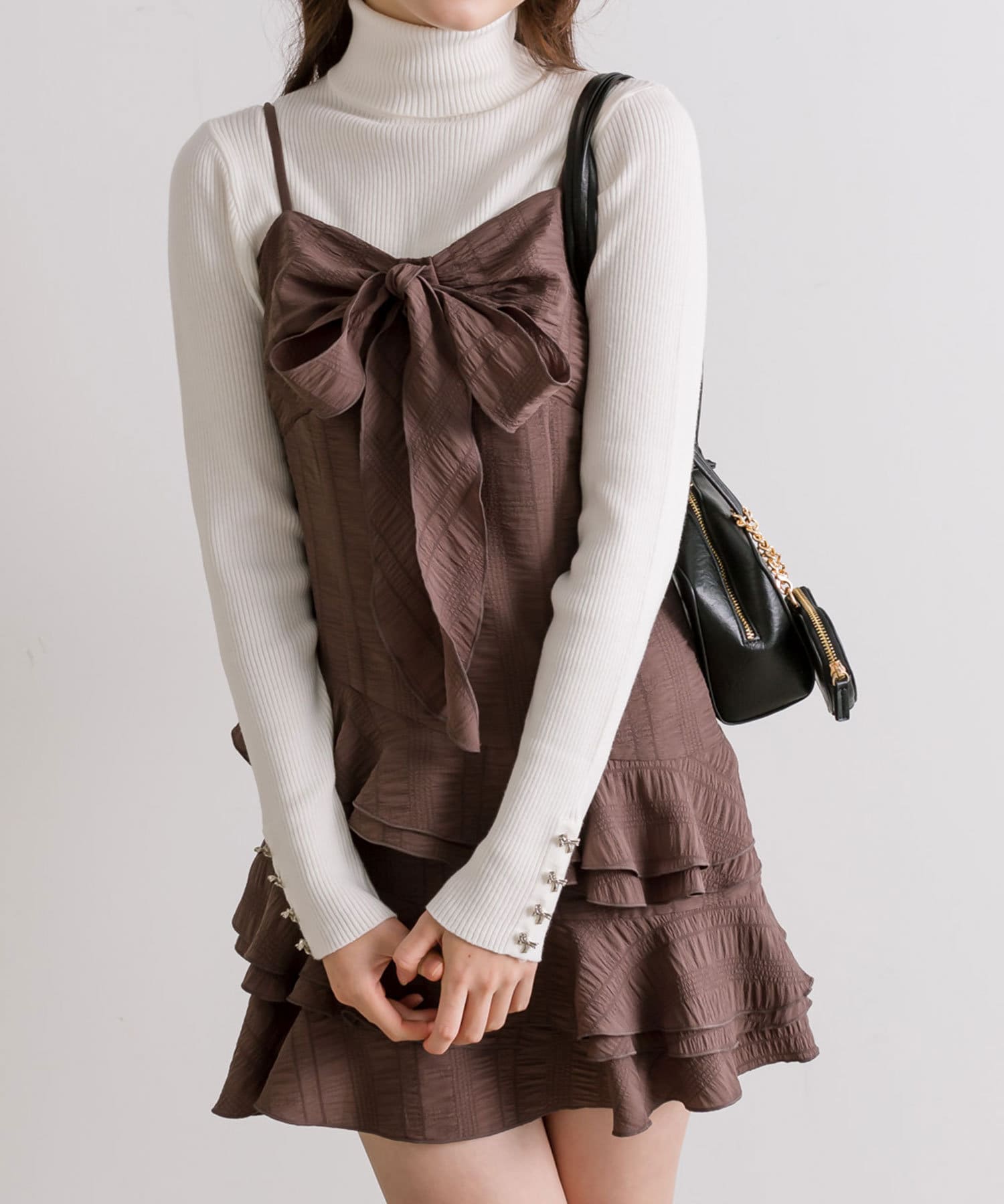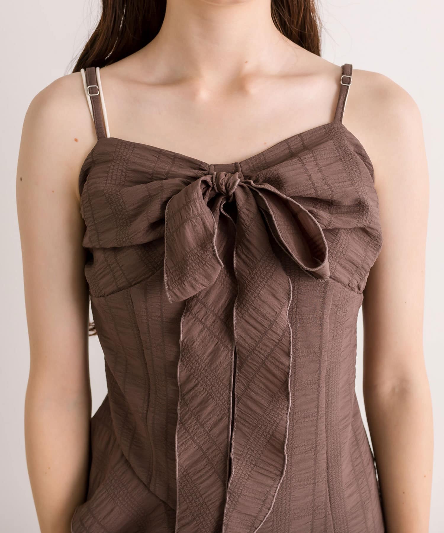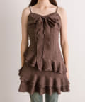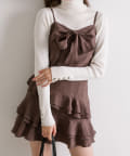 ・胸元のリボンや裾のラッフルなどかわいい要素が詰まったキャミワンピ。
