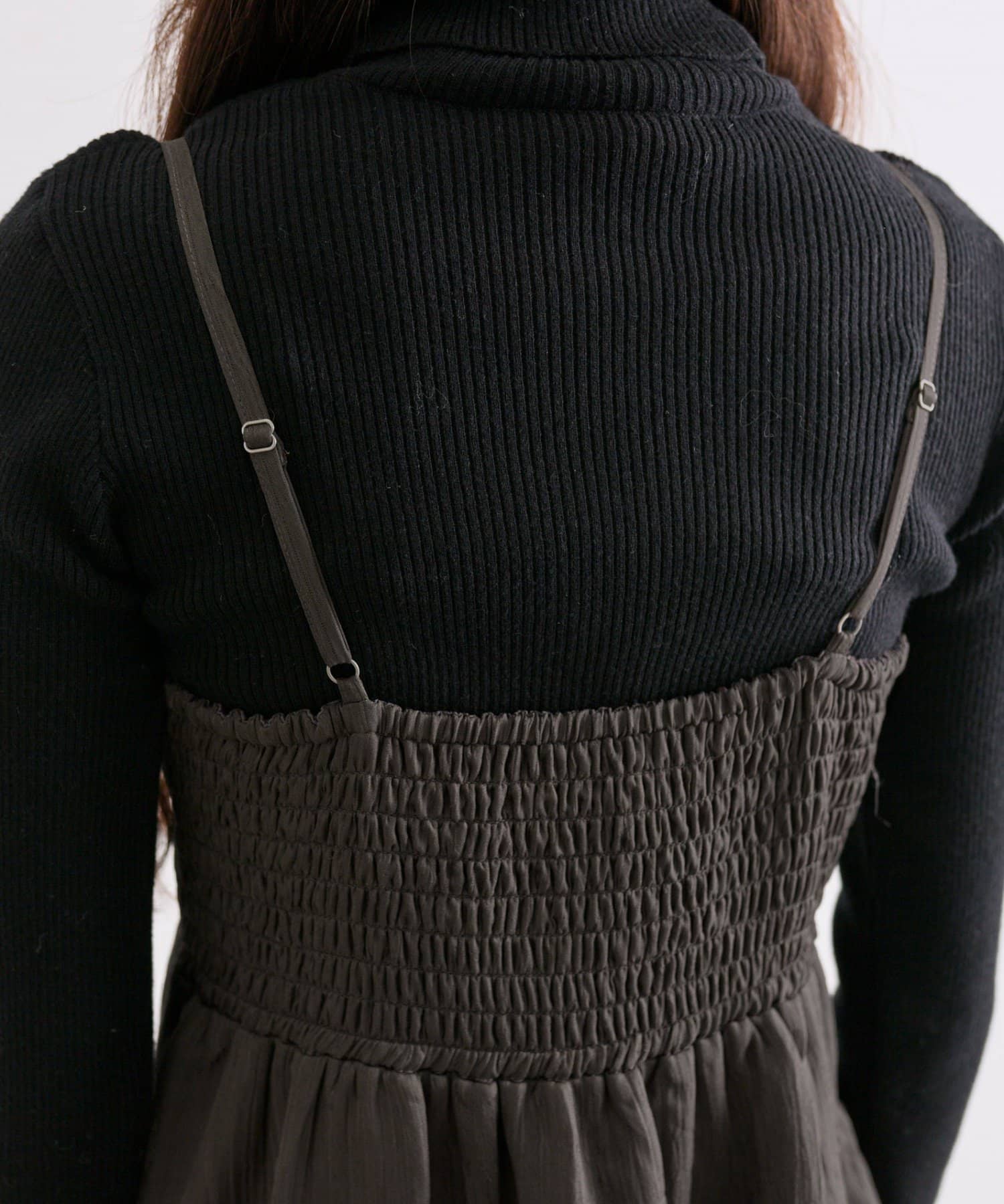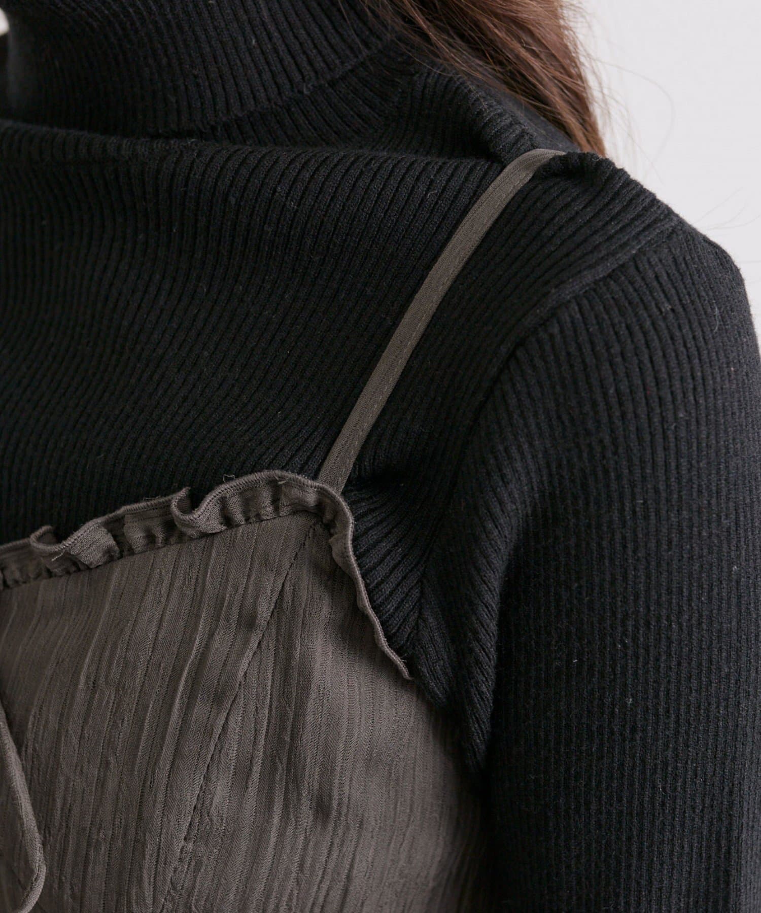 ・上にカーディガンなどを羽織ったり、タートルインナーを合わせるなどレイヤードコーデがおすすめ。