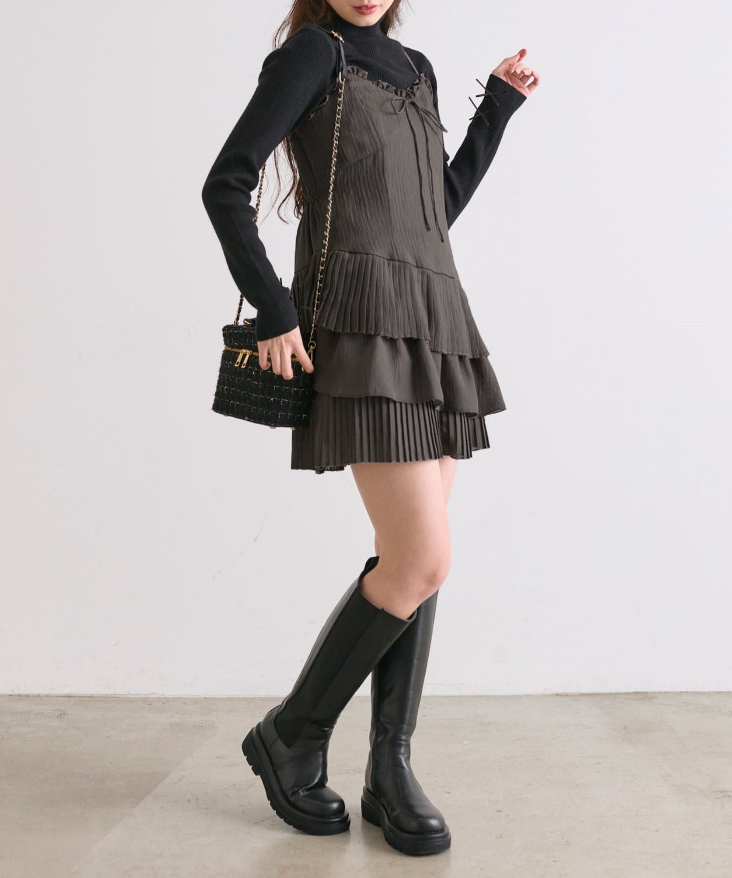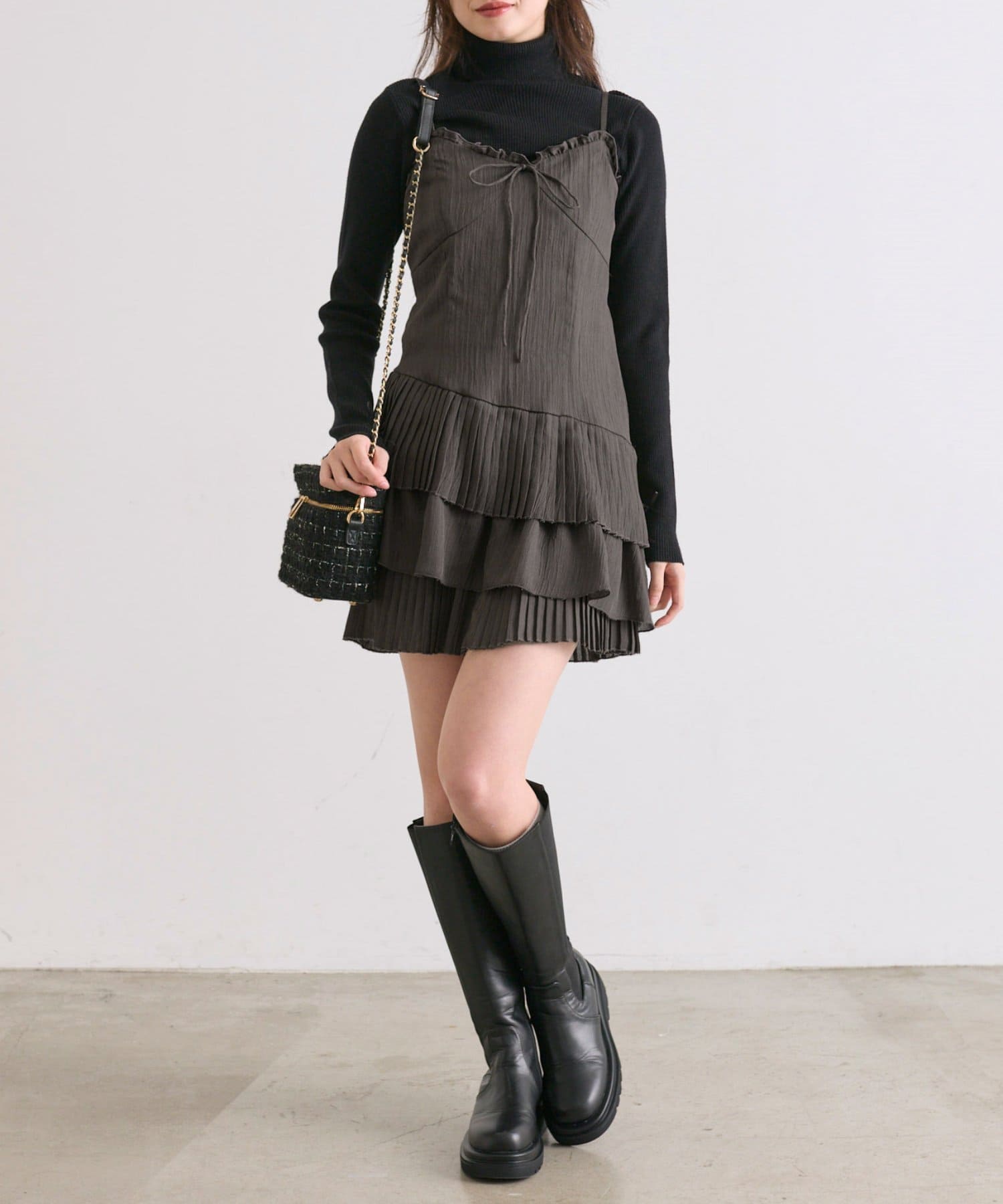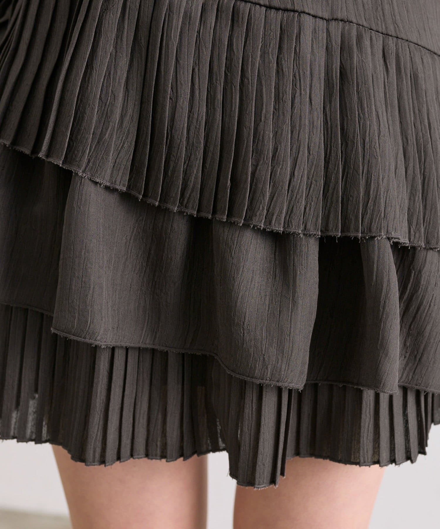 ・ティアード部分には細かいプリーツを施しシンプル過ぎないデザインで、ブラックは真ん中の段につや感のあるシフォン素材を使用し異素材の組み合わせがおしゃれ見えします。