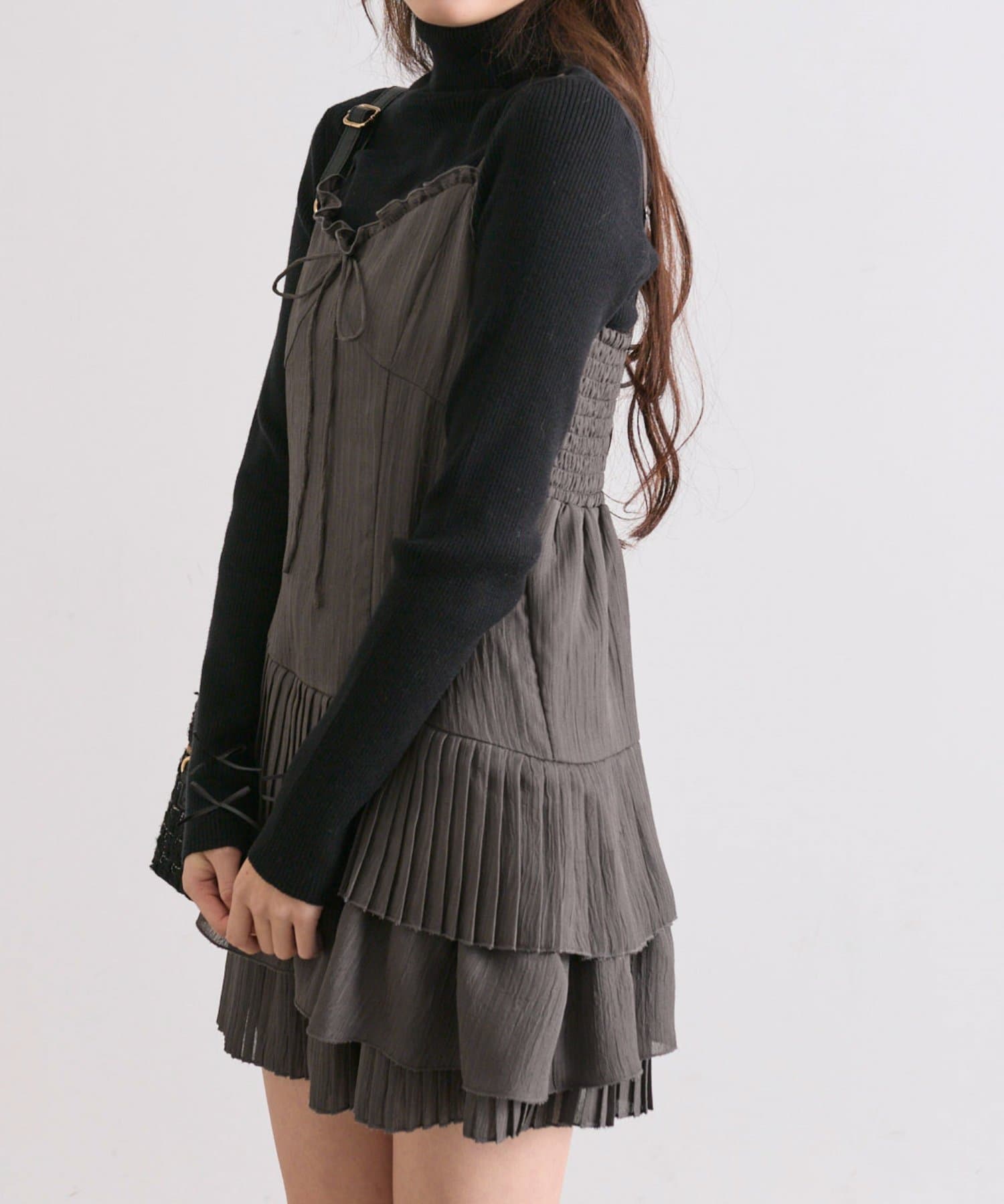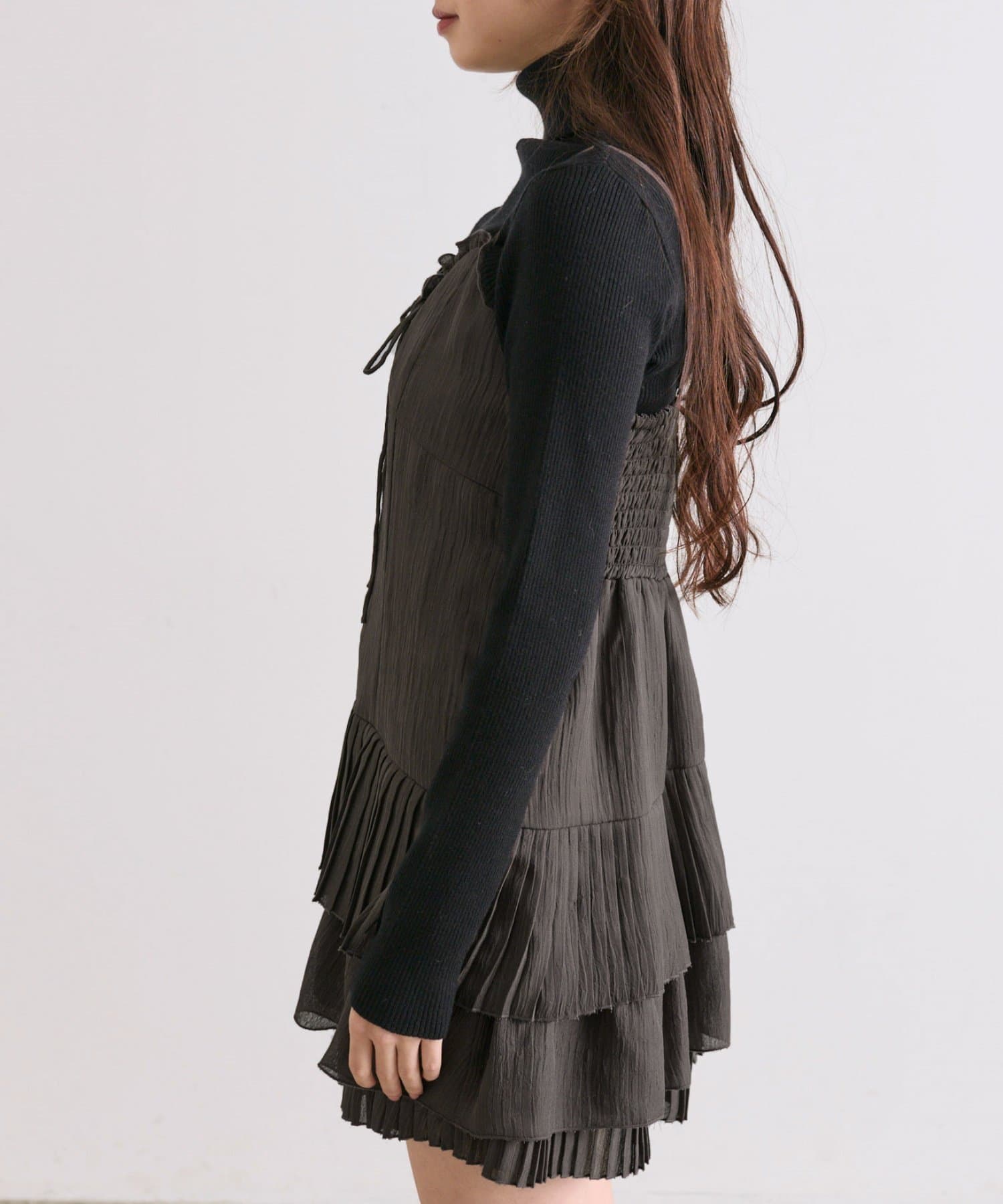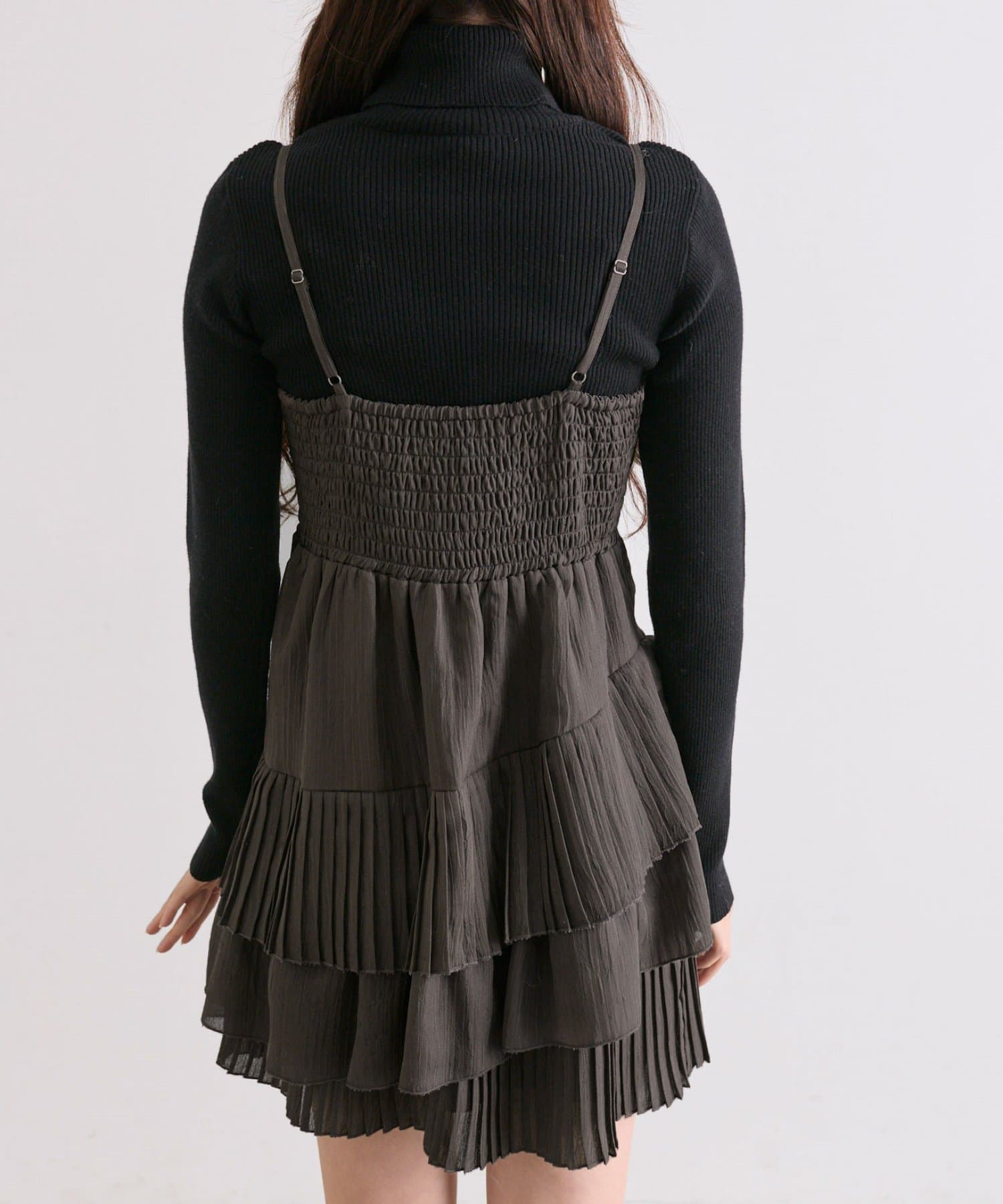 ・ティアード部分には細かいプリーツを施しシンプル過ぎないデザインで、ブラックは真ん中の段につや感のあるシフォン素材を使用し異素材の組み合わせがおしゃれ見えします。