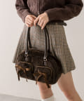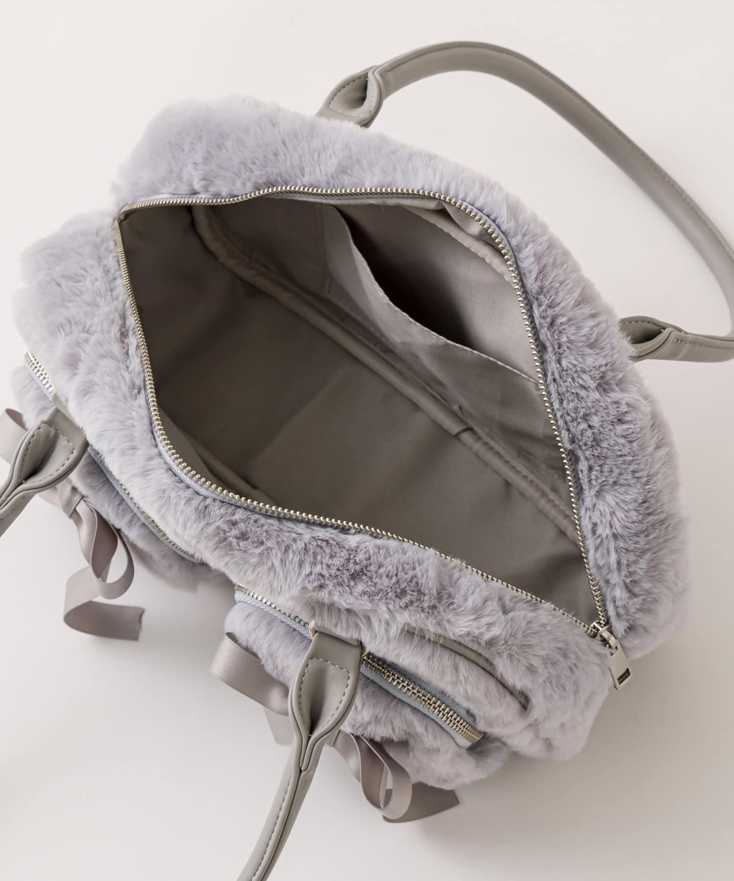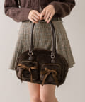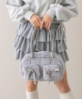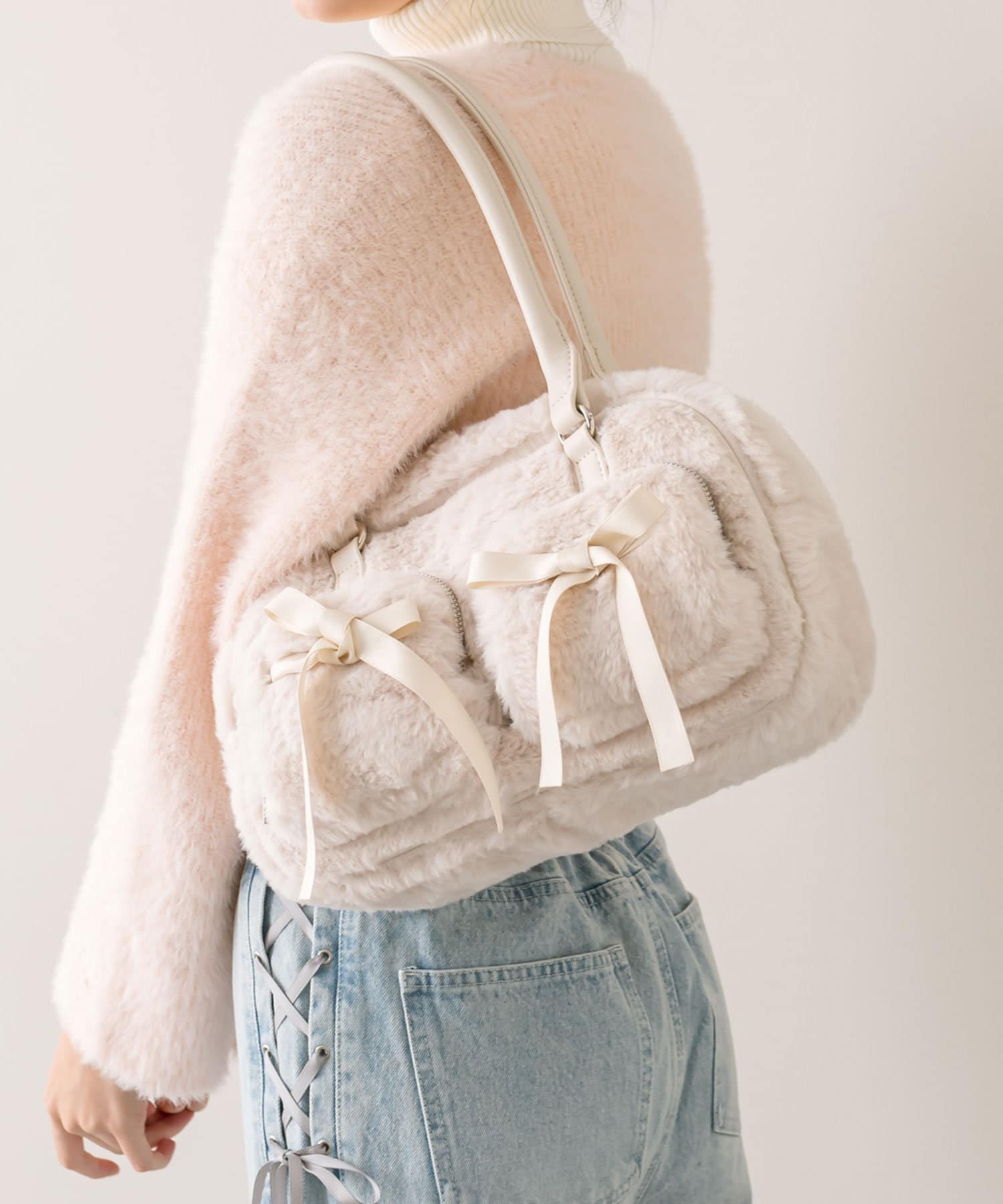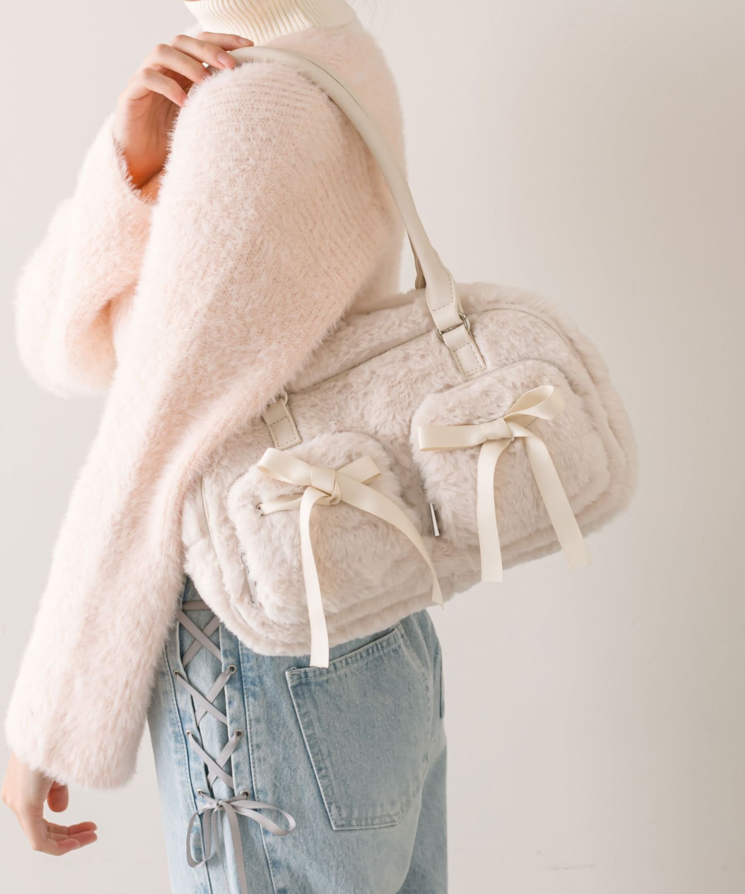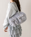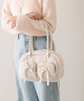 ファーにサテンリボンが映えるボストンバッグ