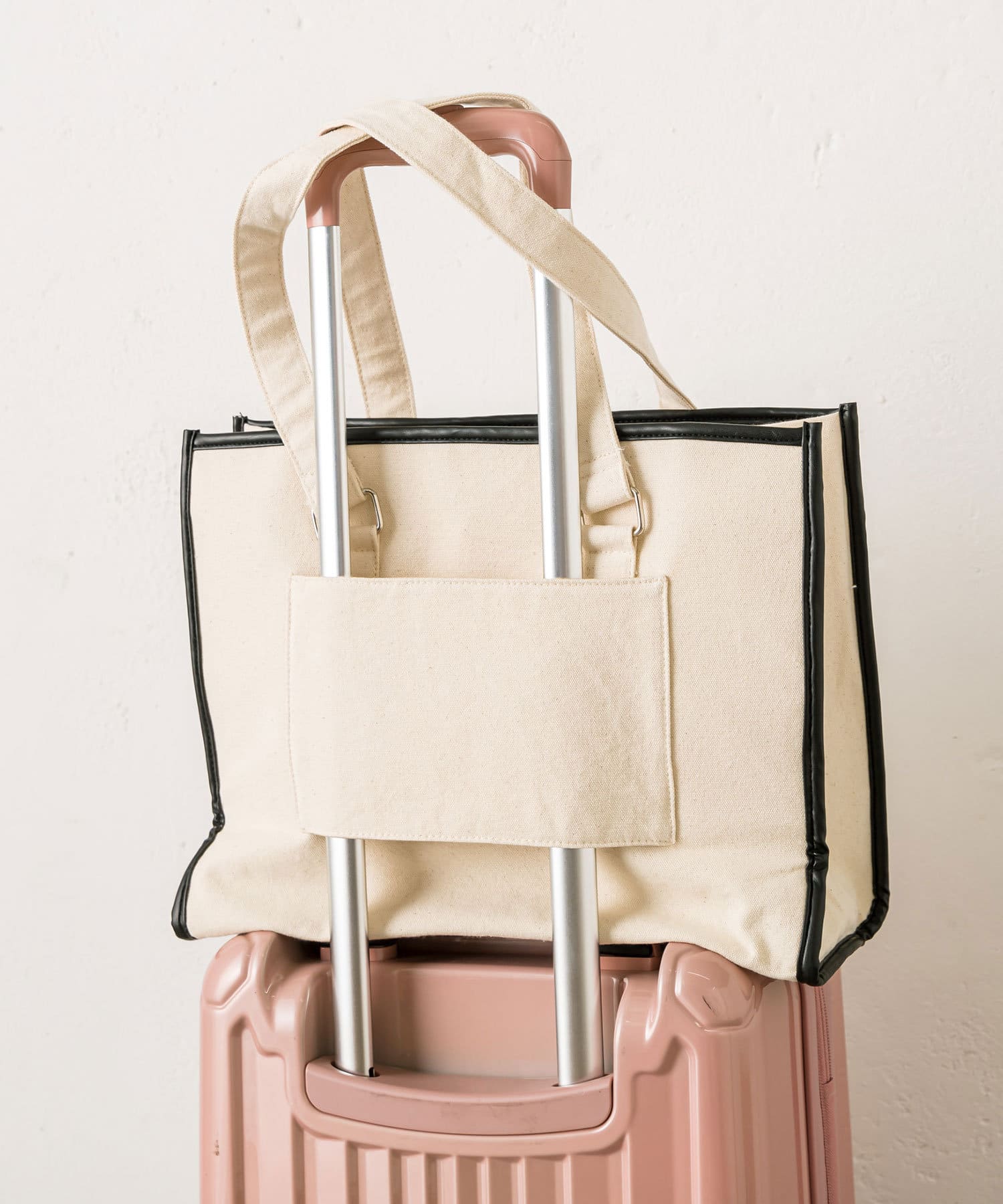 ・背面部分がキャリーのハンドルに通せる仕様になっており、一緒に持ち運べる便利なデザインです。