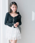・ウエスト部分のドロストとリボンがガーリーなミニスカート。