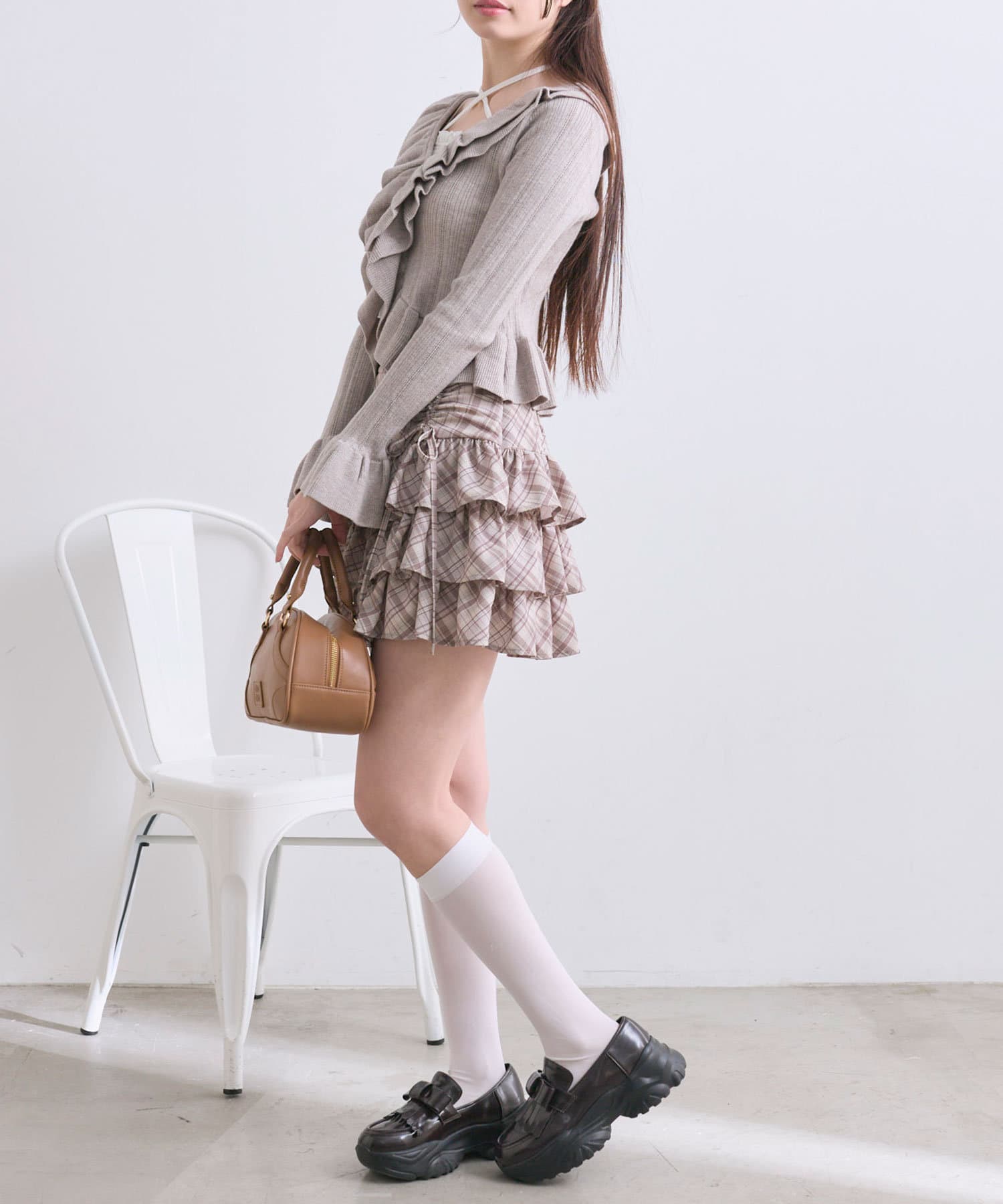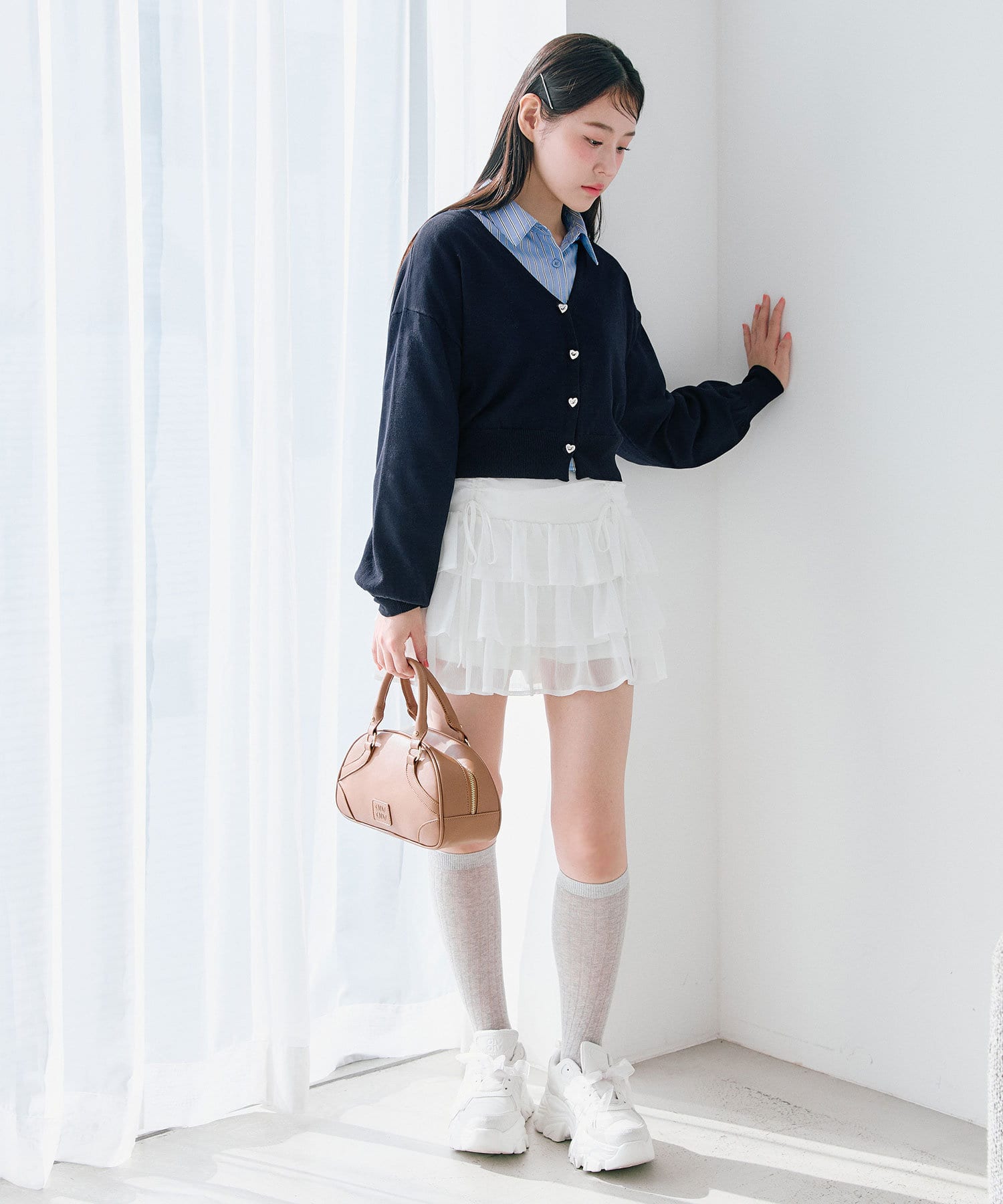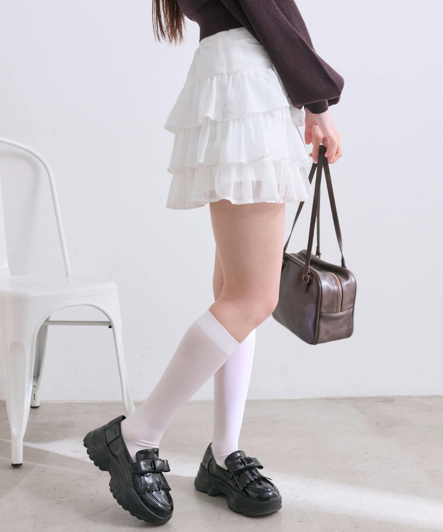 ・足元はハイソックスにブーツやバレエシューズを合わせると韓国っぽい着こなしに。