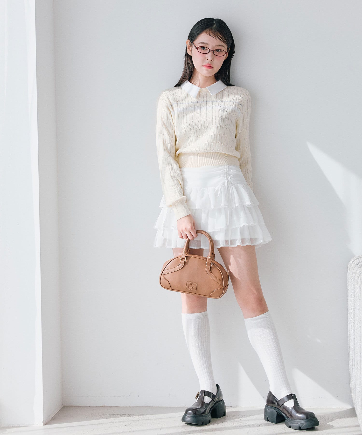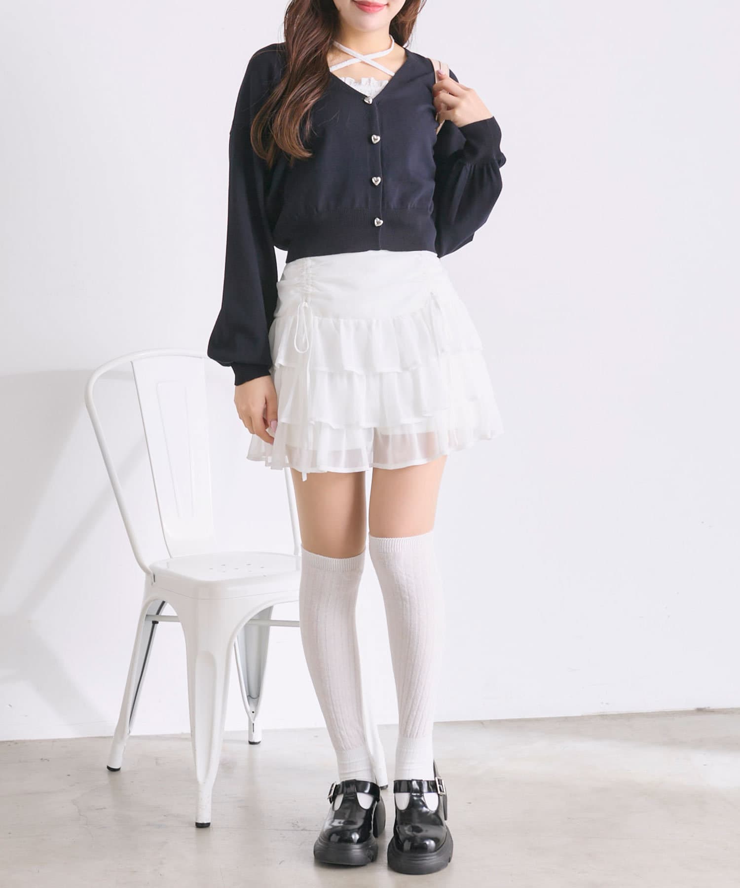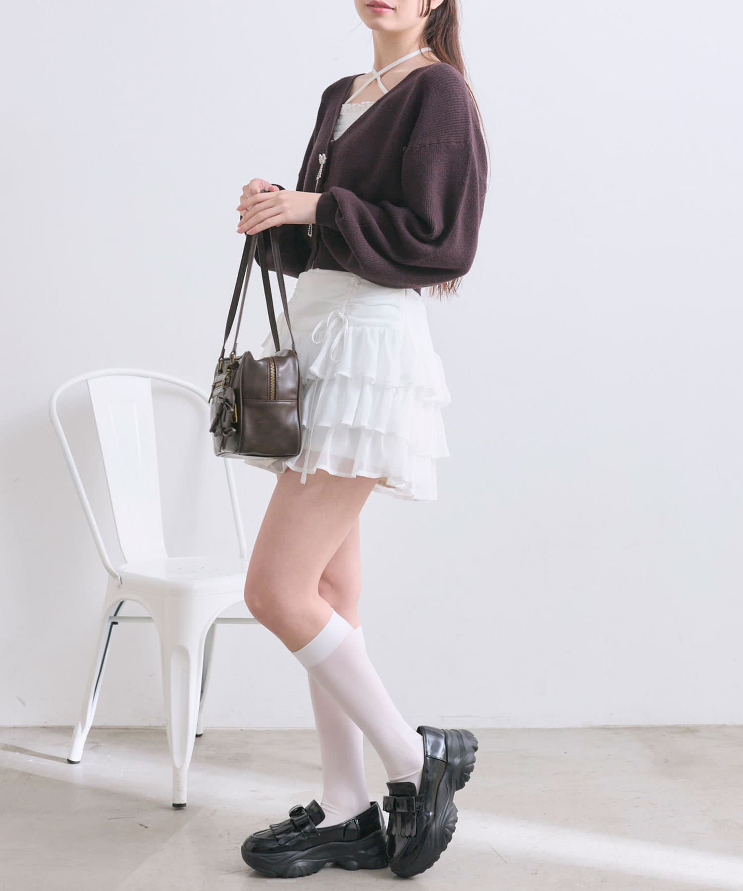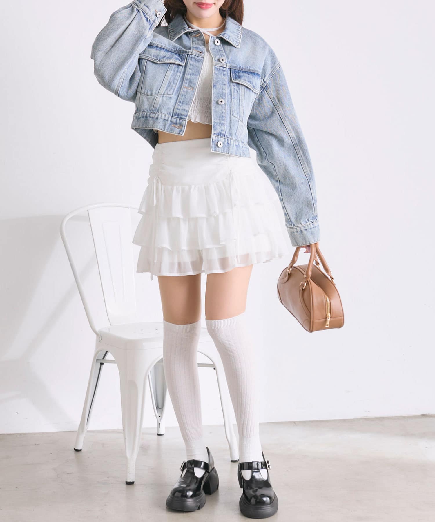 ・足元はハイソックスにブーツやバレエシューズを合わせると韓国っぽい着こなしに。