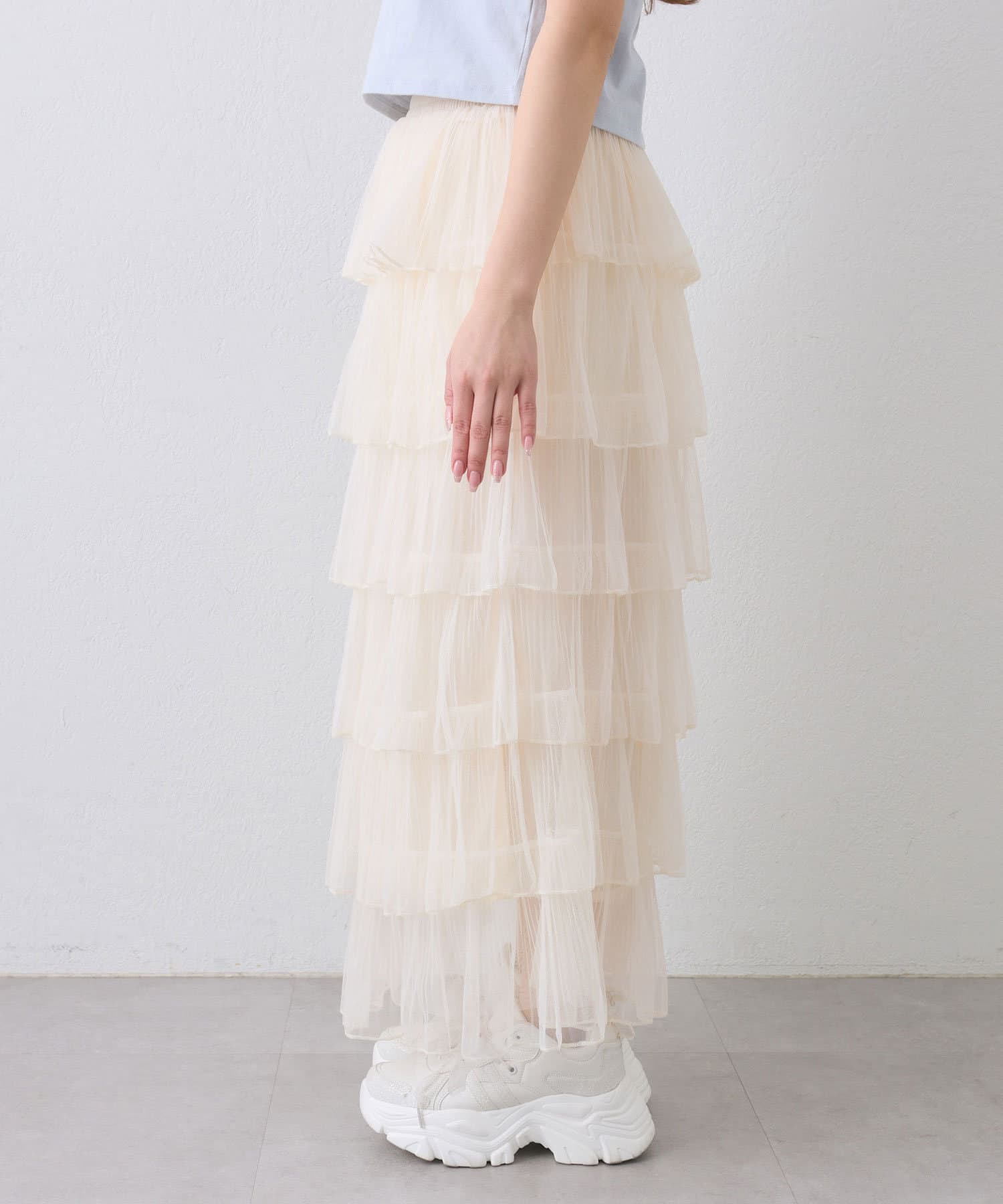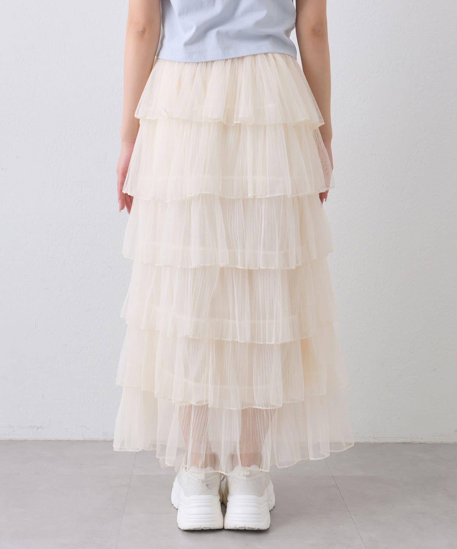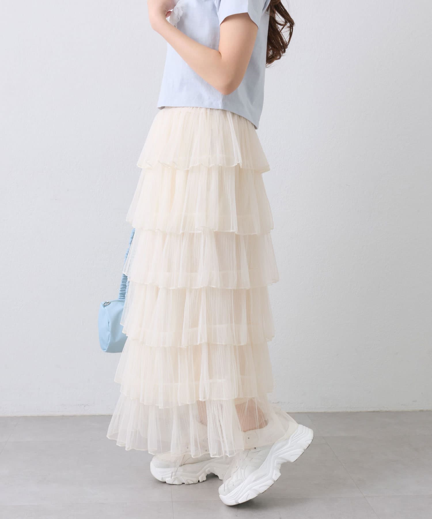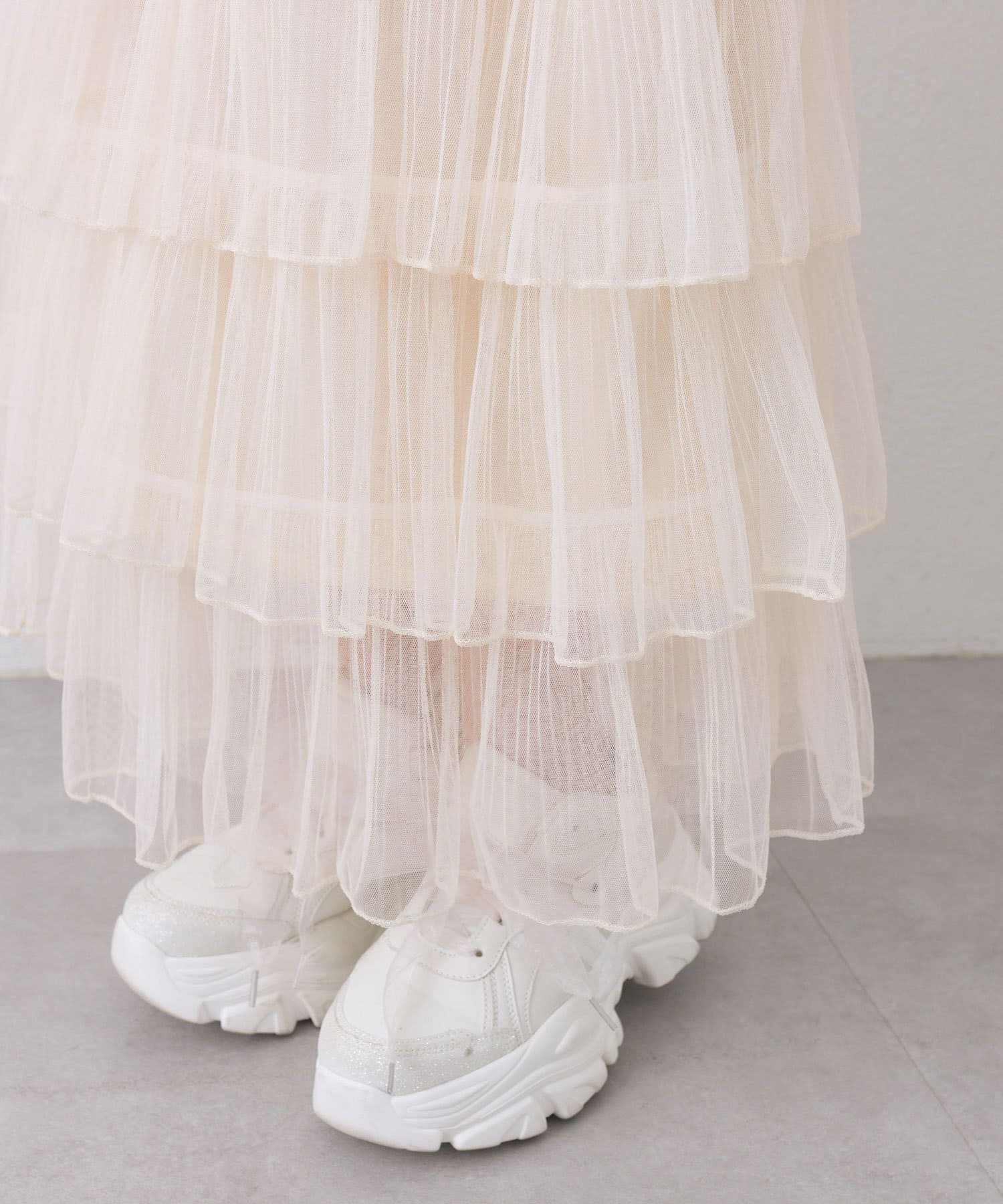 ・トレンドのチュール素材を使用しており、ティアードが何段にもあることで膨らみすぎない程よいボリューム感になってます。