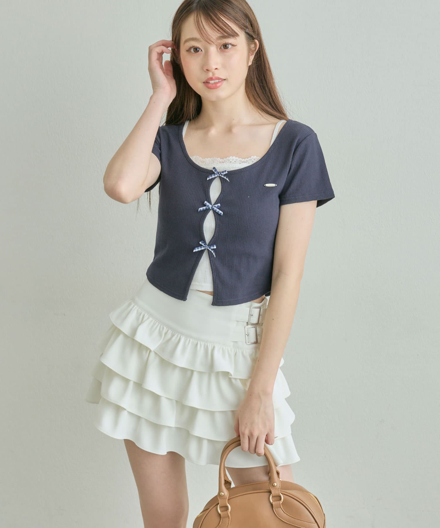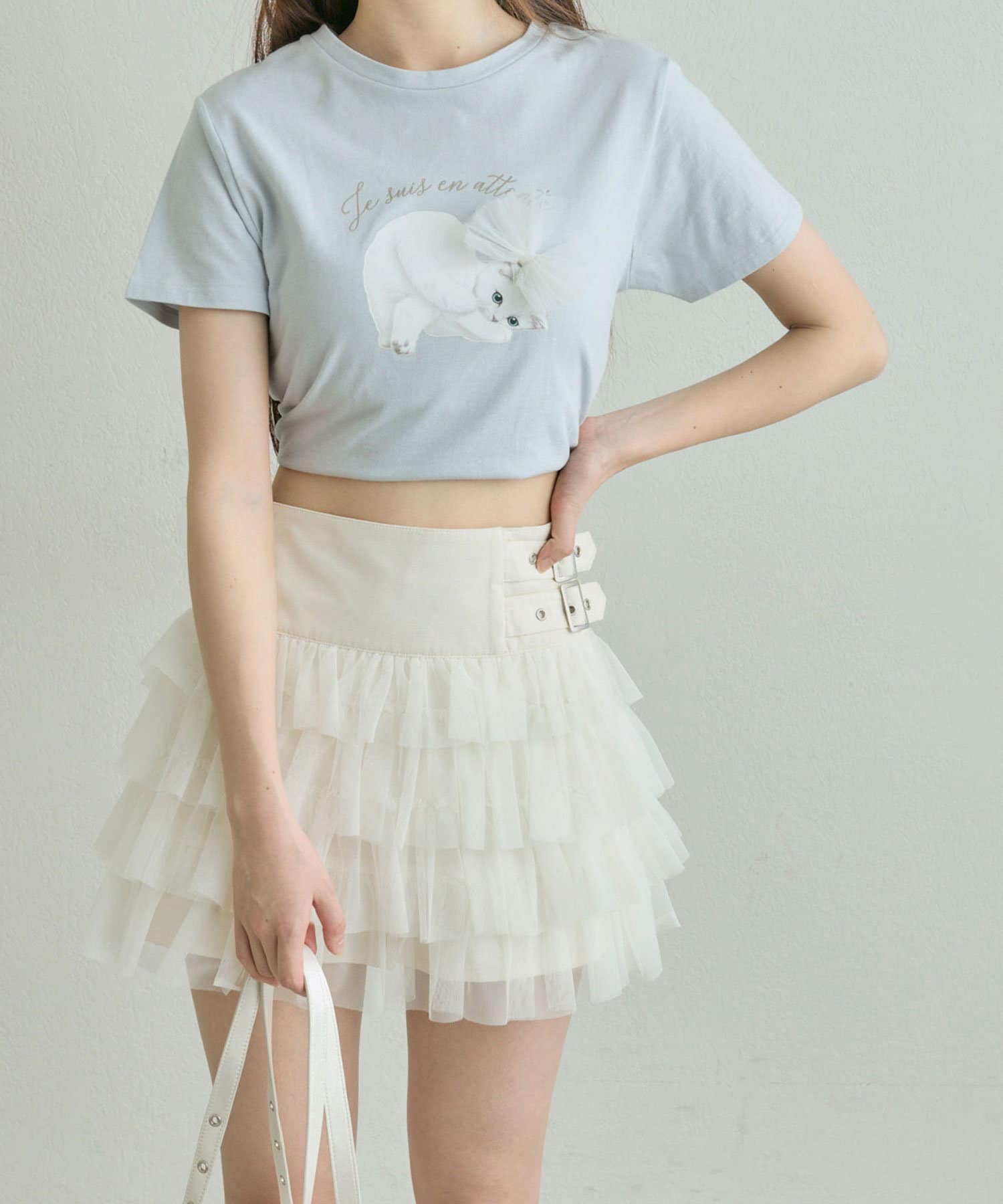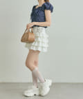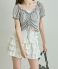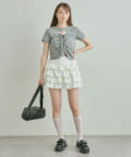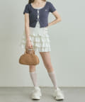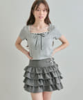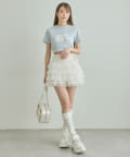 ・コンパクトなトップスを合わせて、スカートのボリューム感を活かした王道フェミニンコーデに。