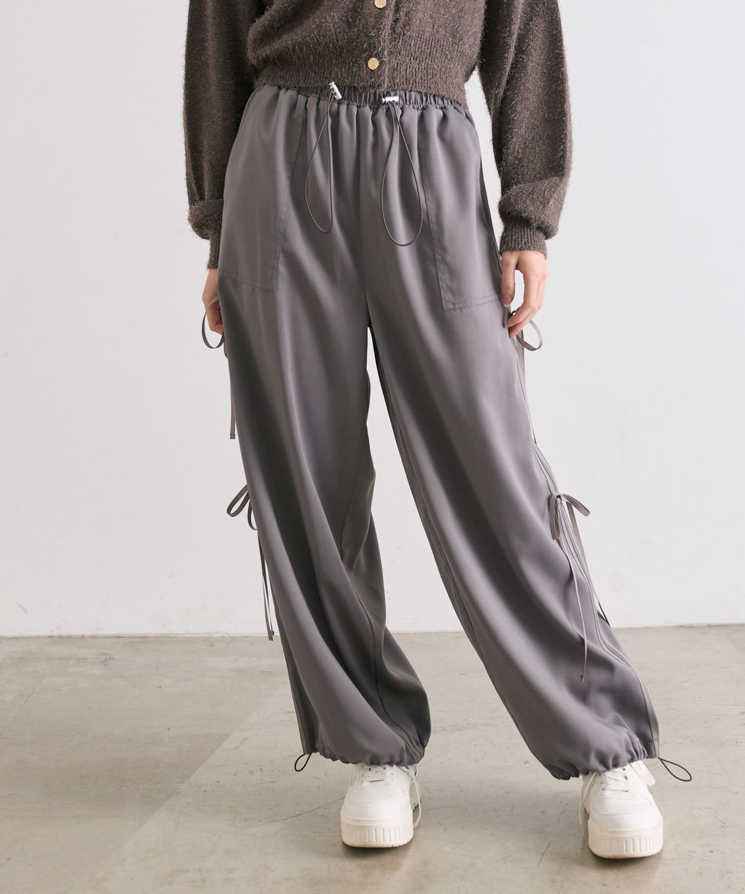 ・ウエストと裾はドロストゴムで絞り具合を調節できるので、お好みのシルエットに変えて着用していただけます。