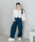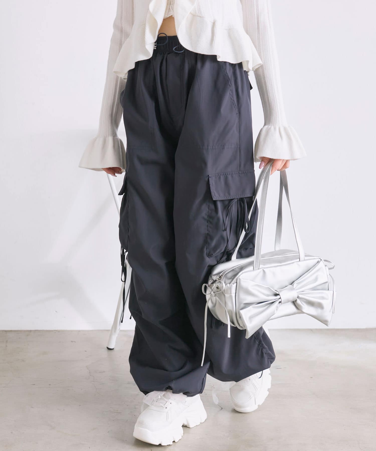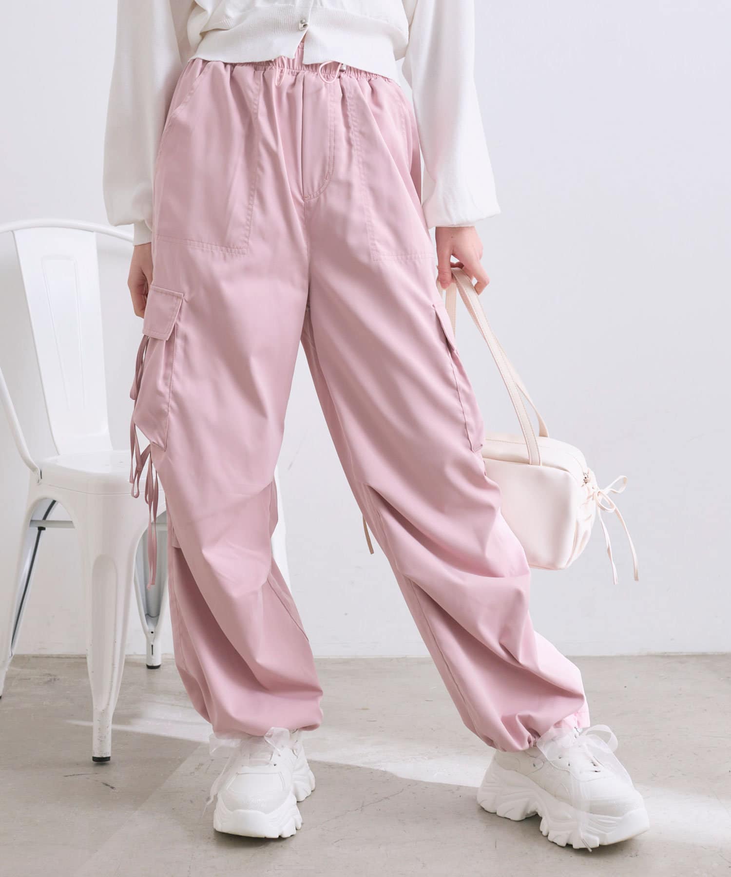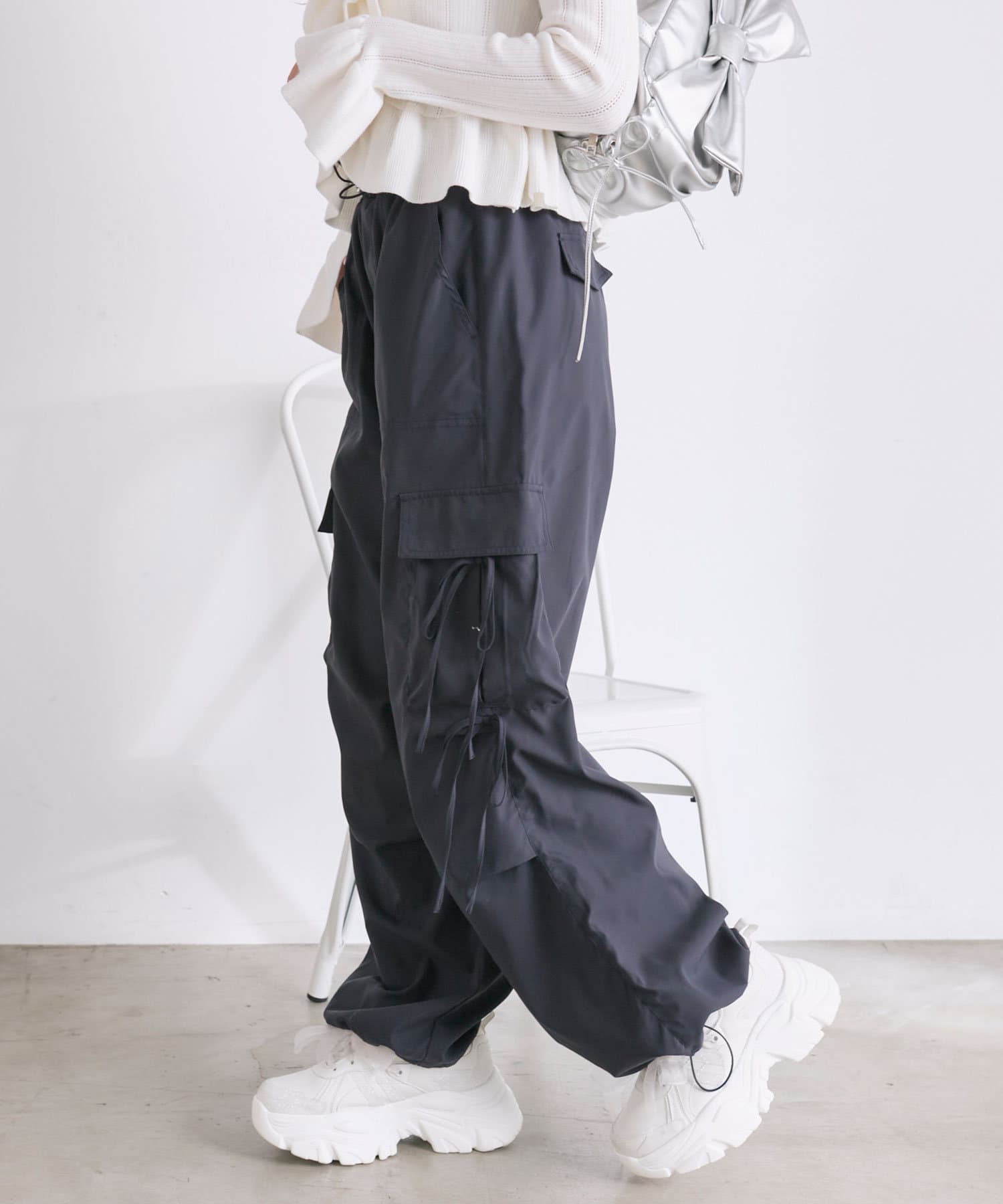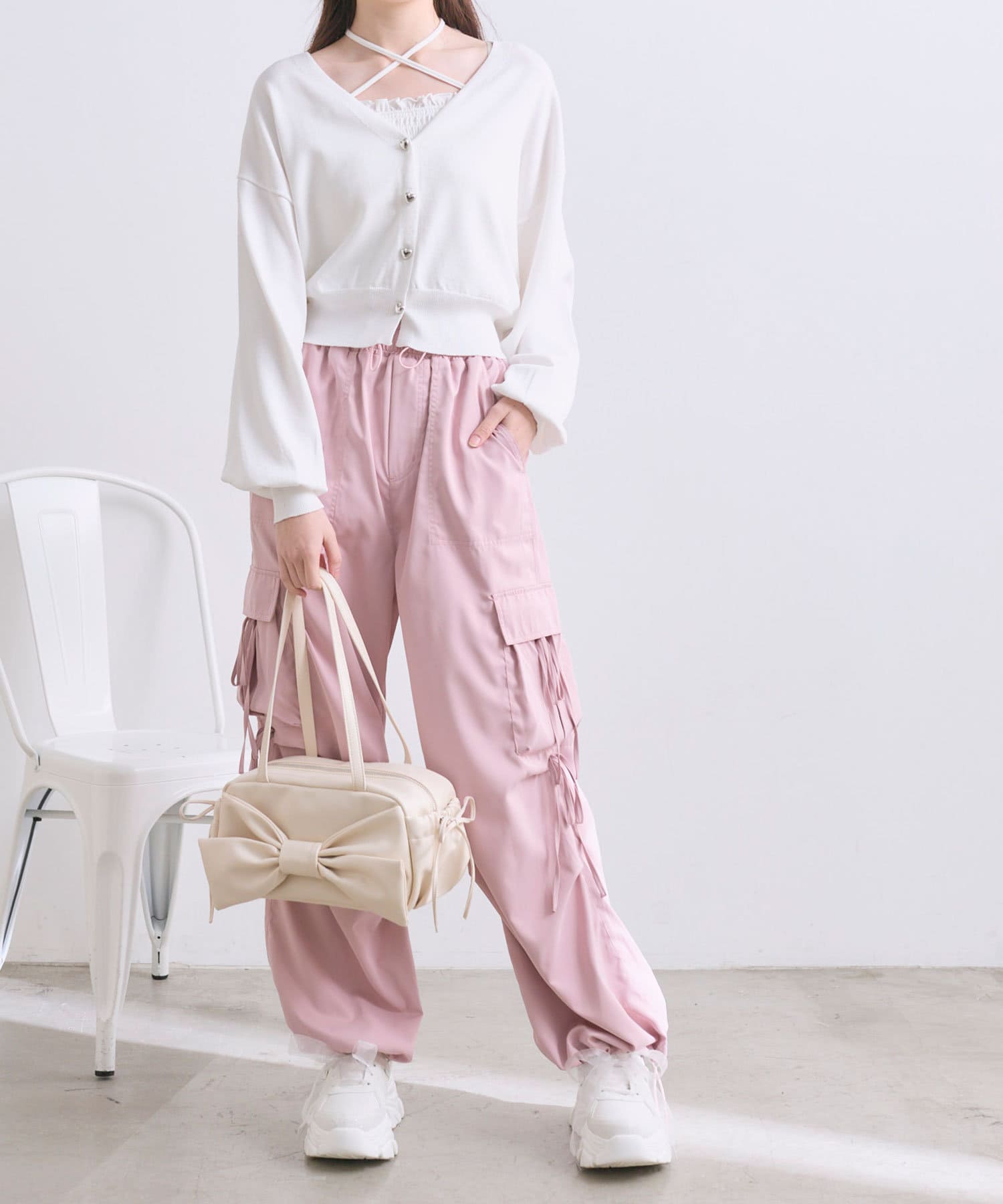 リボンたっぷりでガーリーに着こなせるカーゴパンツ