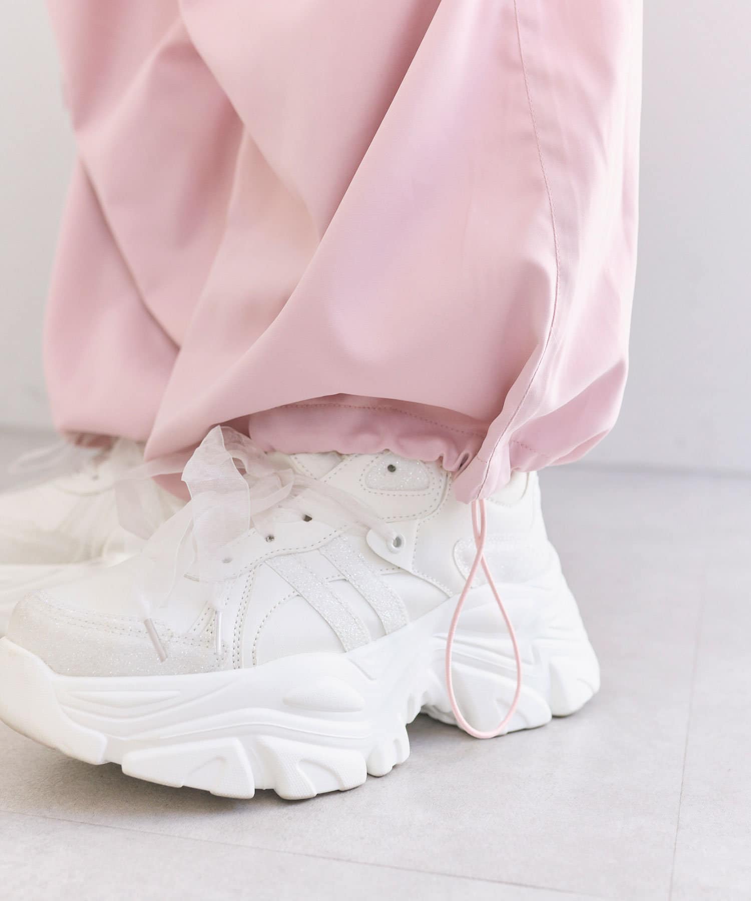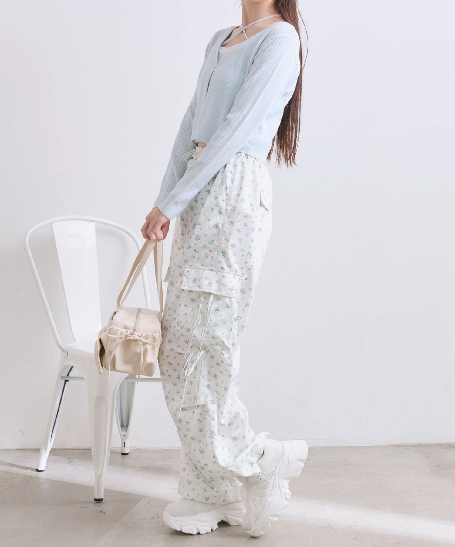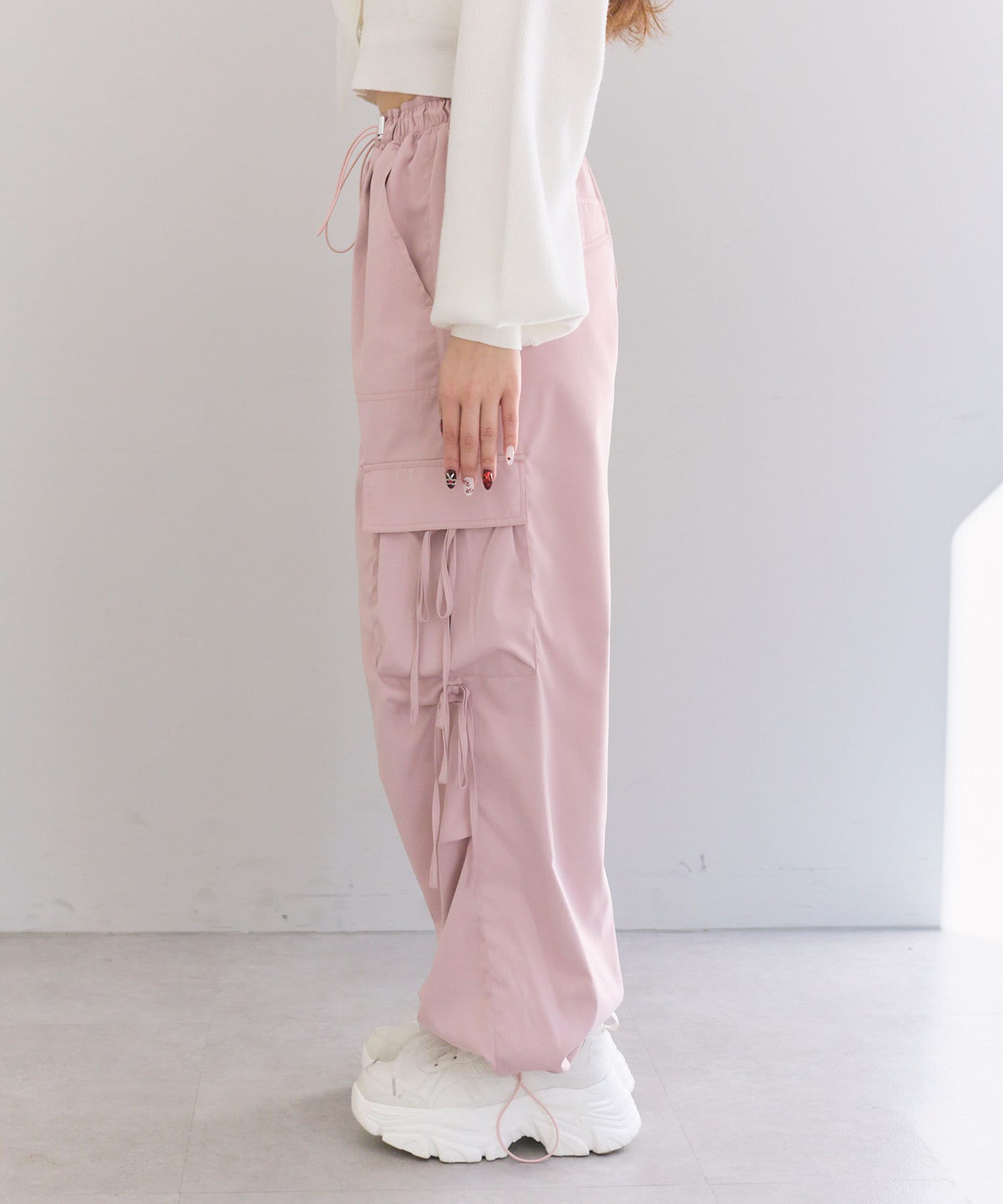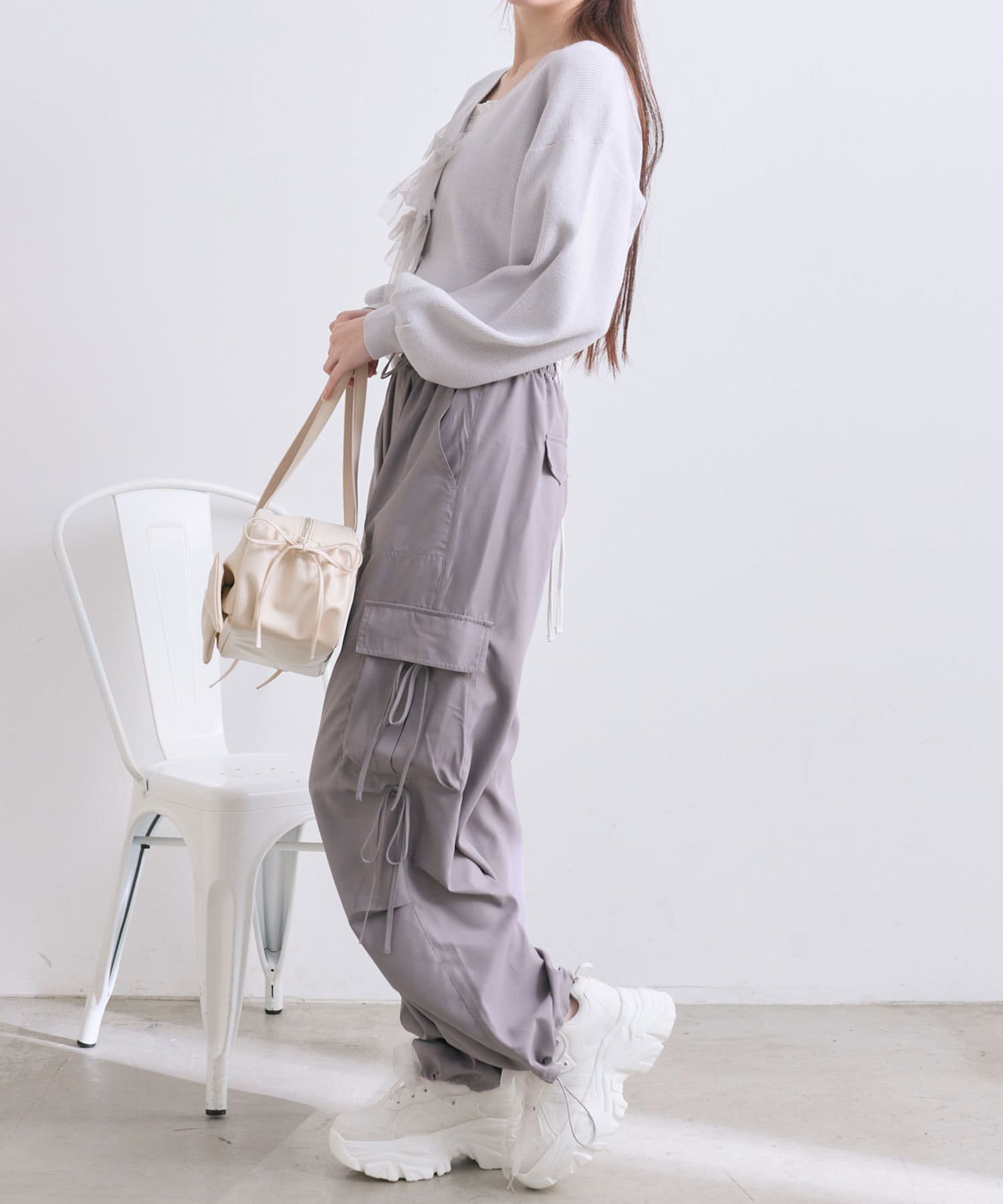 リボンたっぷりでガーリーに着こなせるカーゴパンツ