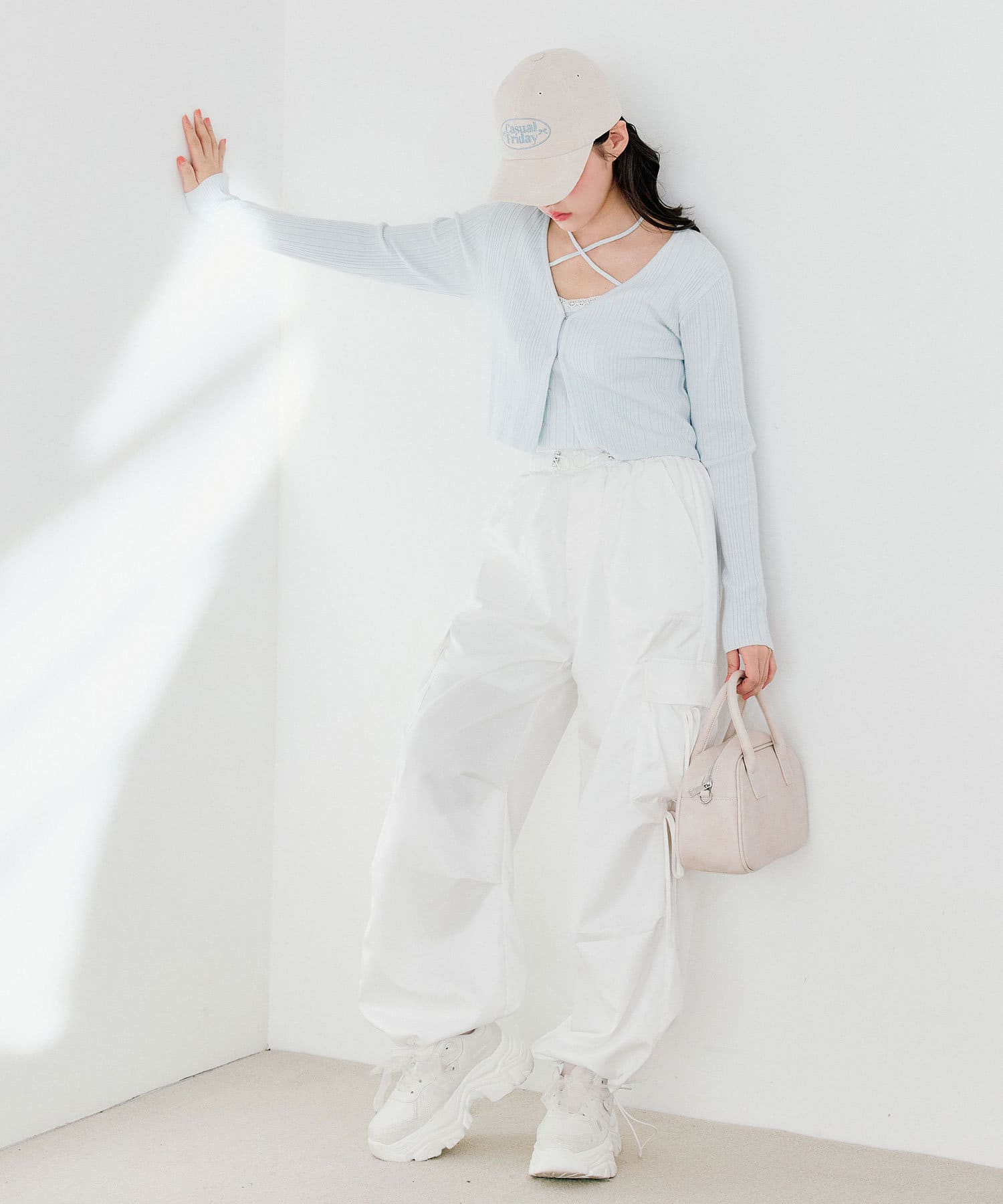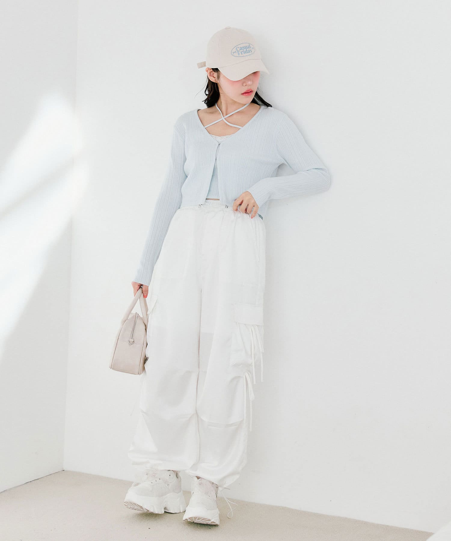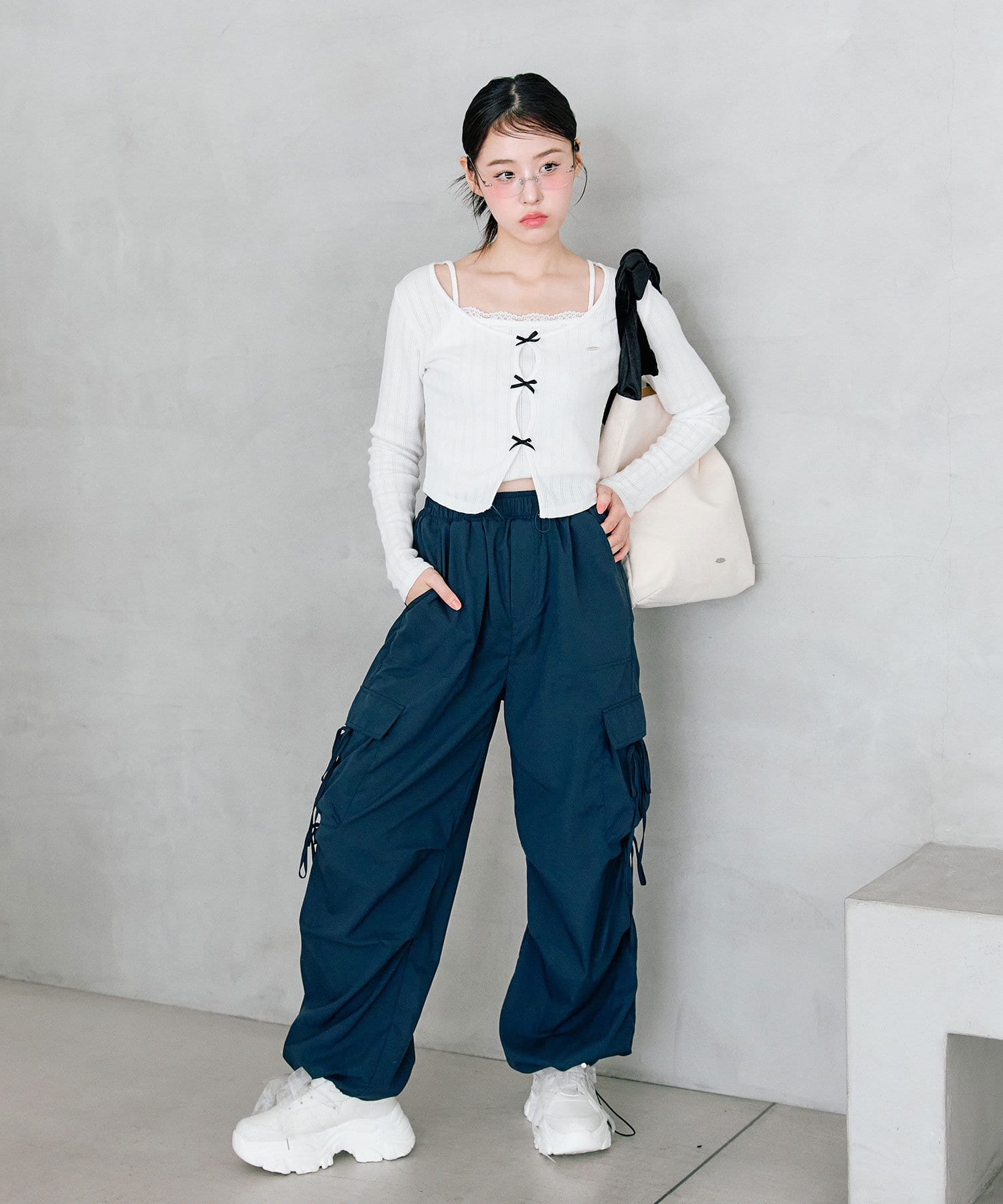 ・カジュアルな印象になりがちなカーゴパンツですが、リボンで可愛らしくコーディネートできます。