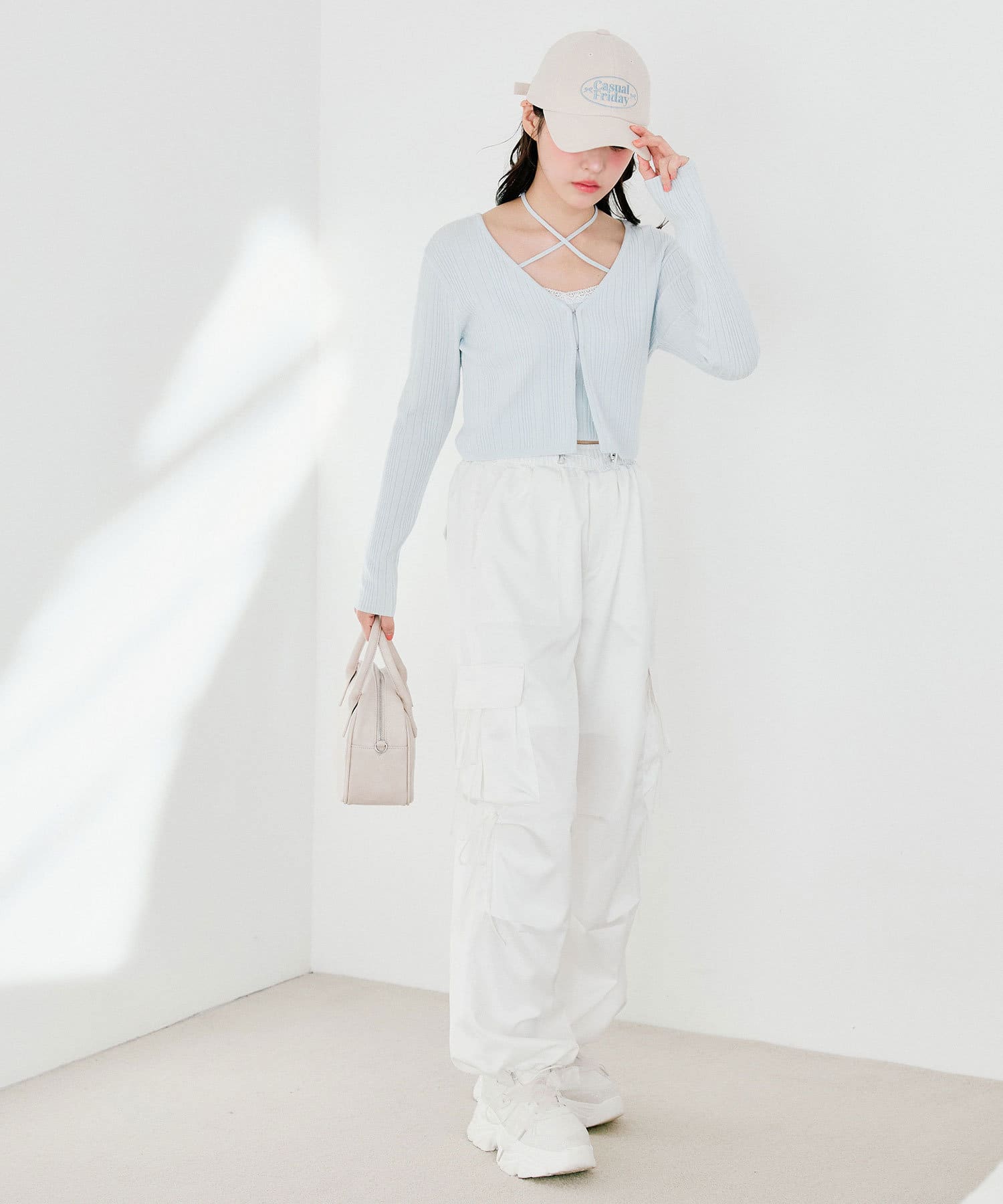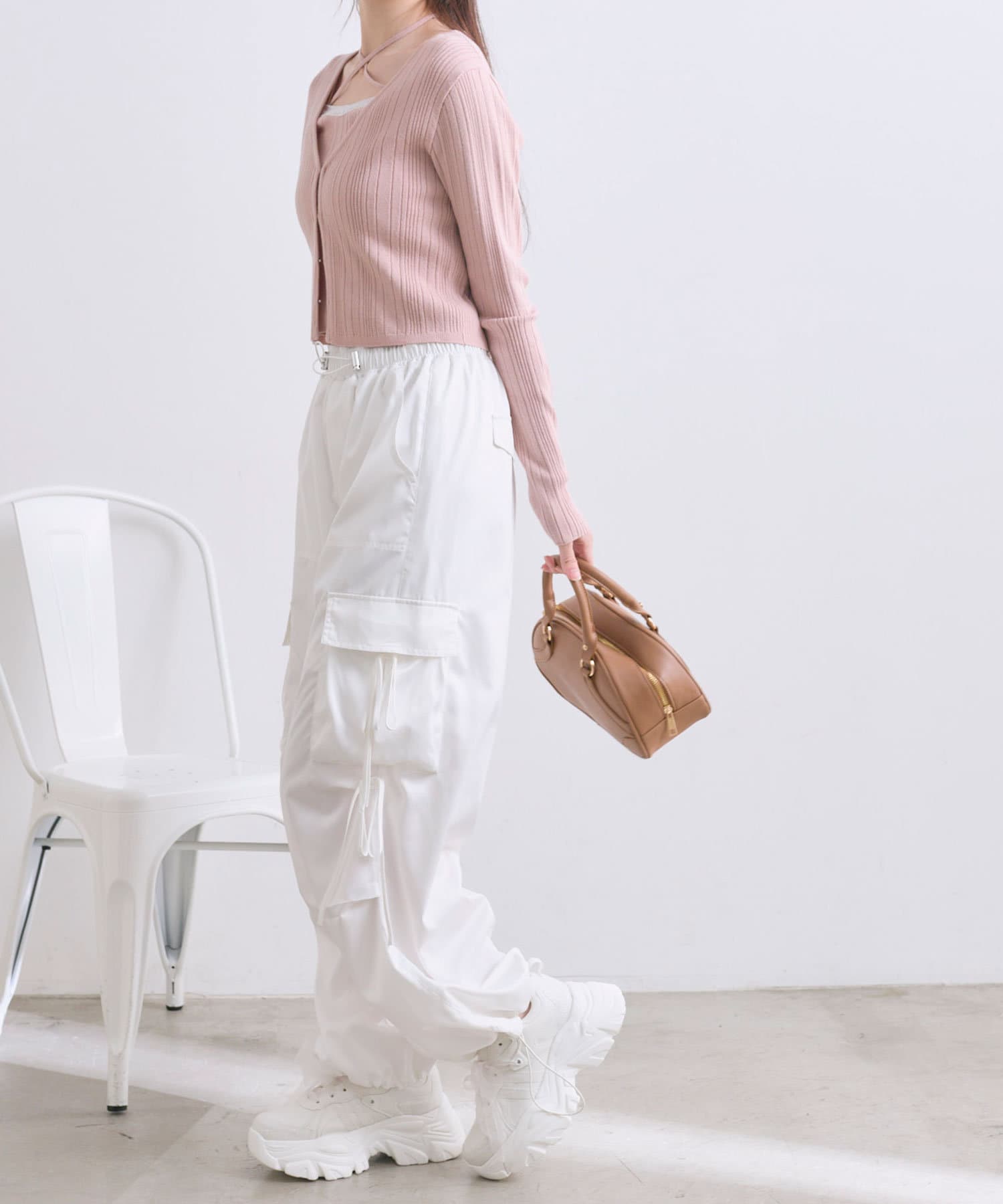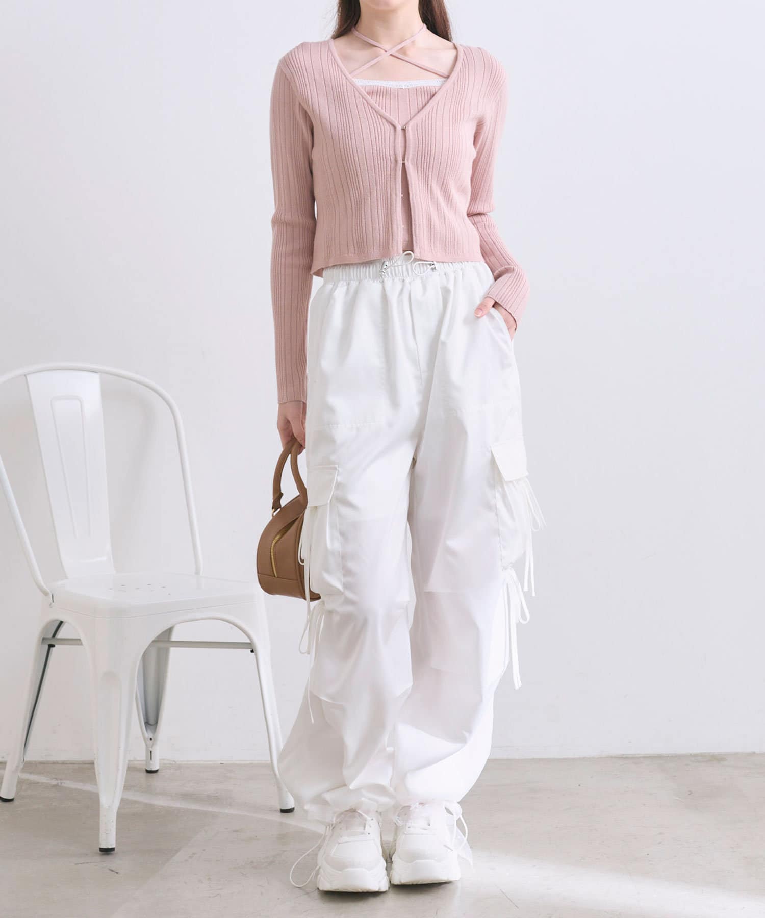 ・カジュアルな印象になりがちなカーゴパンツですが、リボンで可愛らしくコーディネートできます。