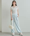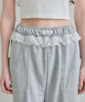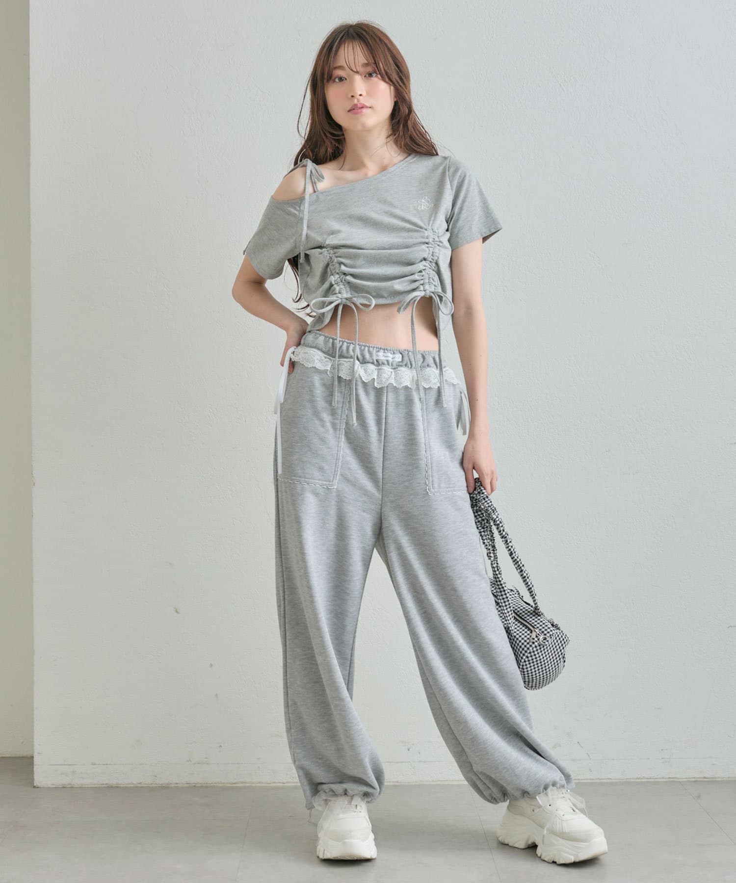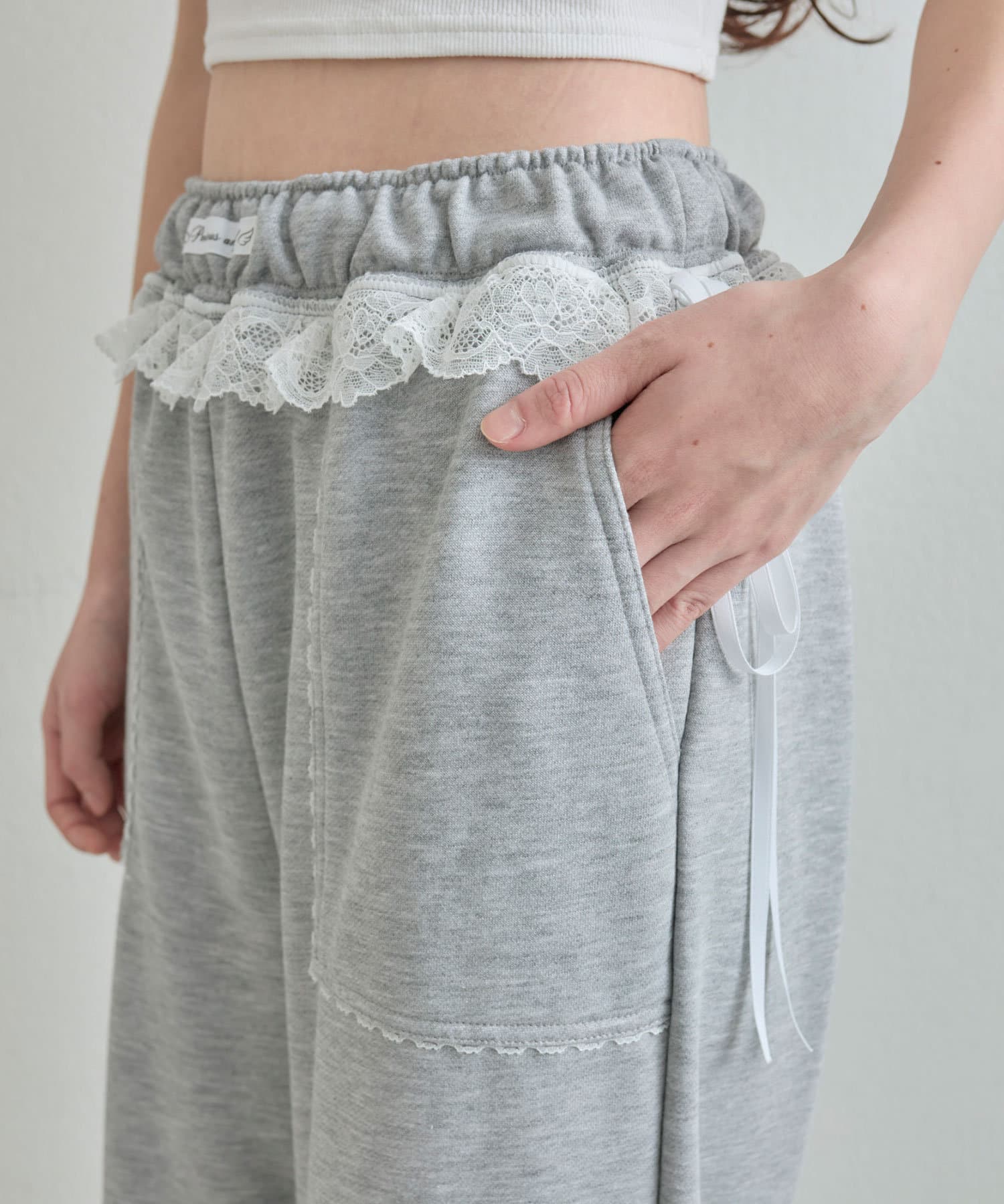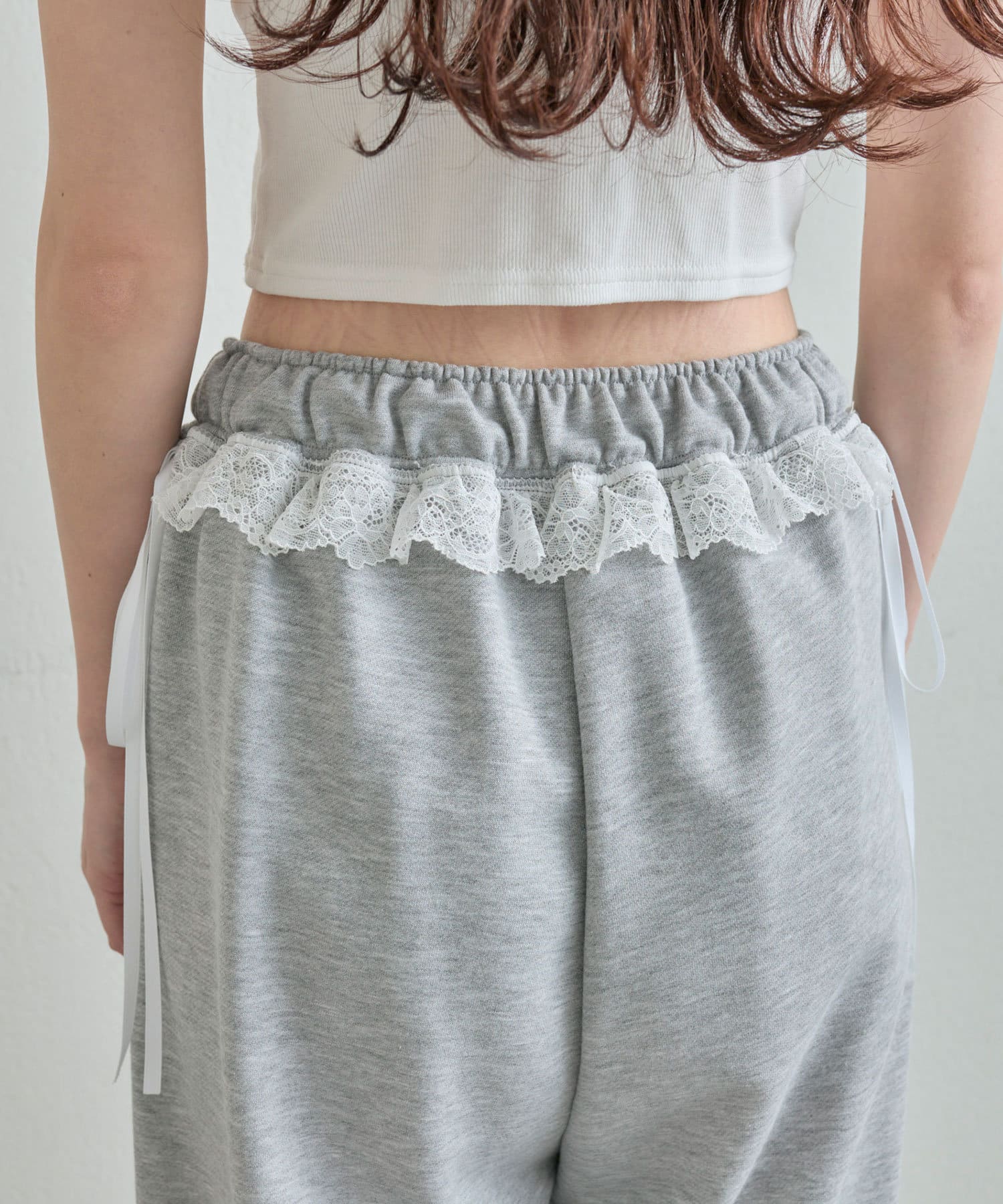 ・白のリボンと繊細なフリル、天使の羽があしらわれたタグが甘さをプラスする、ディティールまでこだわったスウェットパンツ。