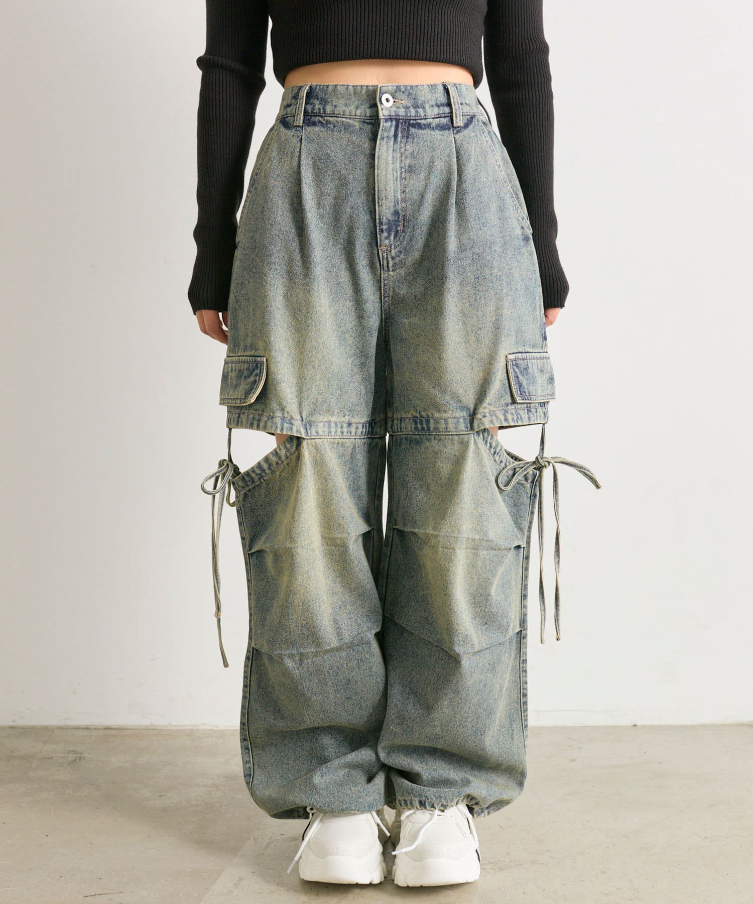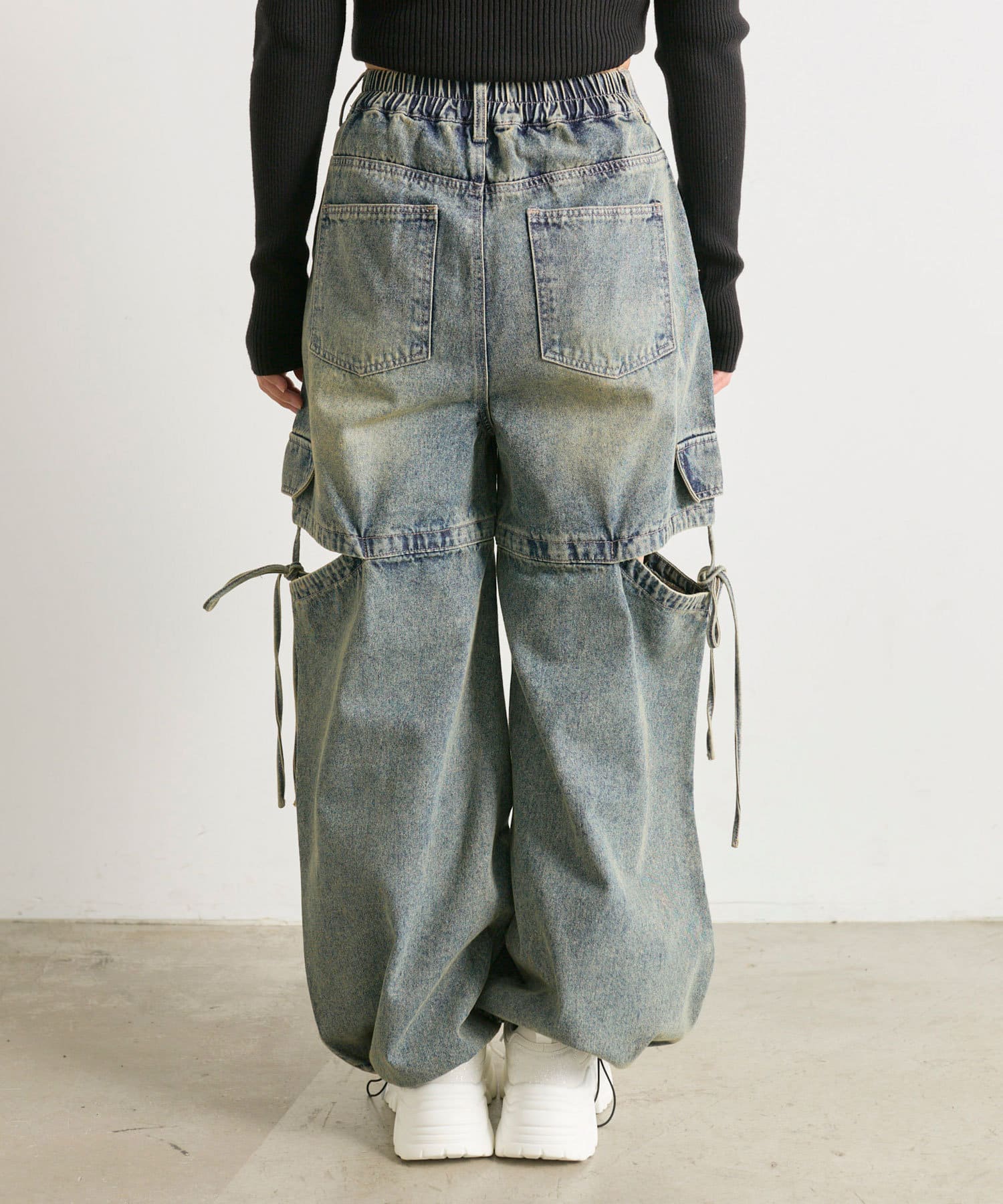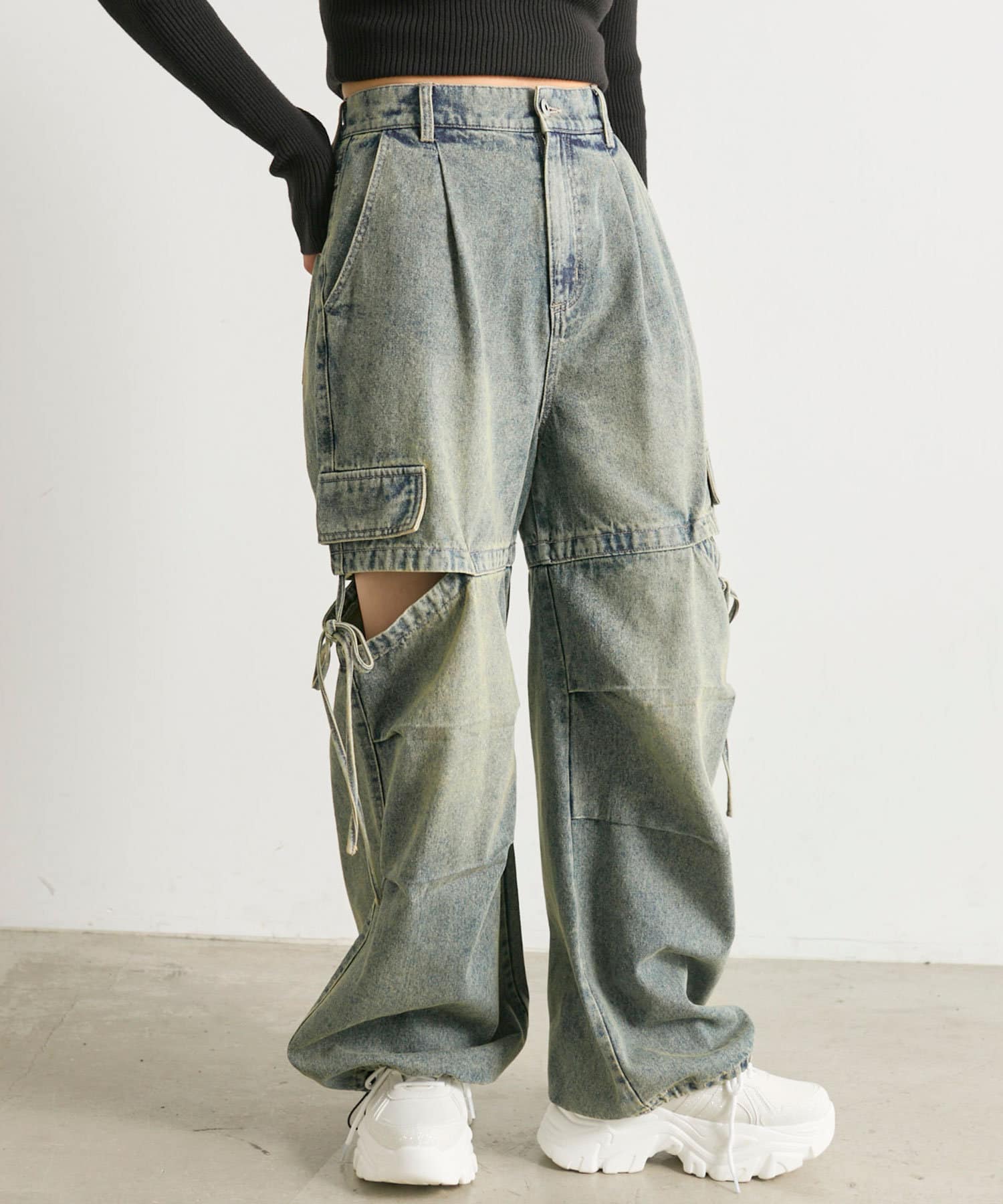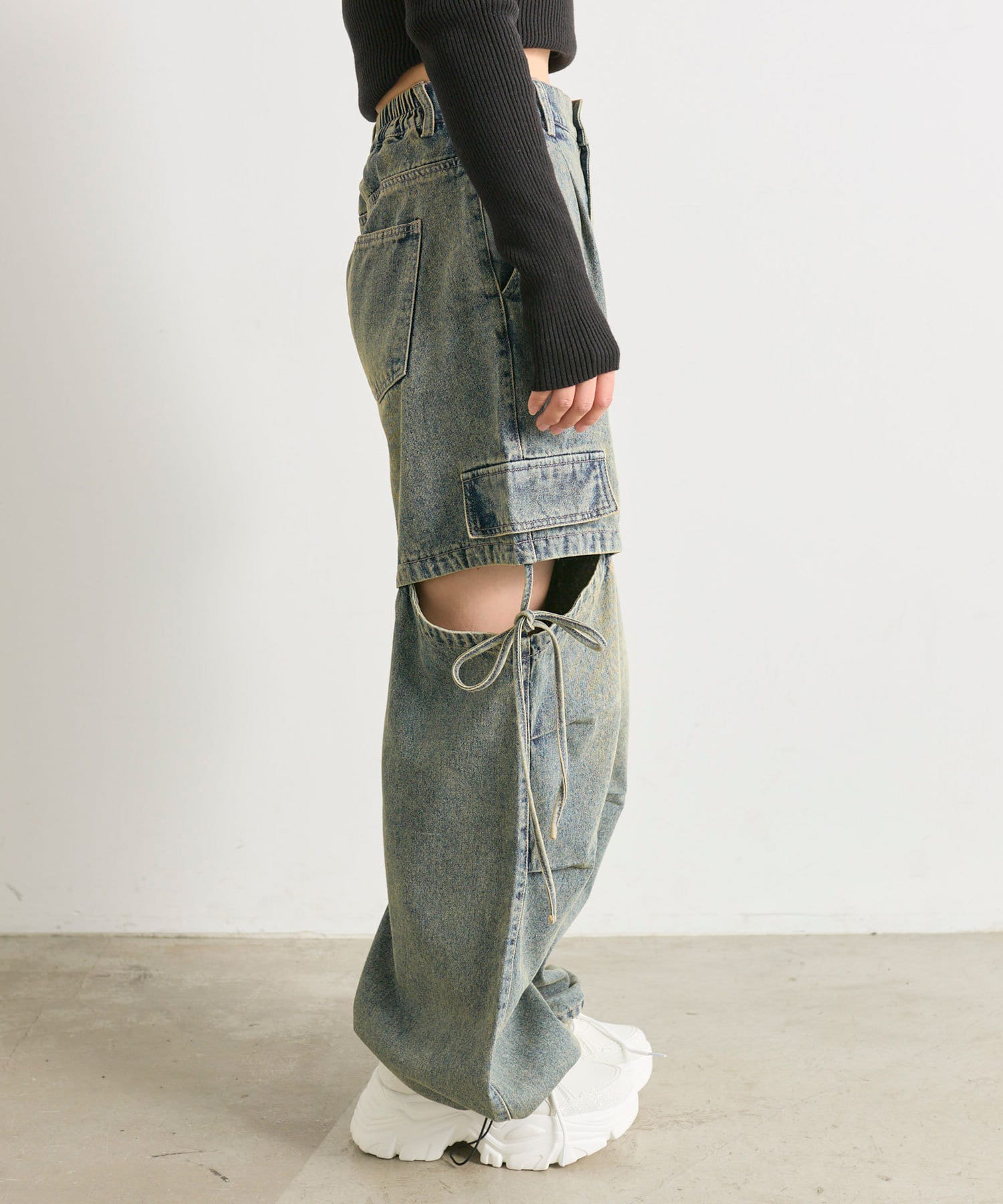 サイドの肌見せがポイントのデニムカーゴパンツ